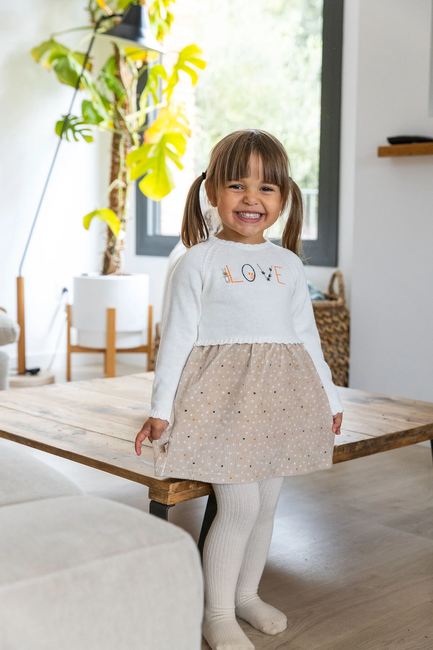 Vestido para bebé em cor creme é ideal para a temporada de outono e inverno graças à sua confeção em tecido suave e quente. Apresenta um corpo em malha de tom creme e uma saia com bolinhas contrastantes que adicionam um toque lúdico, tornando esta peça uma escolha encantadora para eventos especiais ou uso diário. Projetado para bebés de 1 mês a 2 anos, este vestido de manga comprida oferece grande conforto durante os dias frios. A peça é versátil e pode ser facilmente combinada com meias ou collants em tons neutros para completar um look adorável e acolhedor.