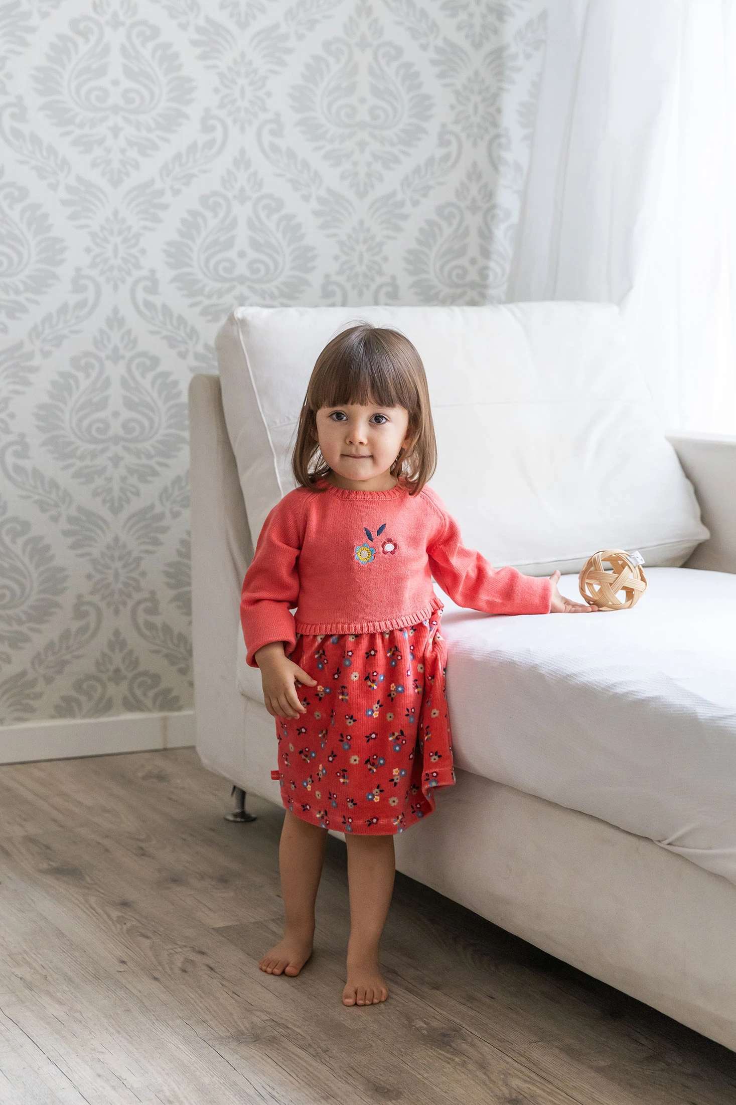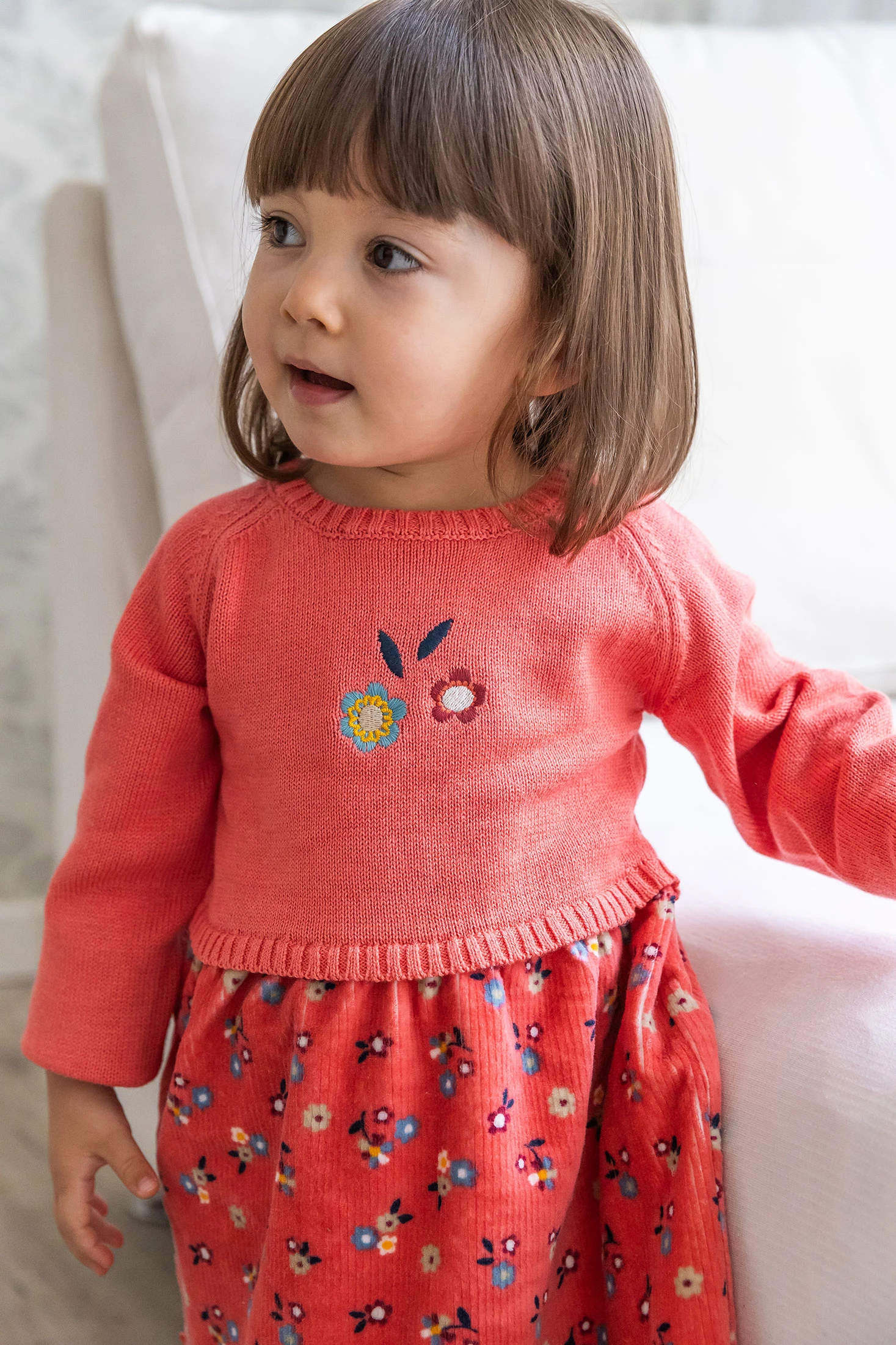Vestido de rosa floral para bebé, ideal para a temporada de outono e inverno graças ao seu tecido quente e suave. Apresenta um delicado estampado floral na parte inferior e um atrativo tom rosa coral, que ressaltam o seu design elegante. Com gola redonda e mangas compridas, garante conforto e calor para a sua pequena. Disponível em tamanhos de 1 mês a 2 anos, adapta-se ao seu crescimento, sendo perfeito para ocasiões especiais ou uso diário, fundindo estilo e praticidade.