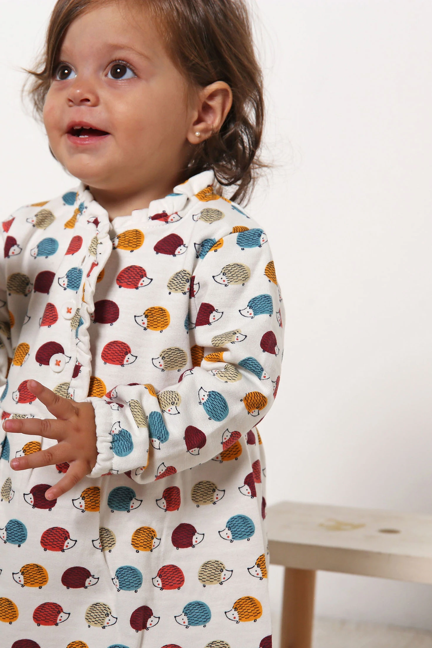Vestido para bebé confecionado em felpa oferece uma textura suave e quente com um encantador estampado de ouriços, perfeito para adicionar um toque de ternura ao guarda-roupa da sua pequena. O design de gola redonda e mangas compridas é ideal para a temporada de outono e inverno, assegurando conforto e calor nos dias mais frios. Disponível em tamanhos desde 1 mês até 24 meses, adapta-se tanto para ocasiões especiais como para o uso diário. Combine-o com collants ou leggings para conseguir um conjunto completo e encantador.
