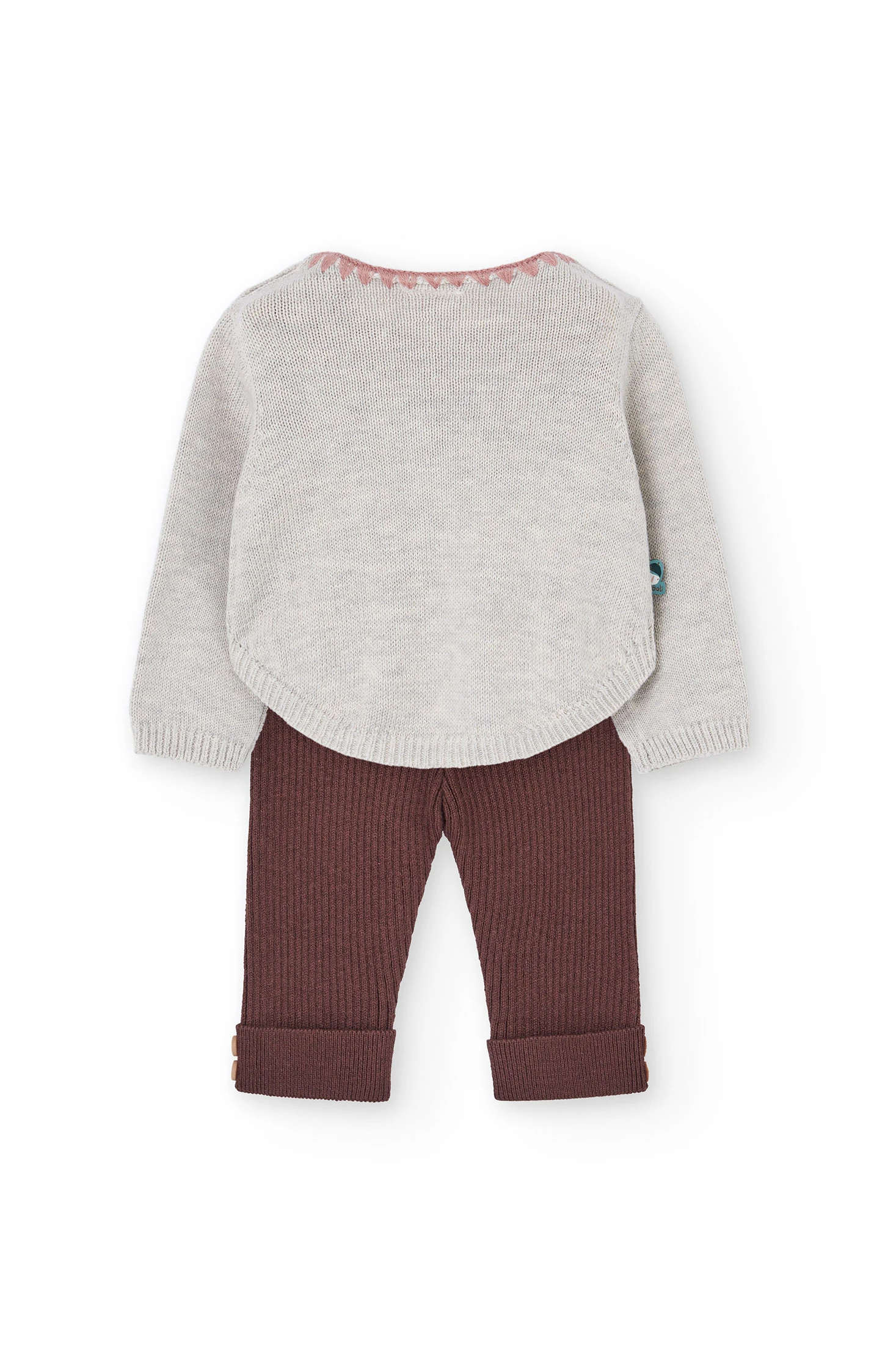 Conjunto de malha estampado em cor bege para bebé menina, ideal para manter a sua pequena quente e confortável durante os meses de outono e inverno. O desenho inclui um camisola com um encantador estampado alegre, gola redonda e botões nos ombros que permitem uma troca de roupa simples. Calças, também em cor castanha, oferecem um acabamento canelado que assegura textura e conforto adicional. Fabricado com materiais suaves e duráveis, este conjunto está disponível em tamanhos de 1 mês a 2 anos e pode ser facilmente combinado com casacos e acessórios para um look completo e adorável.
