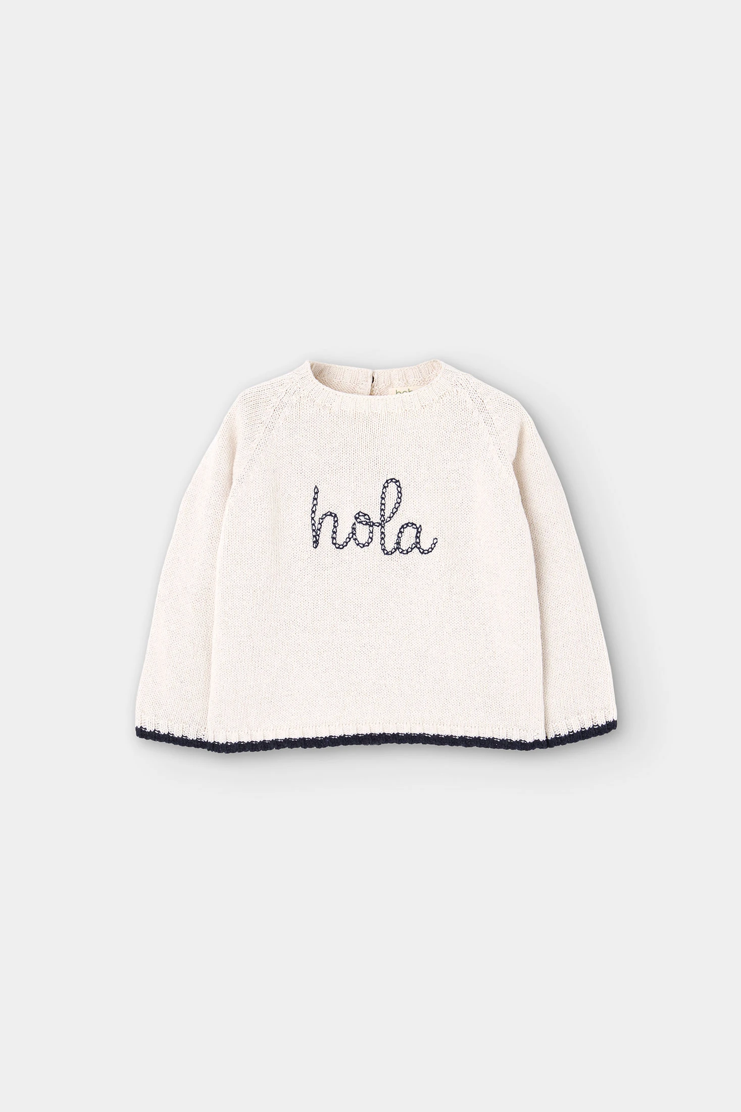 Camisola de malha para bebé na cor branca com estampado de letras. Pertence à cápsula REBORN by Boboli, uma coleção confeccionada com fio 100% reciclado pós-consumo. Confeccionada em tecido macio e respirável, proporciona aquecimento e conforto durante as estações mais frescas. Apresenta gola redonda e botões no ombro que facilitam o vestir. O seu design neutro e moderno combina facilmente com qualquer peça.
