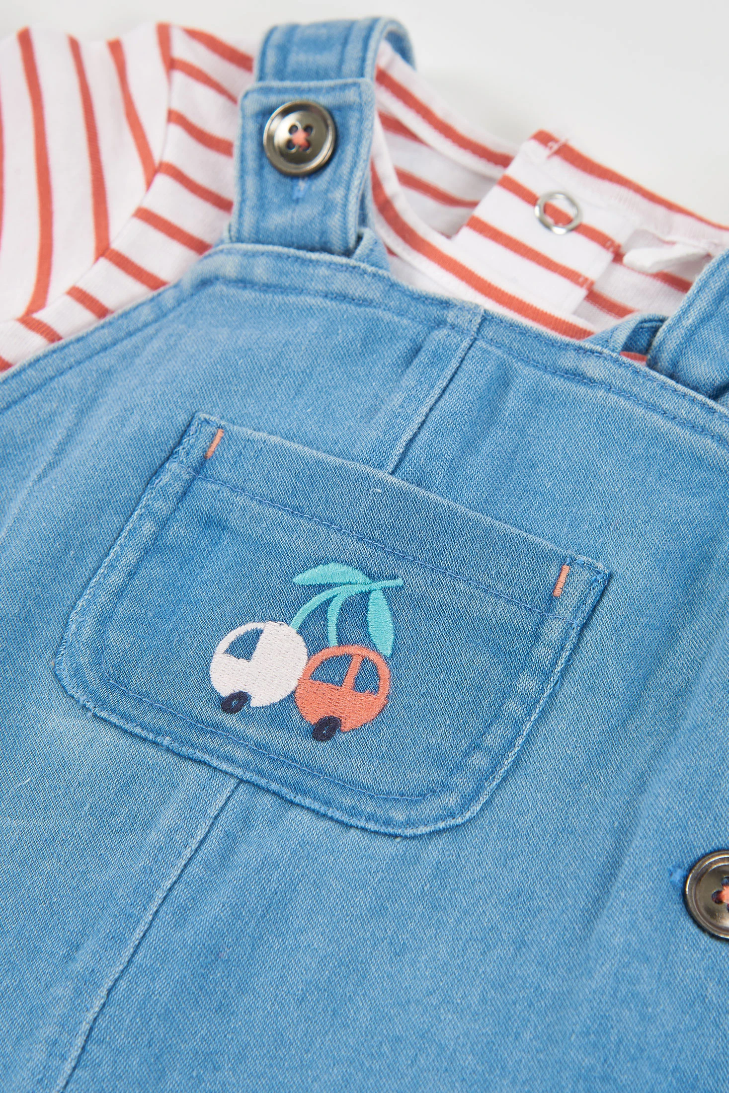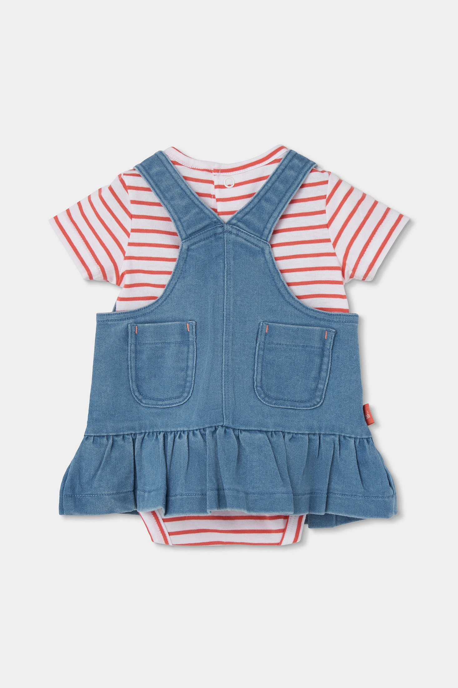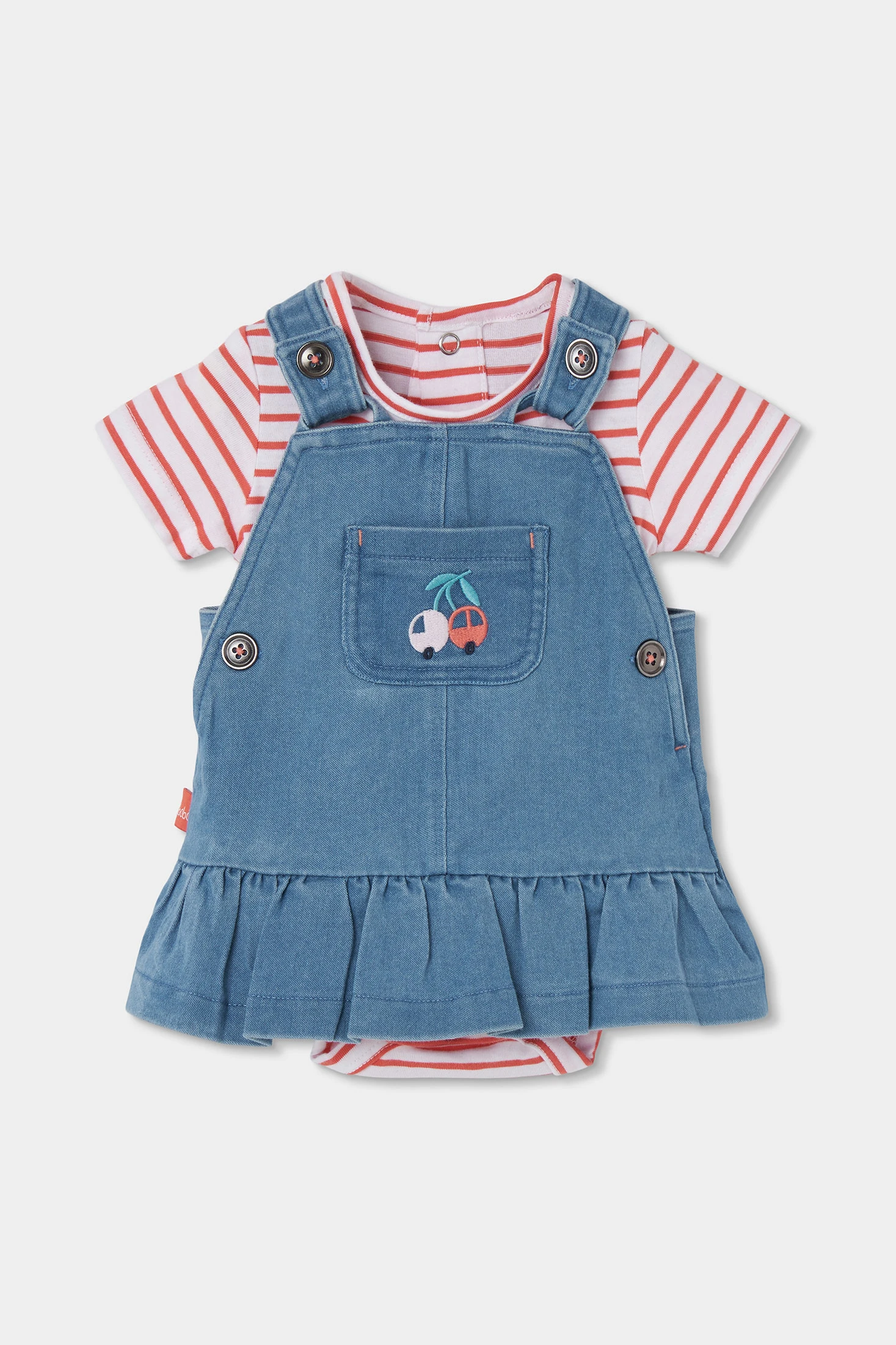 Conjunto para bebé composto por um body às riscas e uma jardineira em ganga com detalhes bordados, perfeito para os dias de verão. O body em algodão macio oferece respirabilidade e conforto, enquanto a jardineira com alças ajustáveis garante um ajuste seguro e confortável. O seu design alegre e veranil é ideal para criar conjuntos cheios de estilo e ternura, acompanhando o bebé em todos os momentos do dia.
