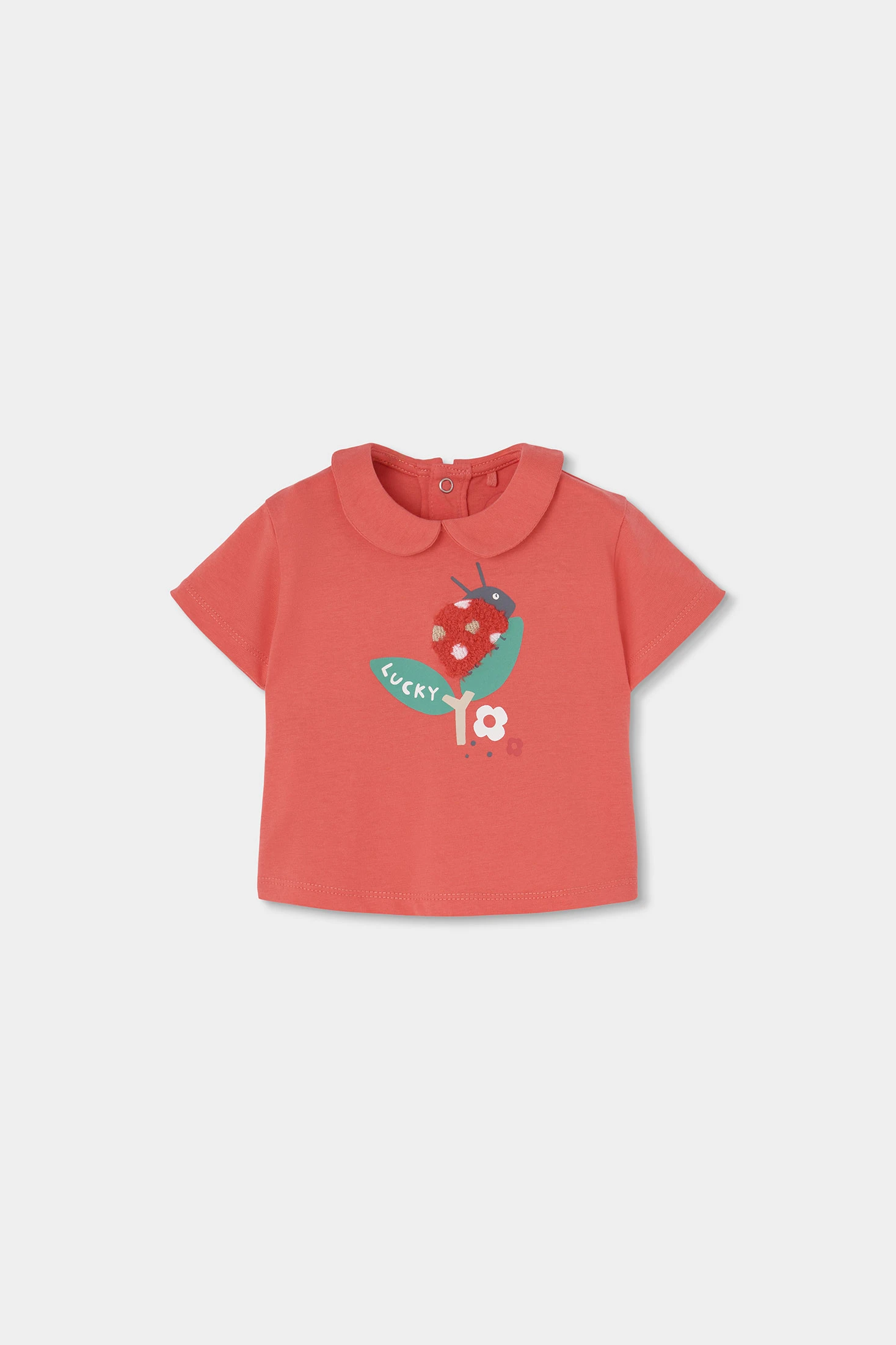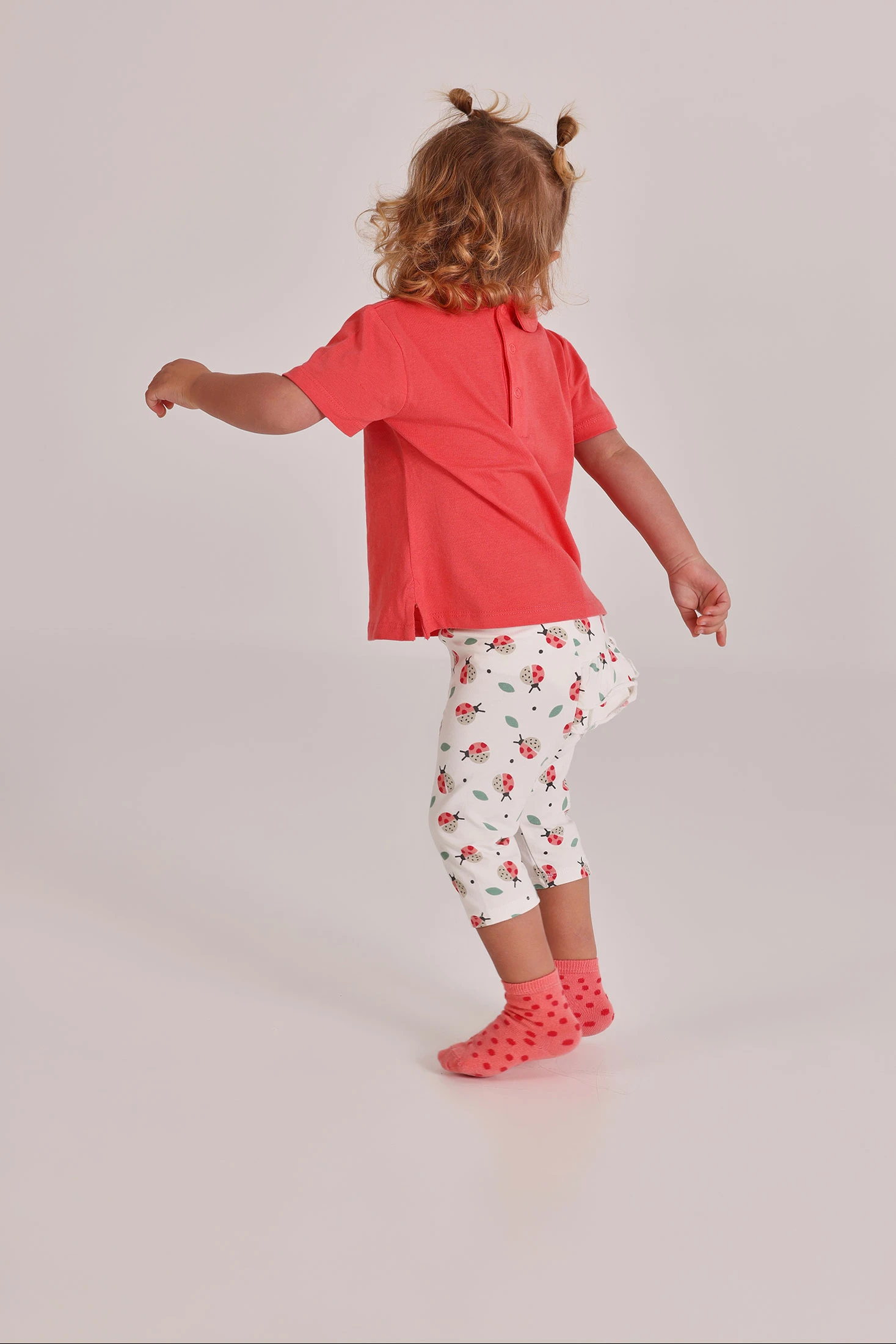 Conjunto de malha de algodão e algodão elástico para bebé menina. Disponível em tamanhos desde 1 mês até 24 meses. Composto por uma camisola em cor avermelhada de manga curta, com molas nas costas que facilitam a troca. Disponível em tamanhos de 0 meses até 24 meses, adaptando-se ao crescimento do bebé, com uma decoração de joaninha divertida e leggings corsários em fundo branco com estampado de joaninhas, perfeito para um estilo doce e alegre. A suave malha de algodão oferece conforto e facilidade de movimento.