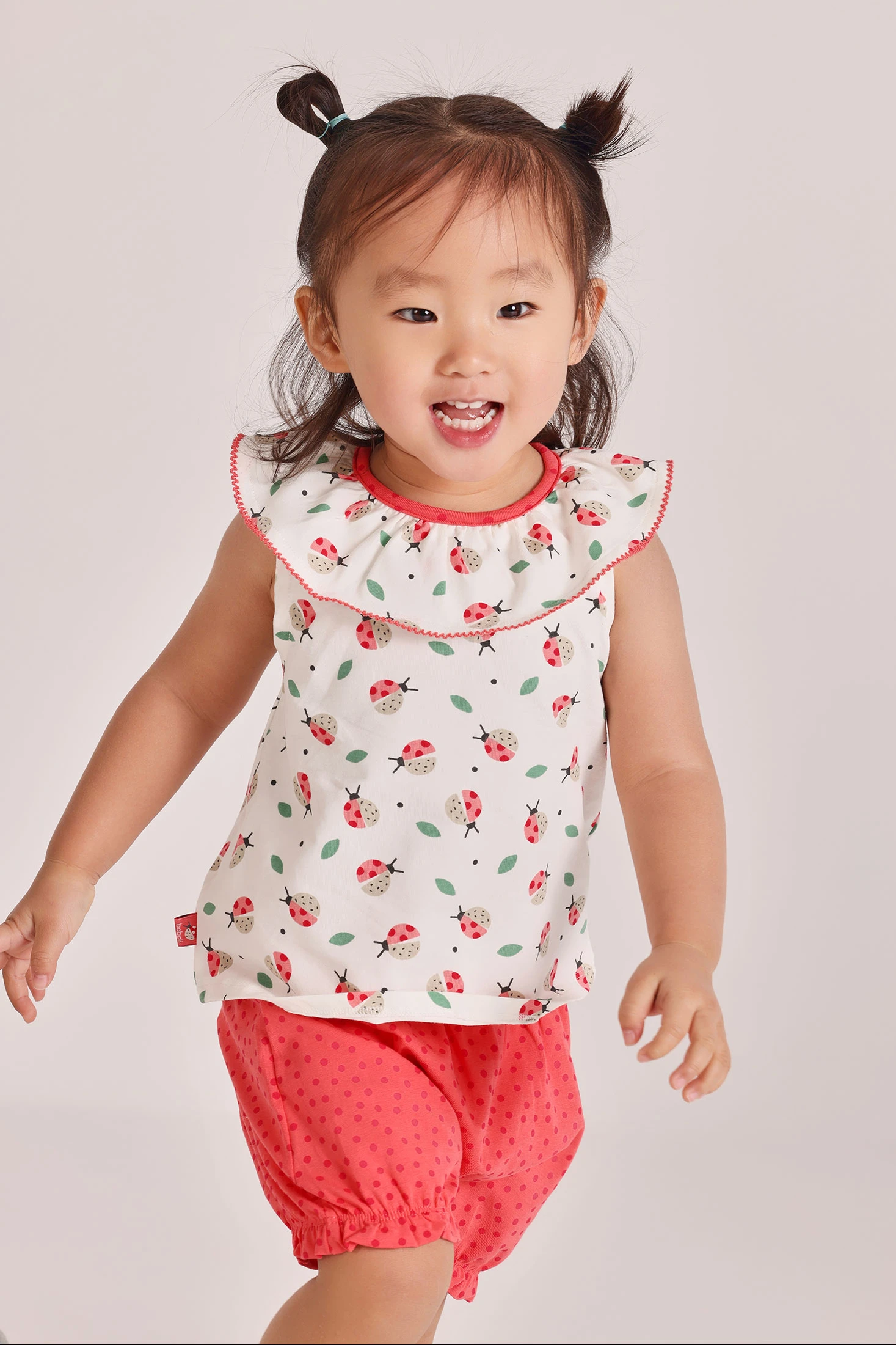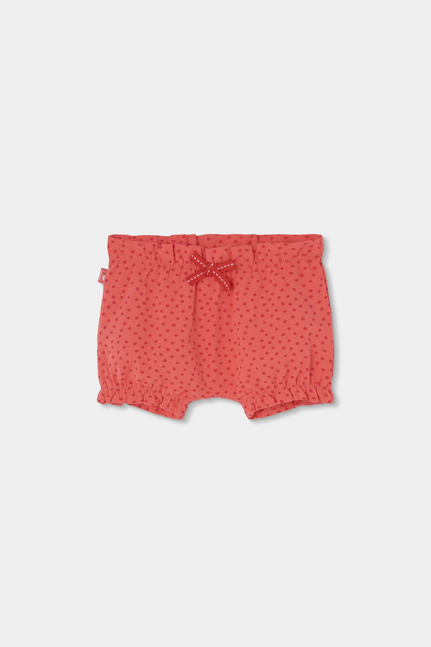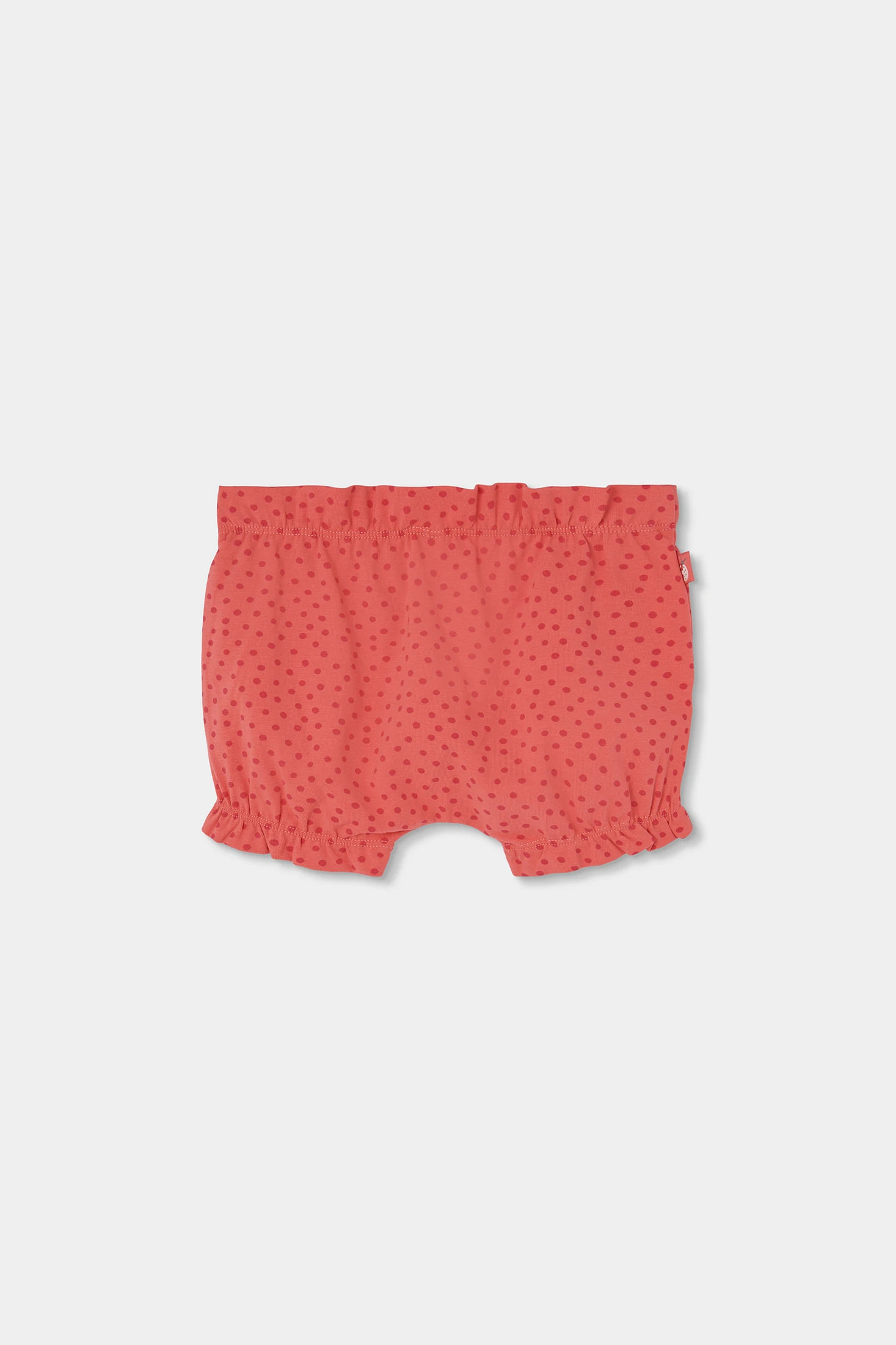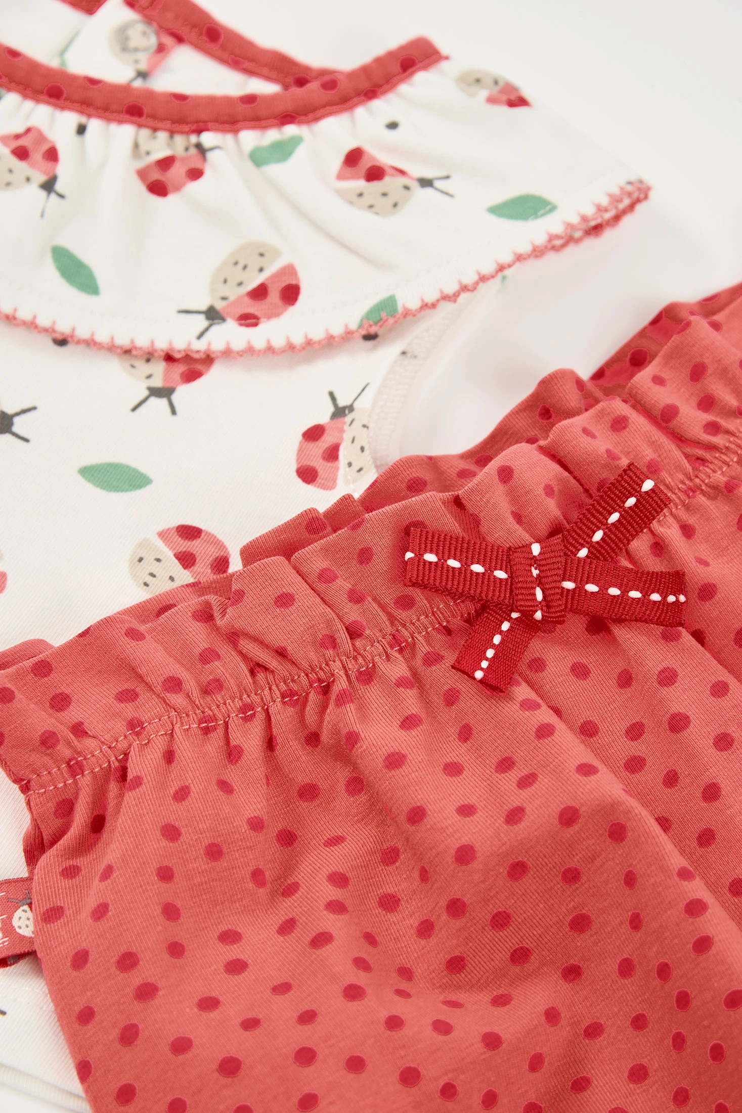 Conjunto de algodão elástico para bebé menina, ideal para as mais pequenas. Disponível em tamanhos de 1 mês até 24 meses. O conjunto inclui uma blusa de gola redonda com folhos, com um estampado de simpáticas joaninhas e folhas, proporcionando um toque divertido. As calças são curtas com um design bufante e elástico na cintura e nas pernas para um ajuste perfeito. São de cor avermelhada com um estampado de bolinhas e um laço decorativo na cintura.
