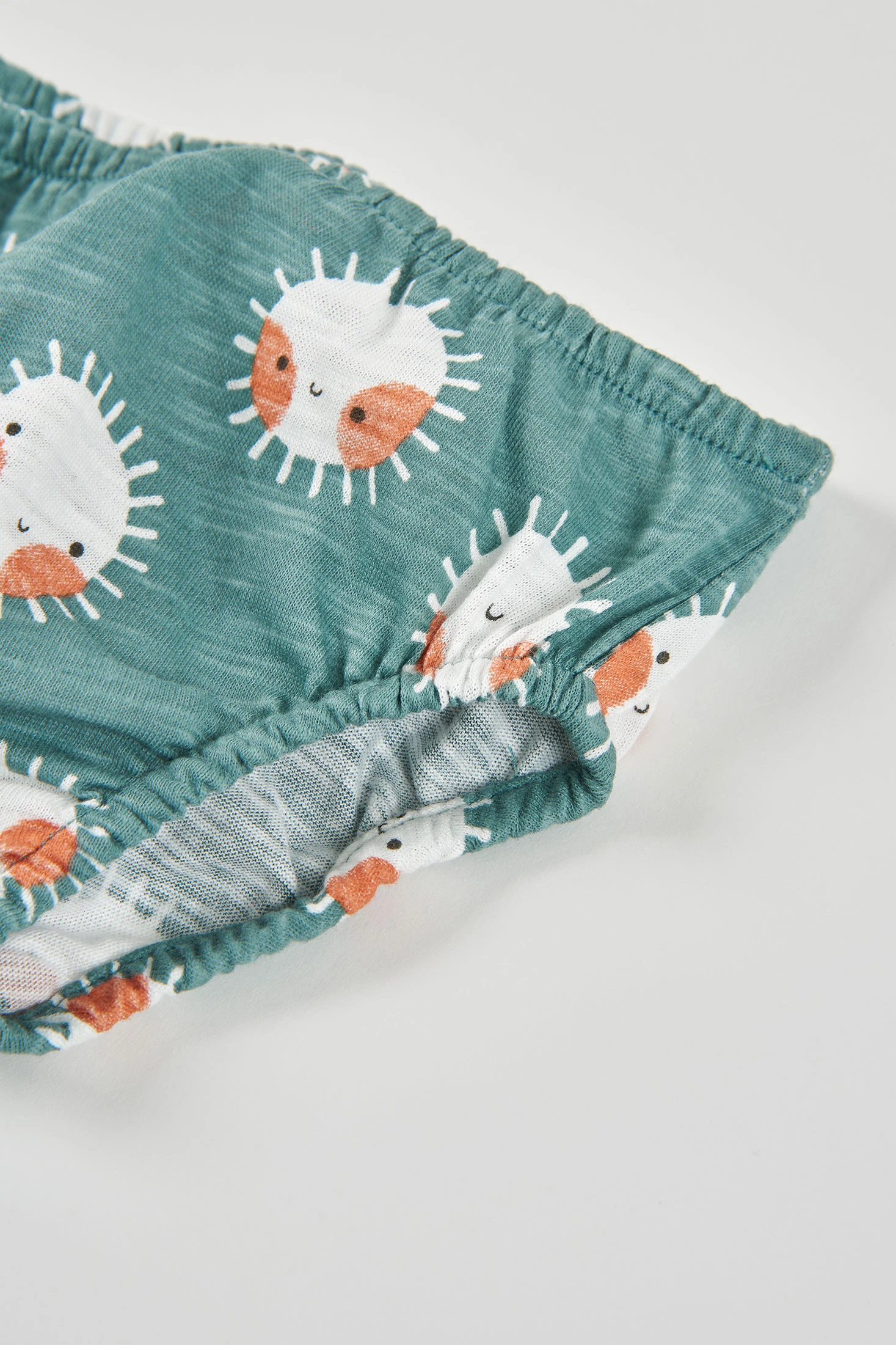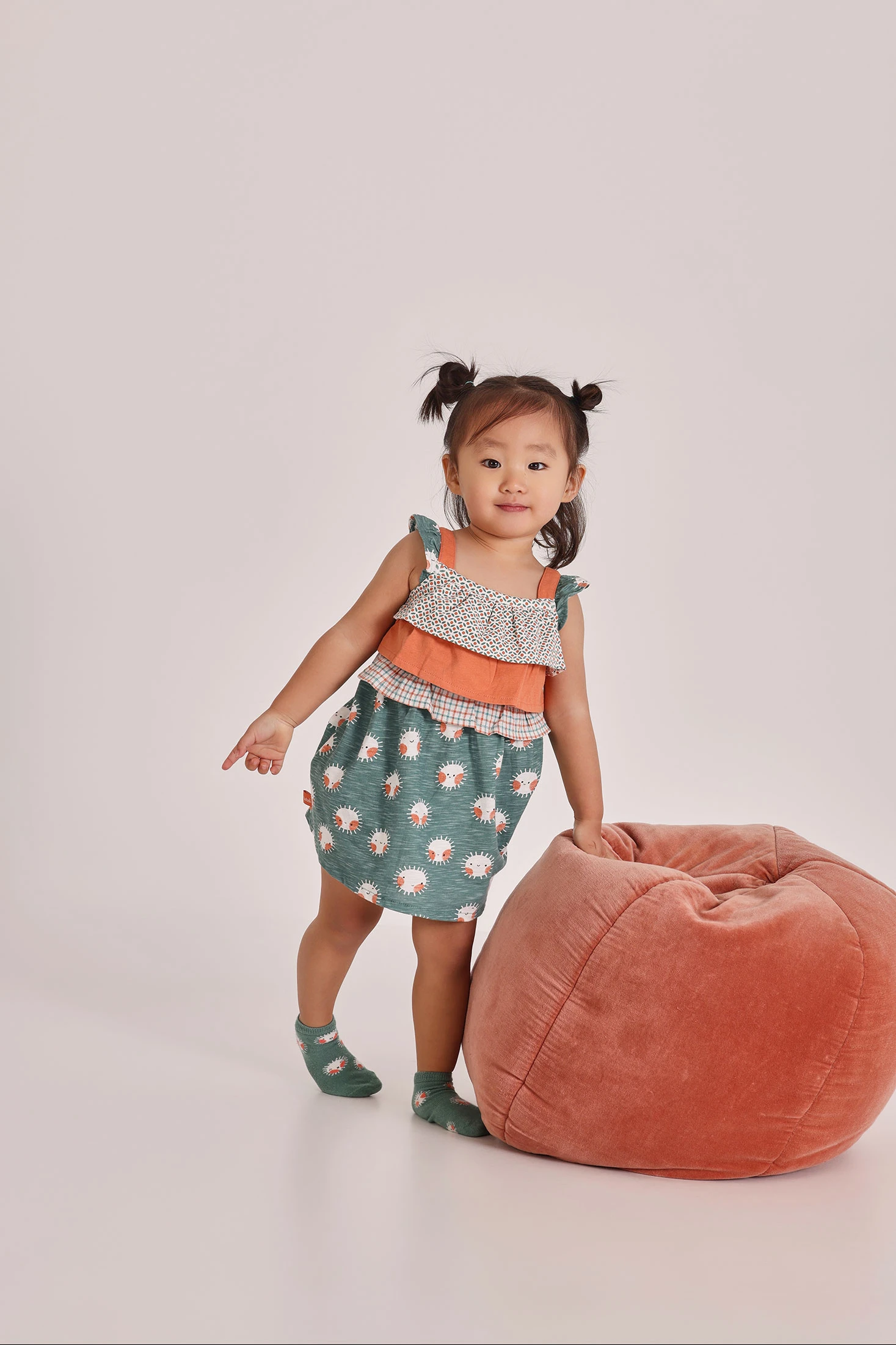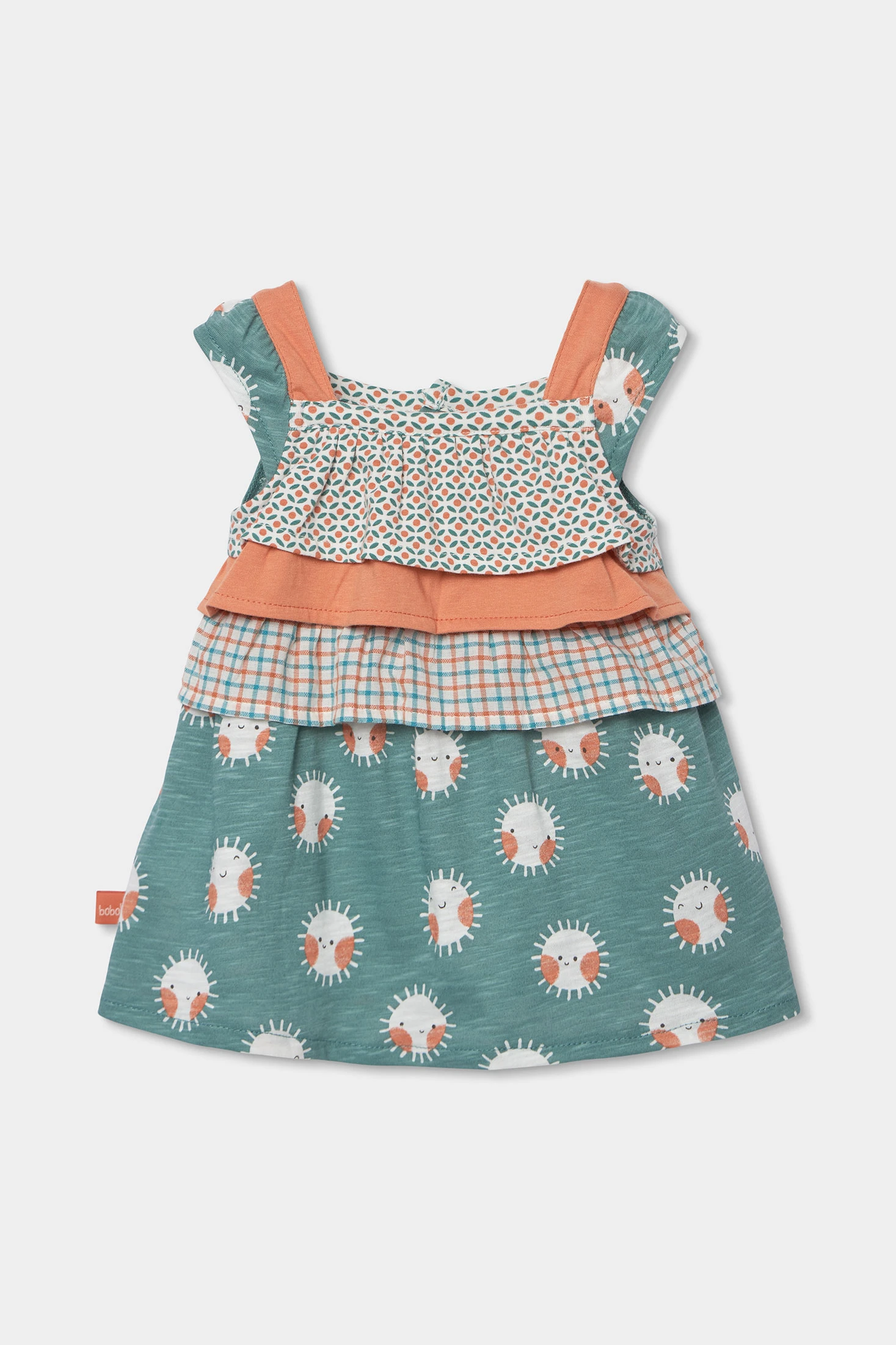 Vestido combinado em diferentes tecidos de alças e com cuequinha a conjunto para bebé menina, perfeito para as mais pequenas, disponível em tamanhos desde 1 mês até 24 meses. O seu tecido de malha oferece suavidade e conforto, com fecho de botões nas costas. Apresenta um design encantador, combinando estampado de sóis em fundo verde aturquesado, quadrados e estampado geométrico. É uma peça versátil adequada para qualquer ocasião, mantendo a sua bebé com estilo enquanto lhe oferece liberdade de movimento e calor.