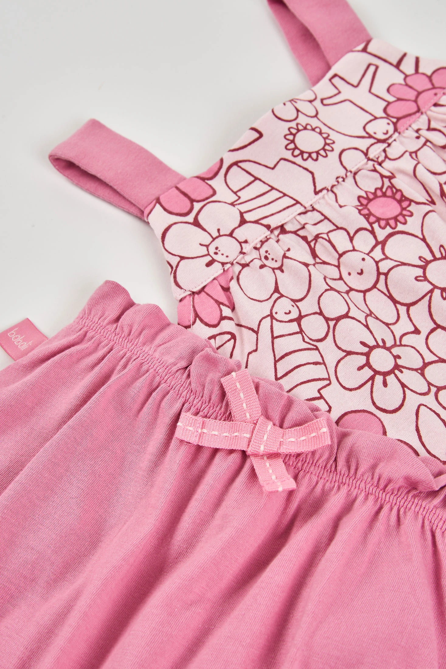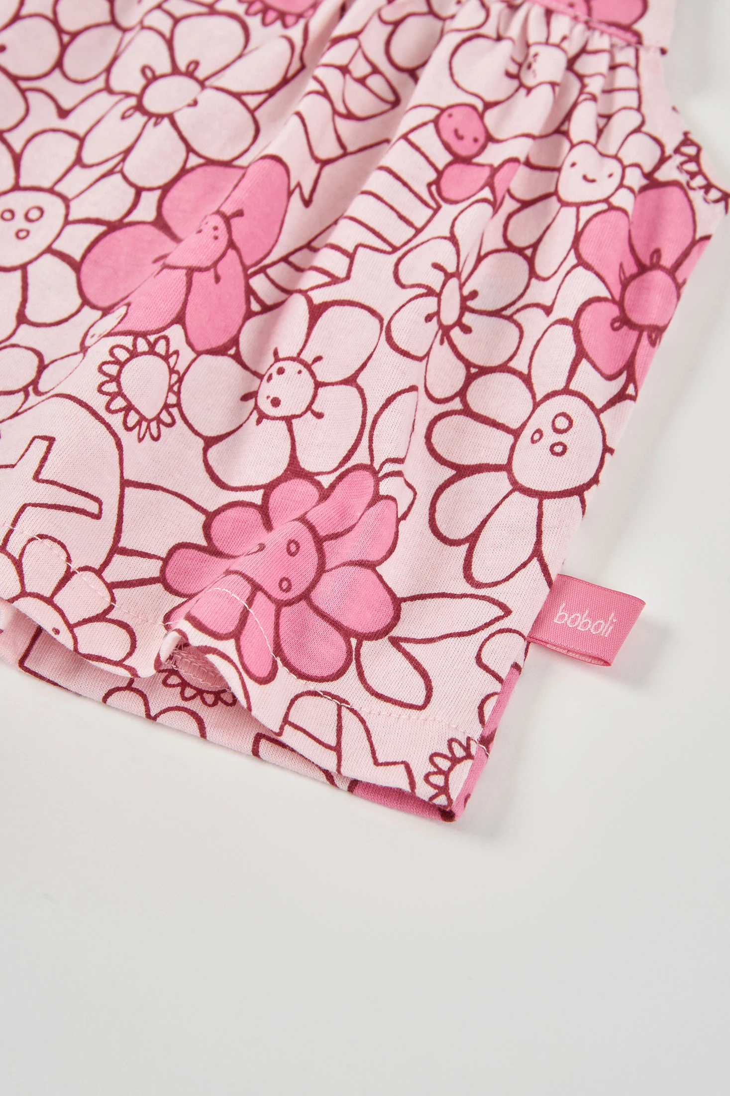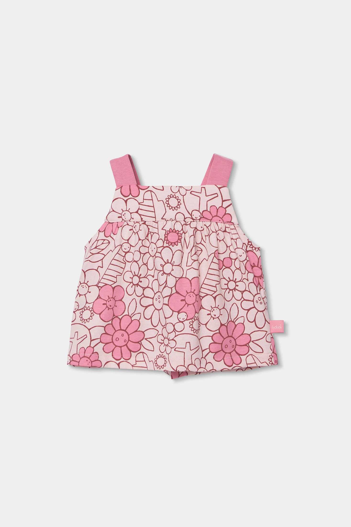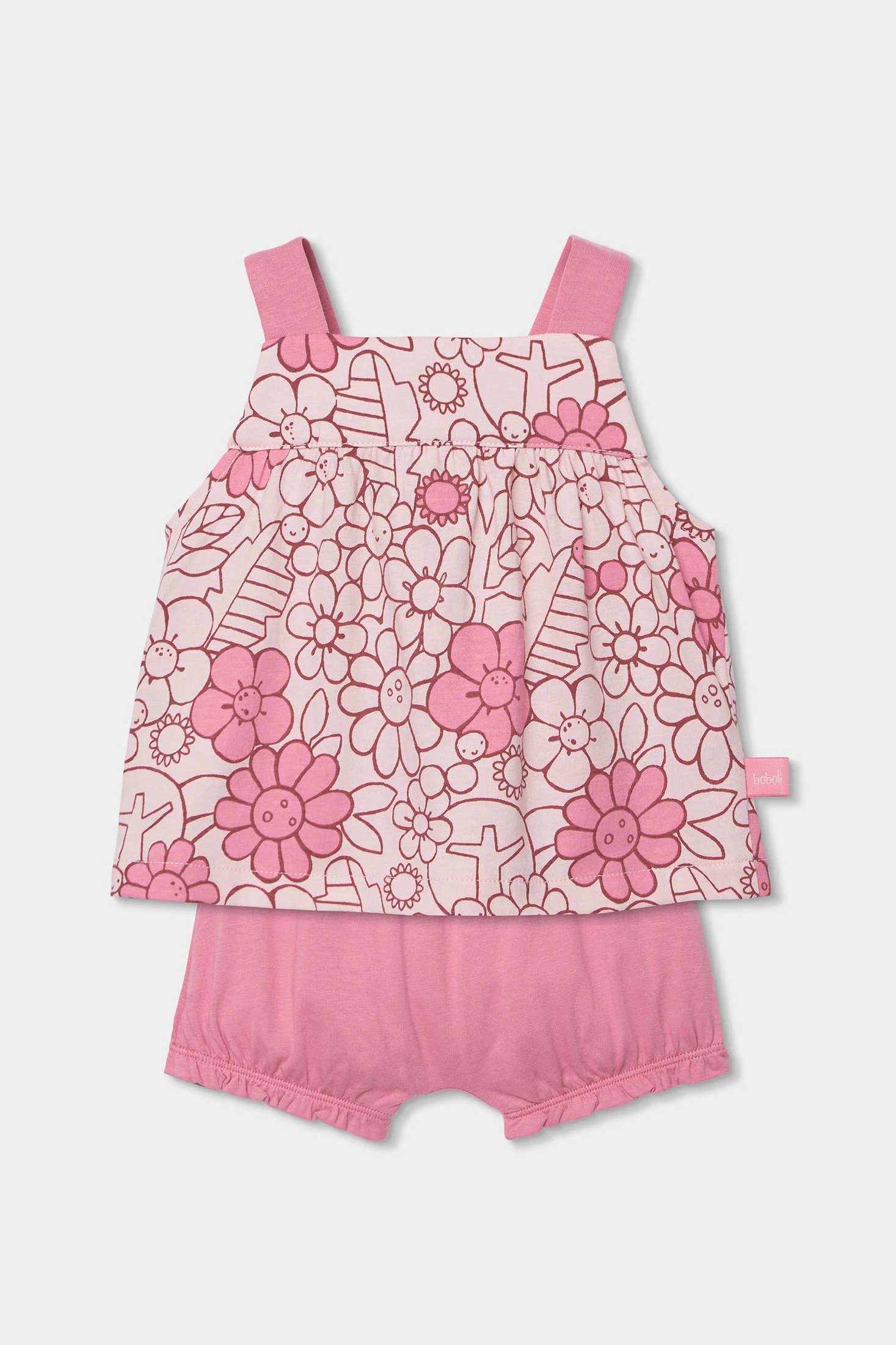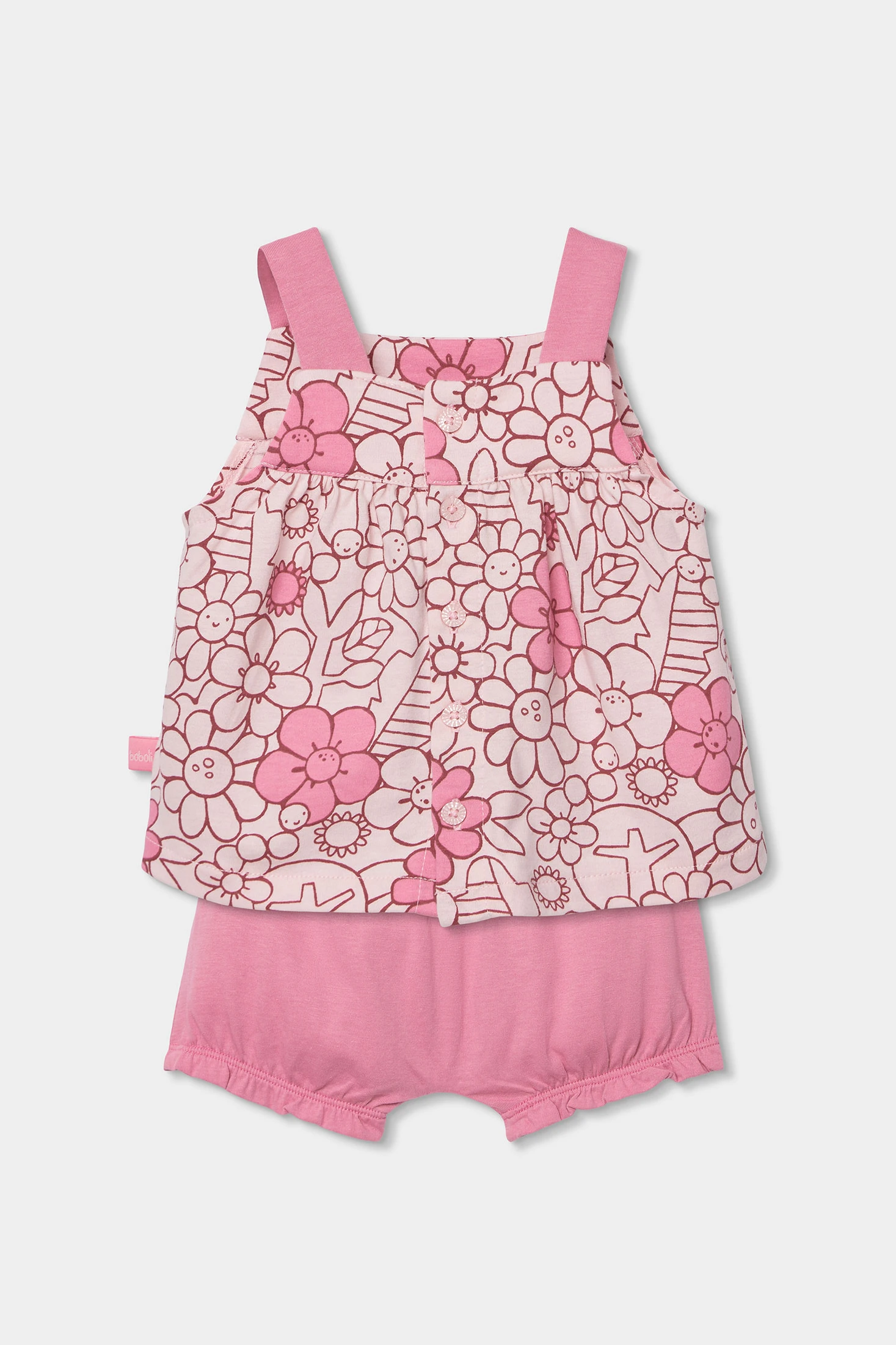 Conjunto de malha para bebé menina, com um encantador estampado de flores em tons rosa, ideal para destacar a doçura dos mais pequenos. Confeccionado num tecido suave e confortável, perfeito para a pele delicada dos recém-nascidos. Desenhado para se adaptar ao crescimento, está disponível em tamanhos desde 1 mês até 24 meses. Blusa sem mangas com alças largas e calção com cintura elástica tornam-no uma opção prática e estilosa. Conjunto ideal para um look fresco e confortável nos dias mais quentes.