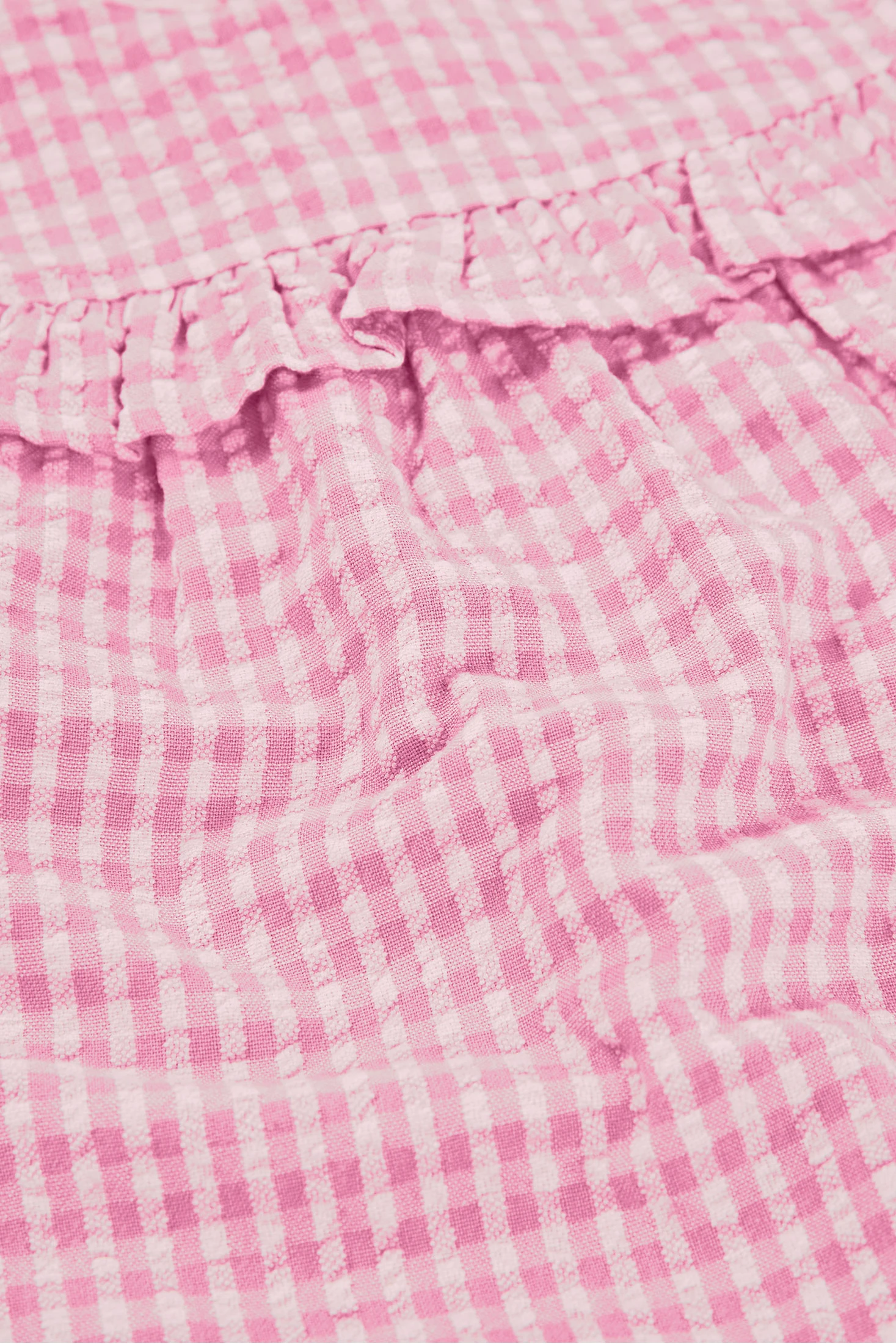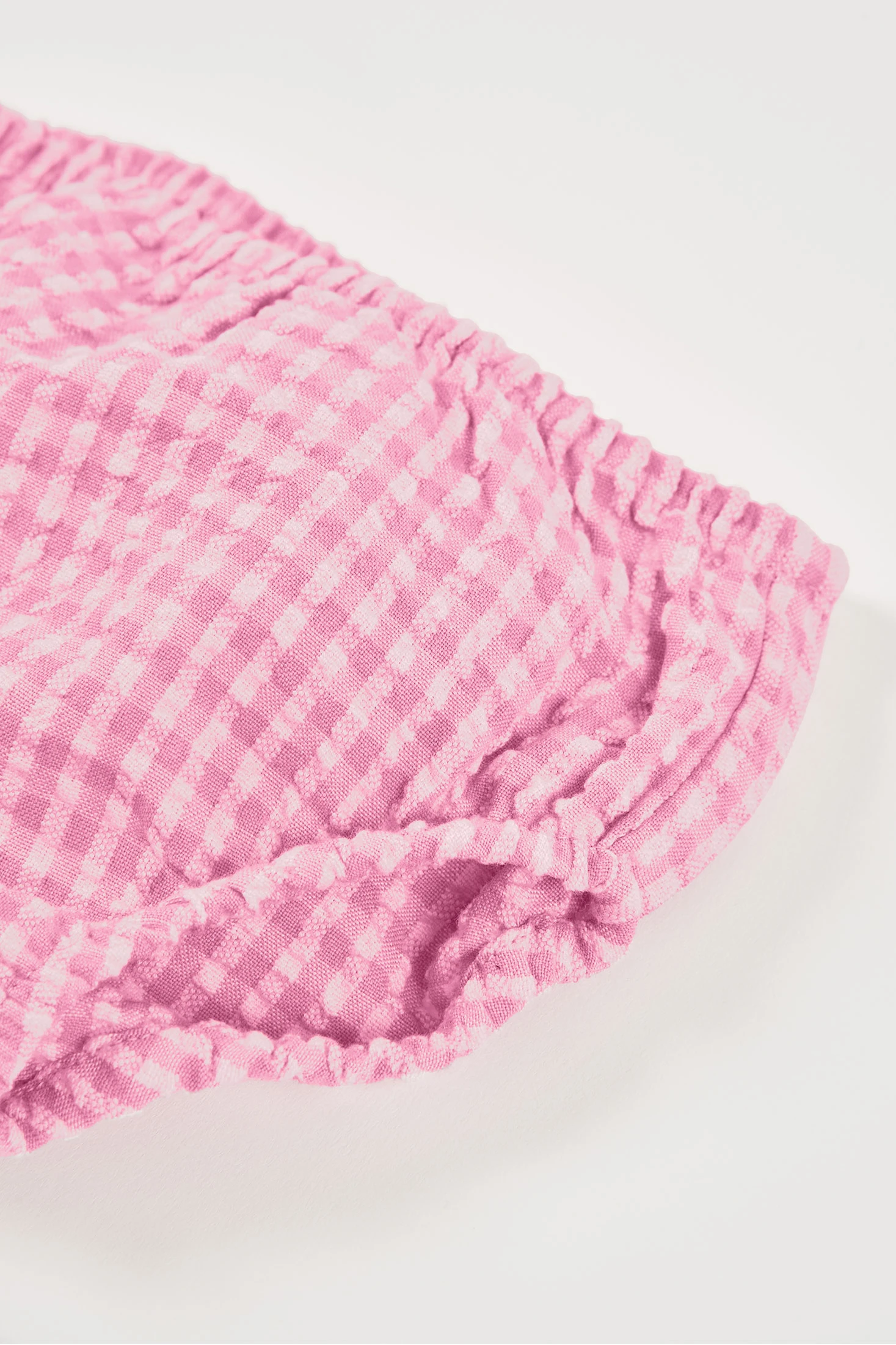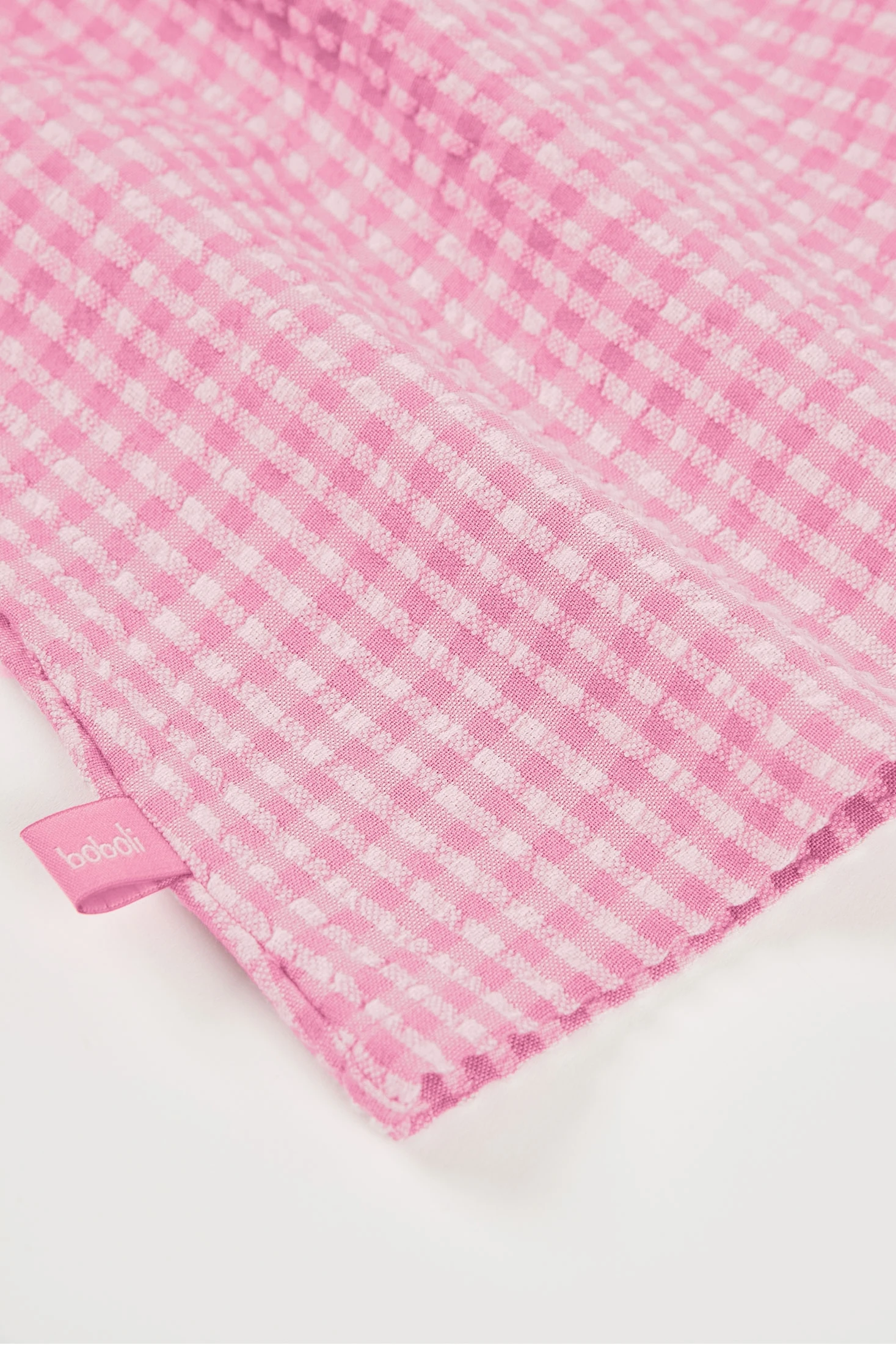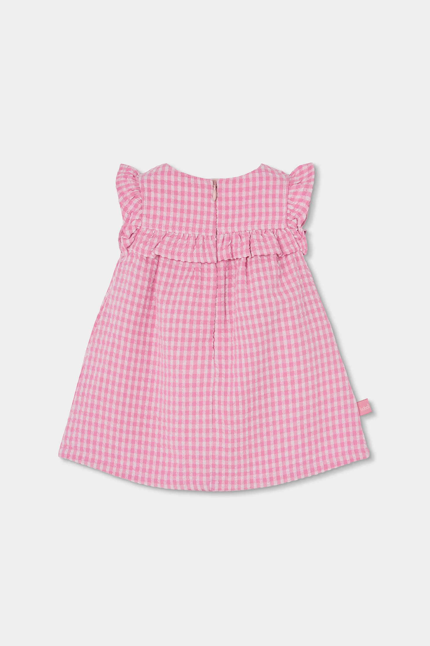 Vestido de popelina de quadrados para recém-nascidas, perfeito para qualquer ocasião especial. O seu tecido de popelina dá-lhe um toque clássico e elegante, enquanto o padrão de quadrados tecido vichy em tons de rosa lhe confere um ar doce. O design inclui delicados folhos nos ombros e canesú. Funcional e confortável para bebés de 1 a 24 meses. Ideal para combinar com casacos suaves em dias frescos, este vestido oferece estilo e conforto, tornando-se uma opção ideal para o guarda-roupa da sua pequena.