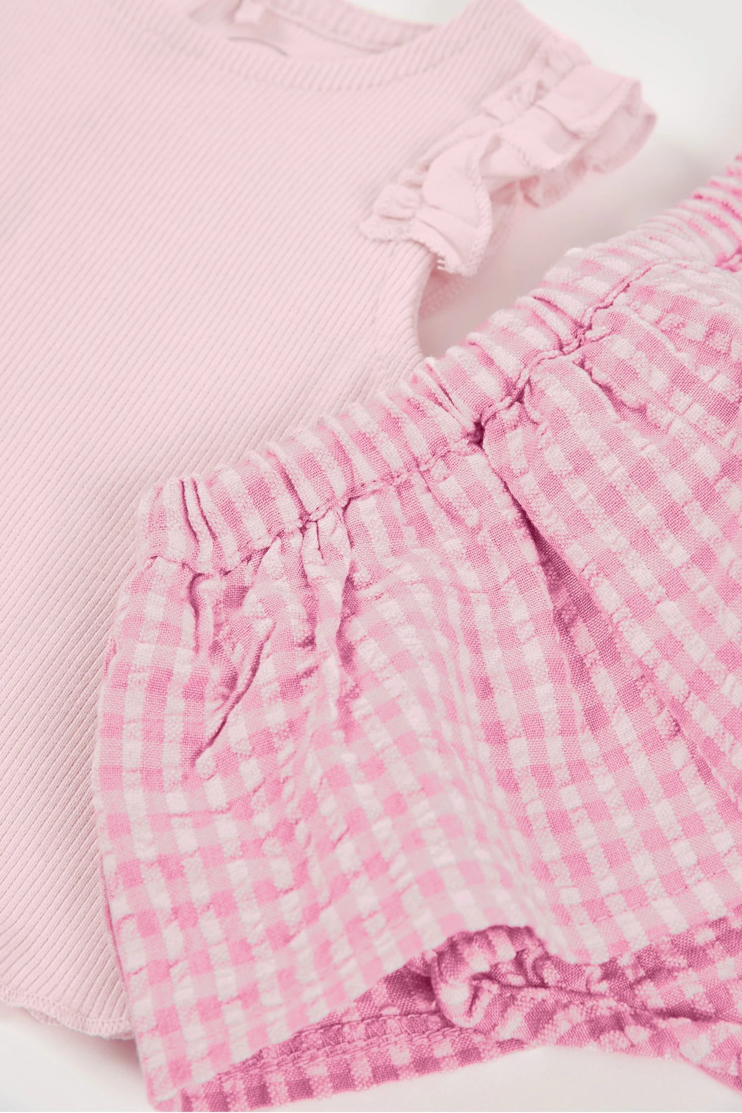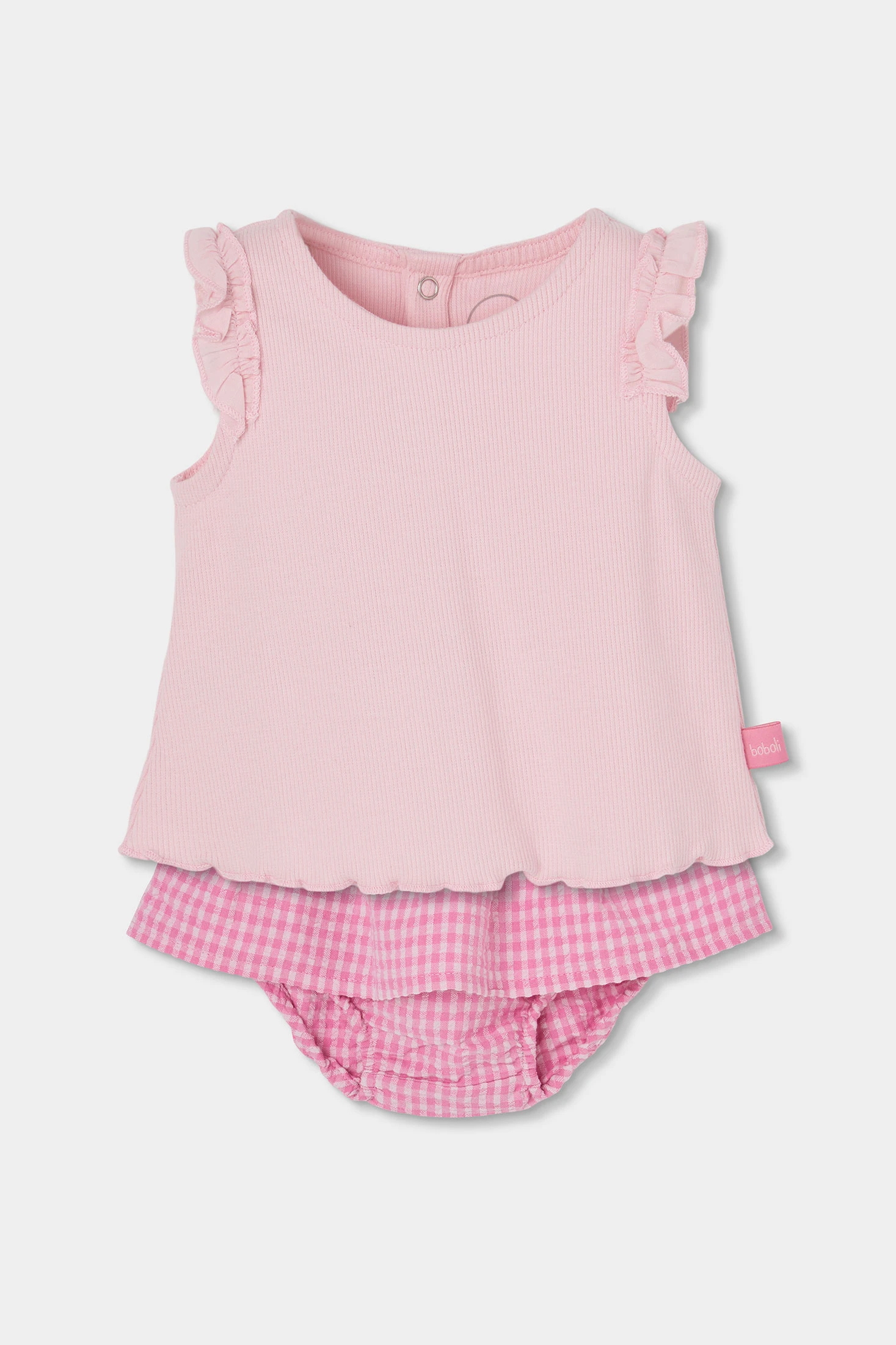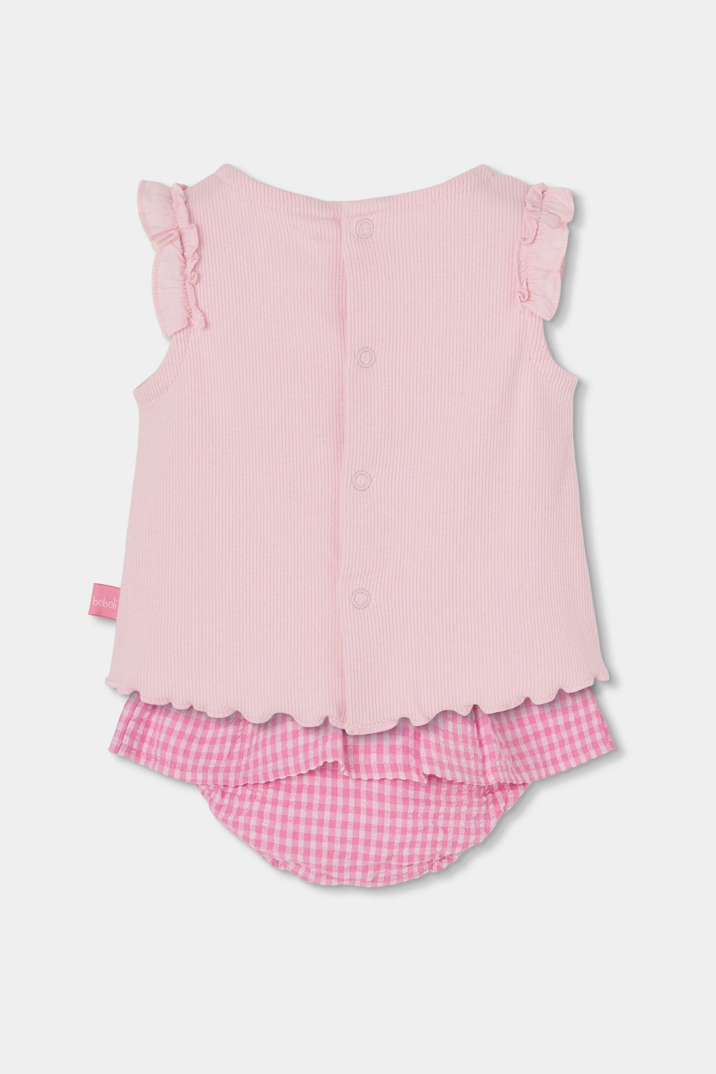 Conjunto de bebé em algodão rosa perfeito para as mais pequenas. Desenhado para idades desde 1 mês até 24 meses. Oferece conforto e suavidade graças ao seu material de alta qualidade. Apresenta uma camisola sem mangas com folhos nos ombros, na cor rosa, e uns calções de popelina de quadros tecidos em tons de rosa, acrescentando um toque encantador e fresco. Ideal para qualquer ocasião, este conjunto assegura estilo e bem-estar durante os meses mais quentes.