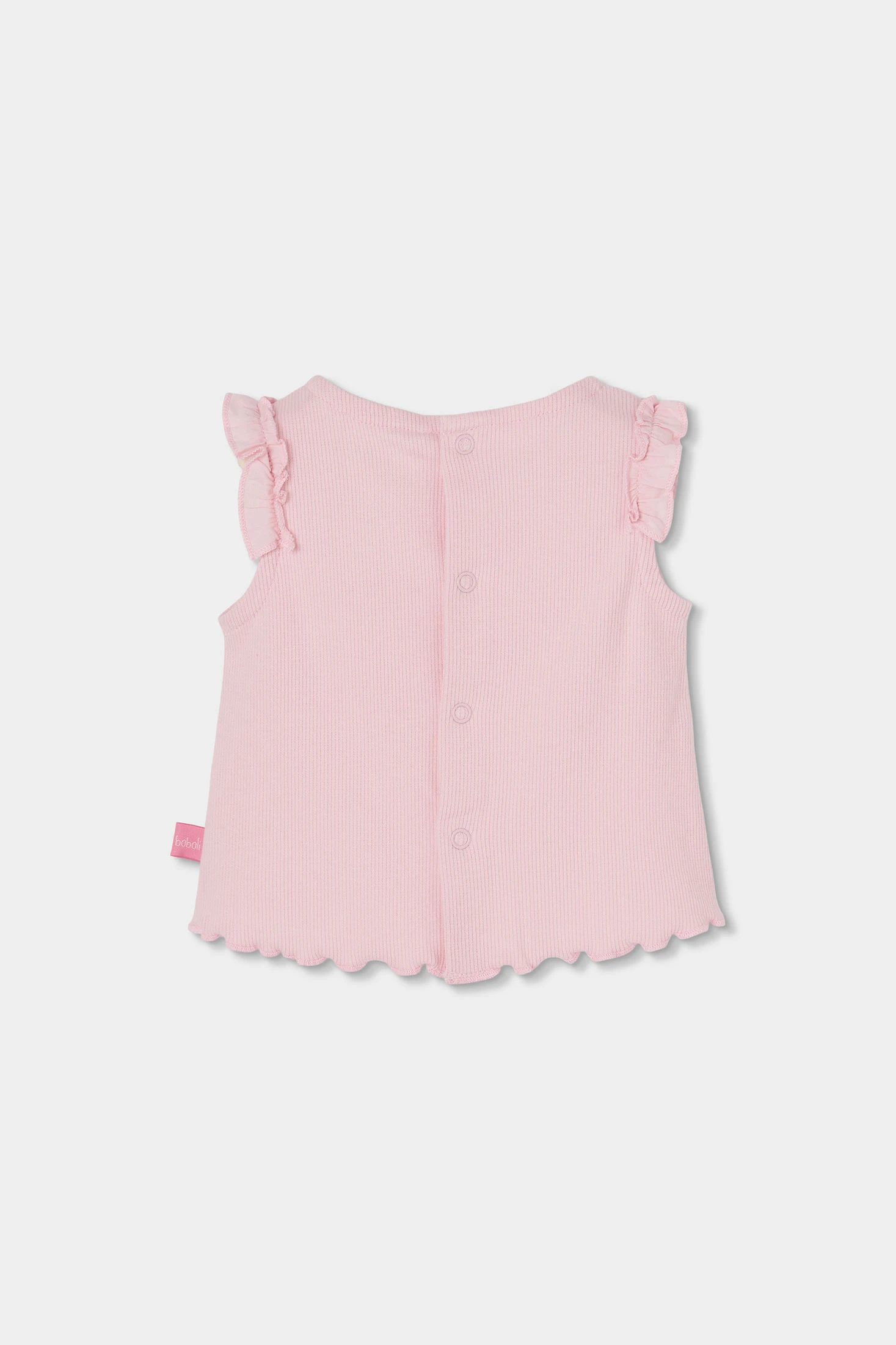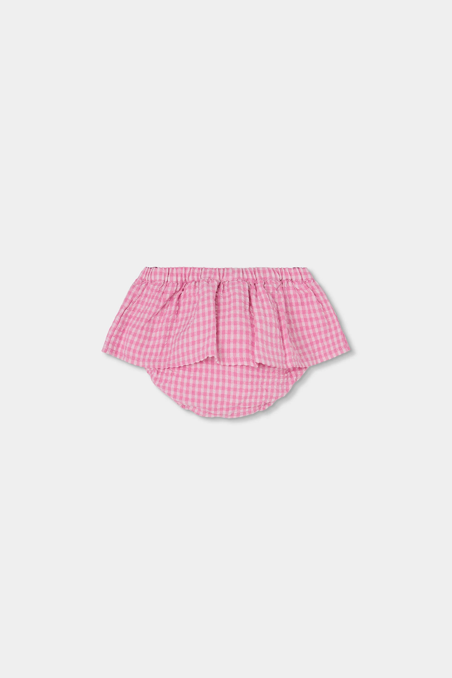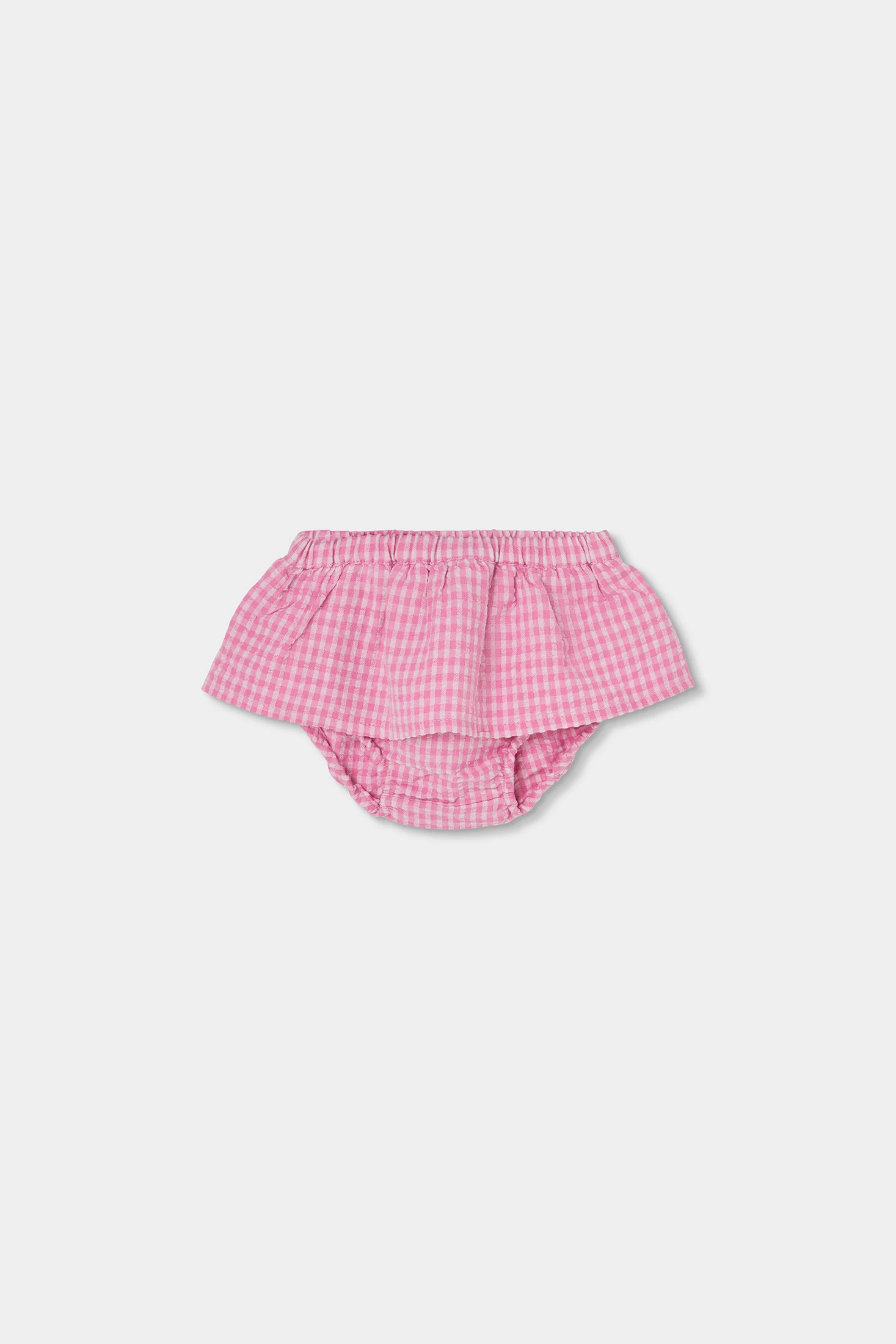 Conjunto de bebé em algodão rosa perfeito para as mais pequenas. Desenhado para idades desde 1 mês até 24 meses. Oferece conforto e suavidade graças ao seu material de alta qualidade. Apresenta uma camisola sem mangas com folhos nos ombros, na cor rosa, e uns calções de popelina de quadros tecidos em tons de rosa, acrescentando um toque encantador e fresco. Ideal para qualquer ocasião, este conjunto assegura estilo e bem-estar durante os meses mais quentes.