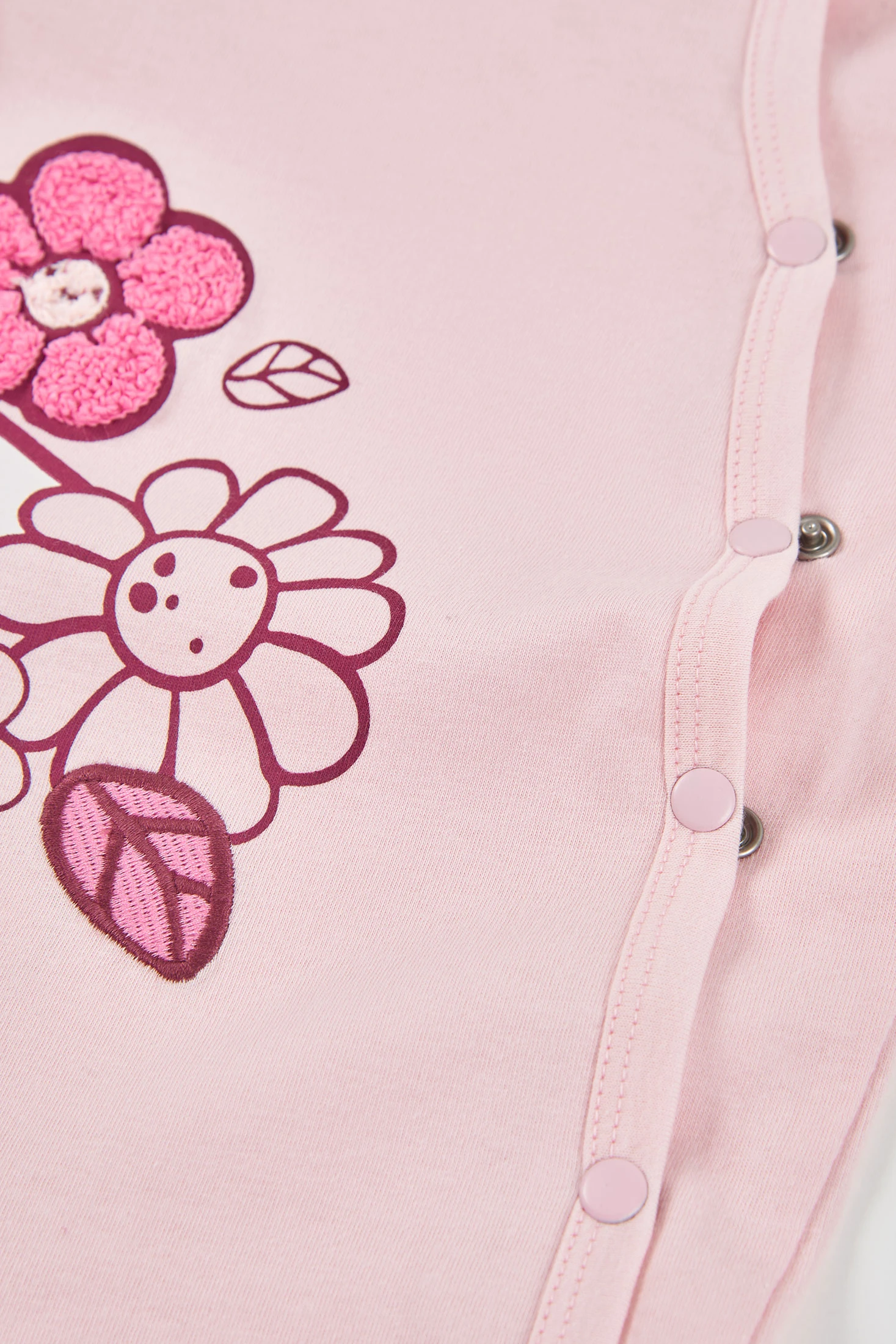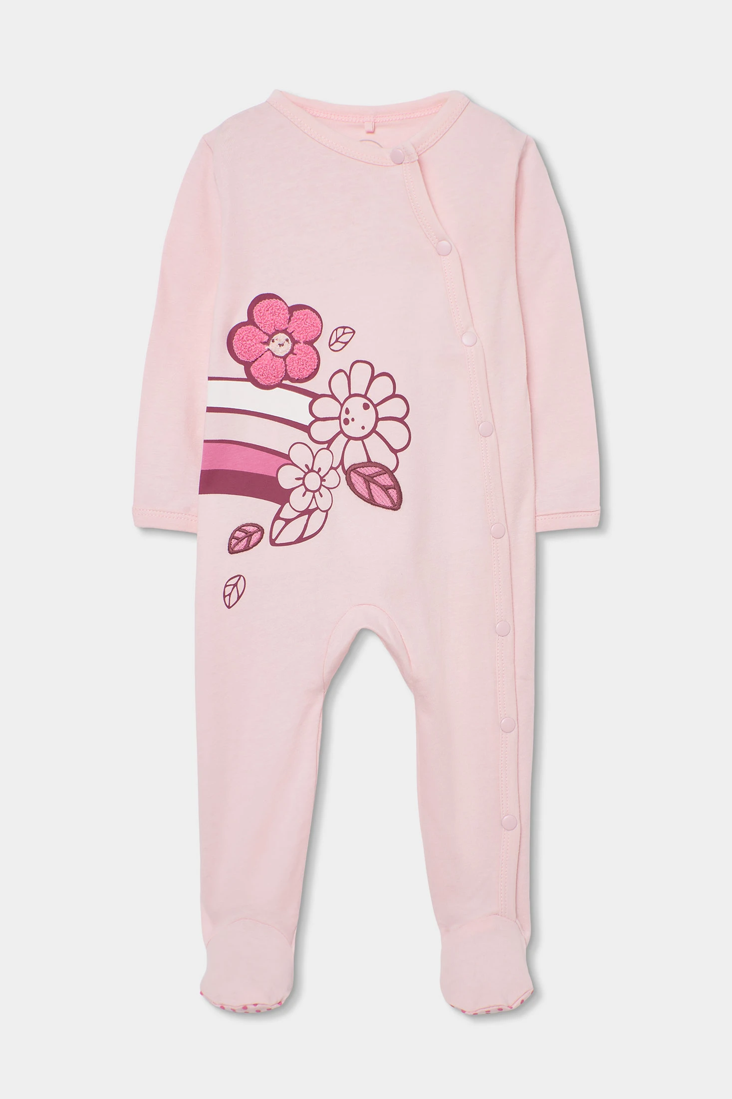 Babygrow de malha de algodão para bebé menina, perfeito para os primeiros meses de vida. Disponível em tamanhos desde 0 meses até 24 meses. A sua cor rosa acrescenta um toque delicado e feminino, e possui um design com flores e folhas que o torna adorável. O fecho de molas facilita a troca de fralda. Com mangas compridas e pés cobertos, é ideal para manter o seu bebé aquecido. Uma opção prática e encantadora para o dia a dia da sua pequena.
