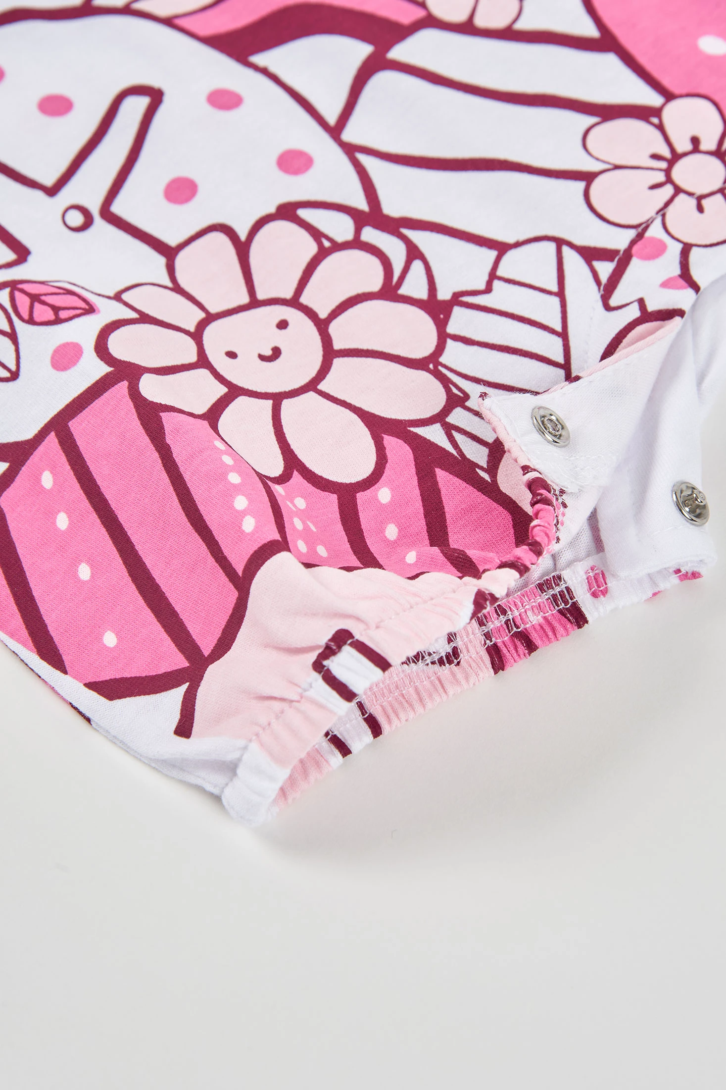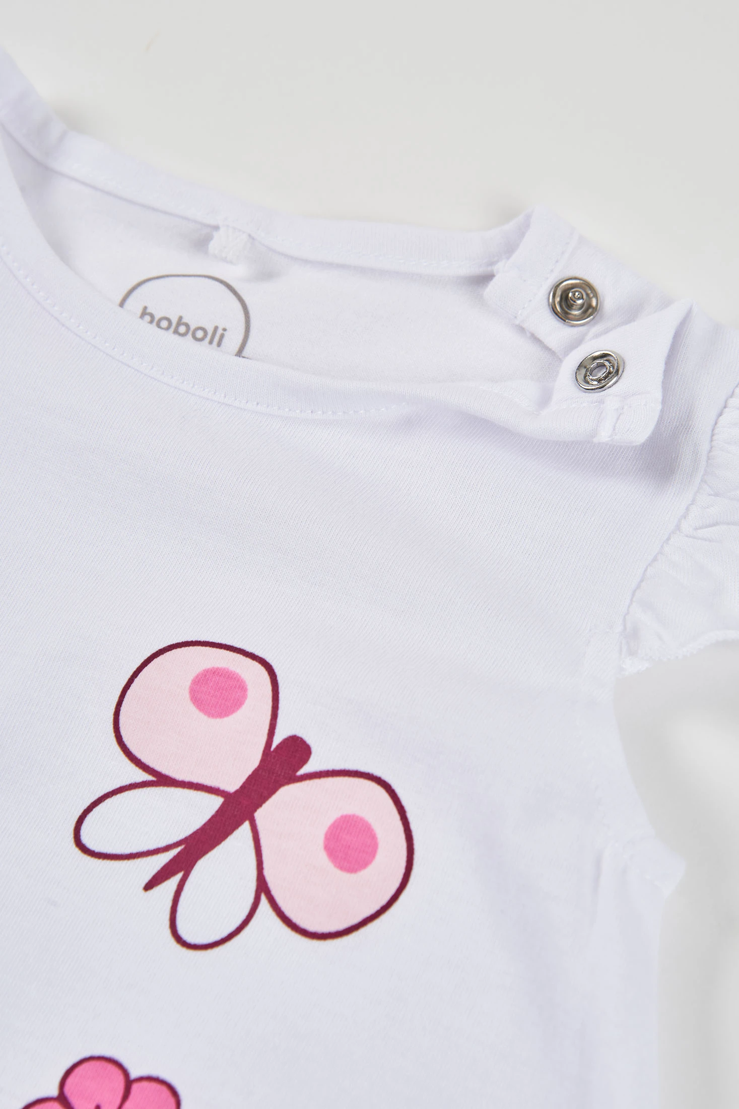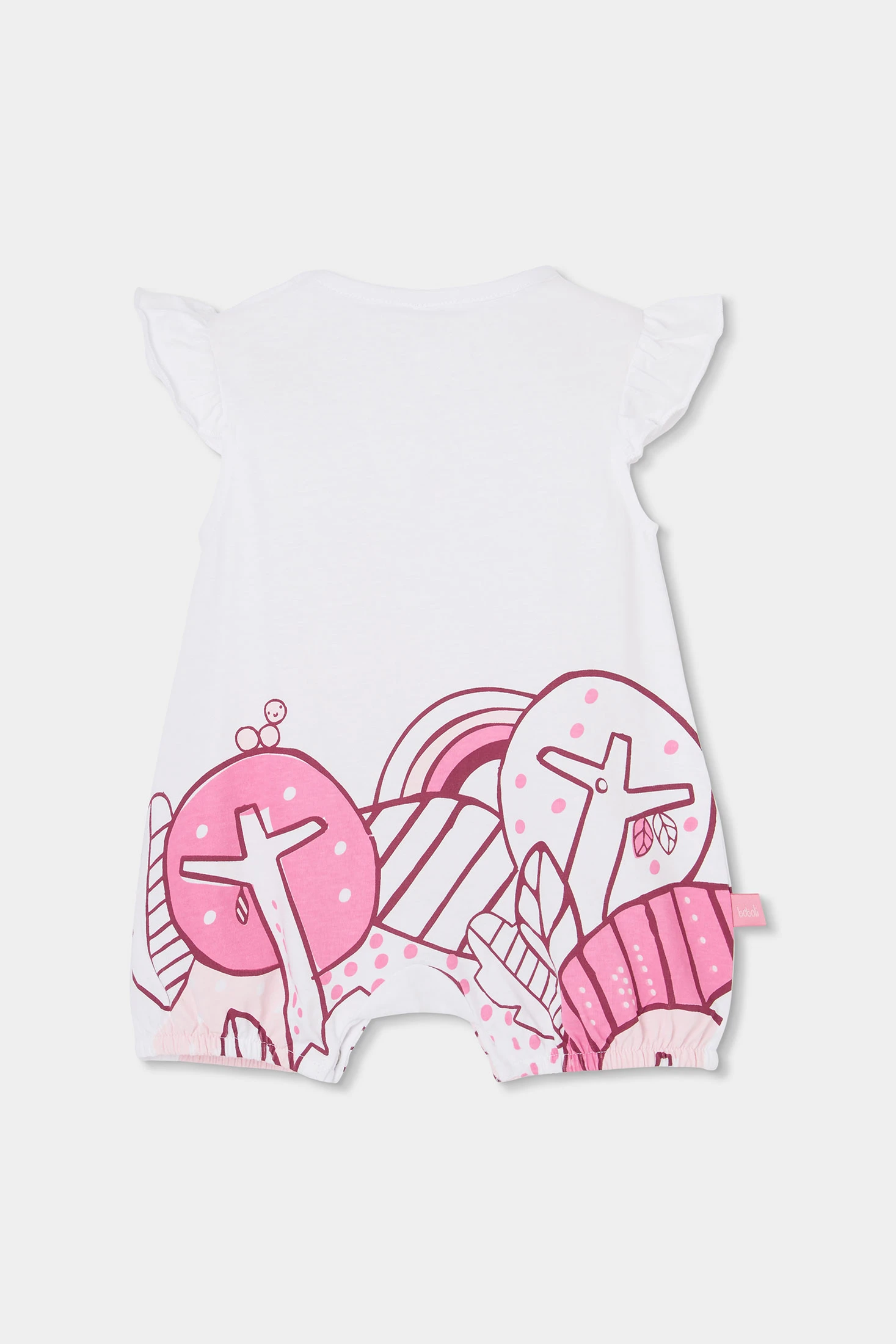 Babygrow de malha de algodão para menina. Disponível em tamanhos desde 0 meses até 24, garante um ajuste perfeito. A sua cor branca com estampado colorido de borboletas e formas abstratas adiciona um toque alegre e divertido. As mangas curtas com folhos proporcionam um estilo encantador e fresco. O tecido suave de algodão assegura conforto durante todo o dia. Perfeito para os dias quentes, este babygrow combina funcionalidade e design para manter o seu bebé confortável e na moda.