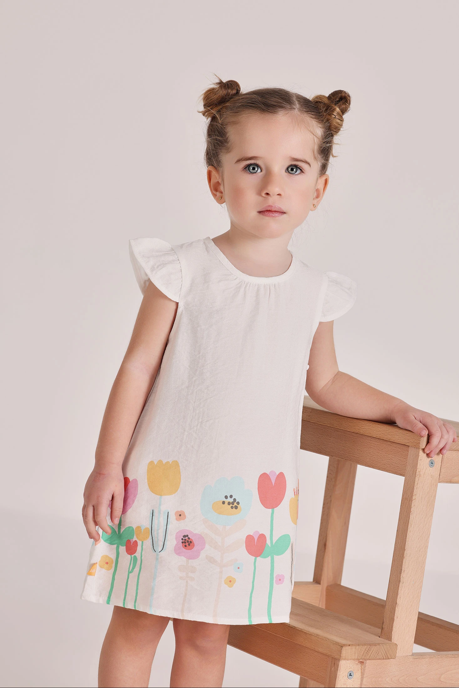 Vestido branco de tecido fantasia para bebés meninas que combina estilo e conforto de forma ideal. Apresenta um design encantador, em cor branca, com estampado de flores coloridas, que adiciona um toque alegre e feminino. O material é suave e perfeito para o cuidado das peles delicadas. Os tamanhos vão desde 1 mês até 24 meses, adaptando-se ao crescimento do bebé. Opção perfeita para ocasiões especiais, graças aos seus detalhes e à sua frescura. O seu design sem mangas torna-o ideal para combinar com casacos em dias mais frescos.