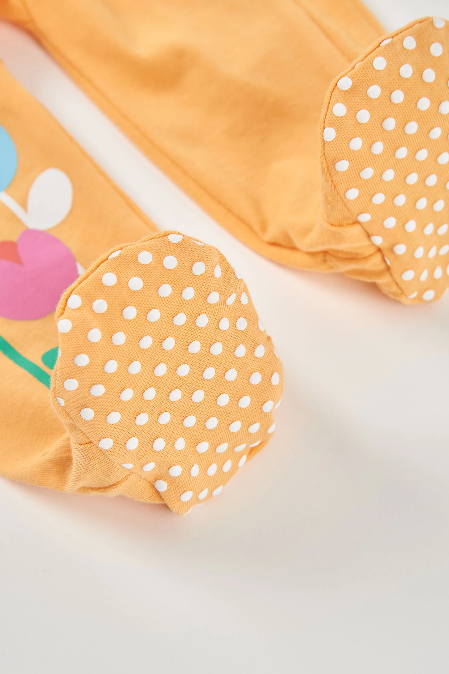 Babygrow de malha de algodão para bebé menina, ideal para mantê-la confortável e aquecida. Disponível em tamanhos desde 0 meses até 24 meses, adapta-se ao crescimento do seu bebé. A sua cor amarela vibrante é adornada com um encantador design floral que acrescenta um toque de doçura. Tem mangas compridas e um fecho de molas que facilita a troca de fraldas. Uma peça prática e estilosa para os dias mais frescos.