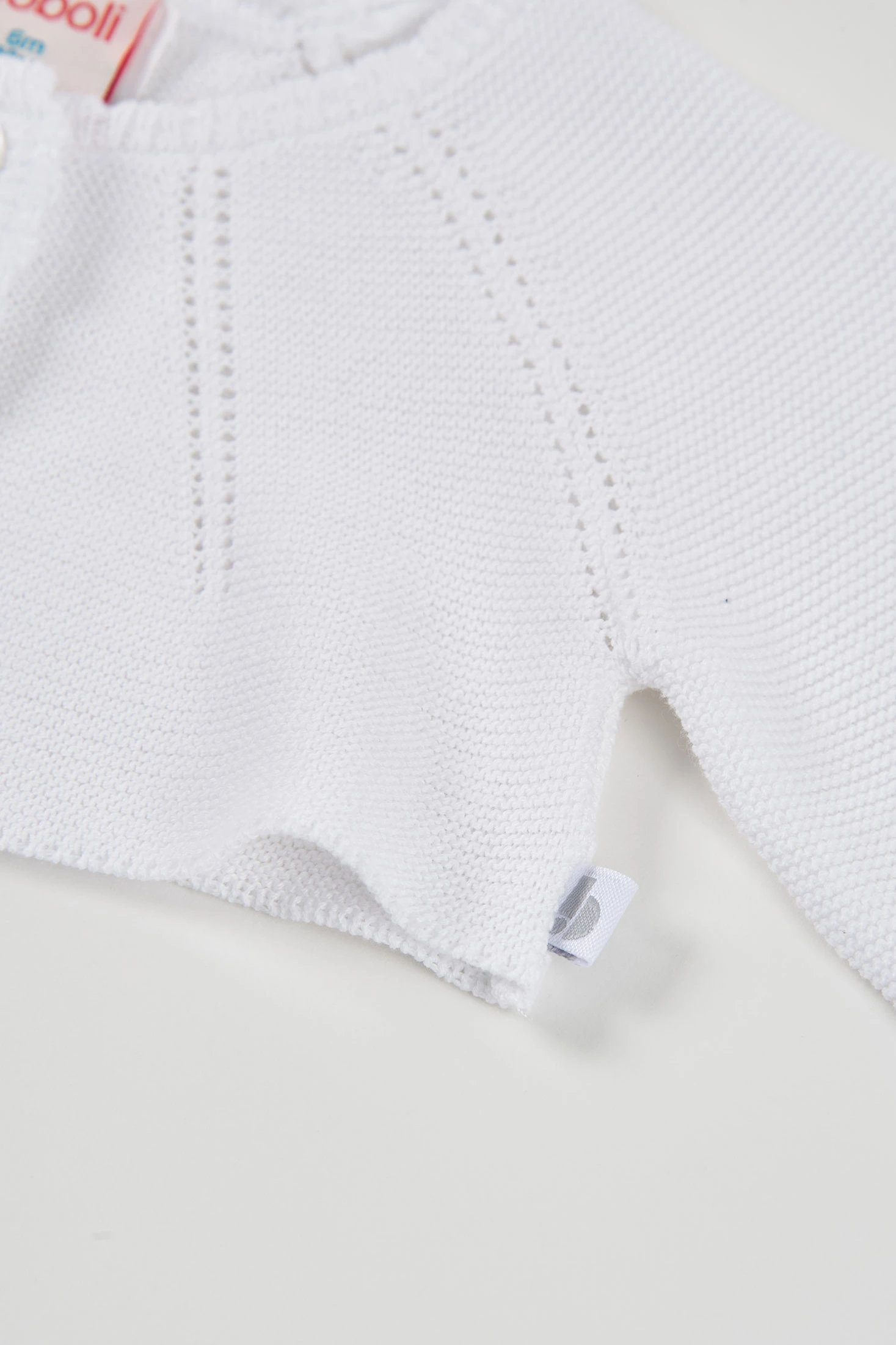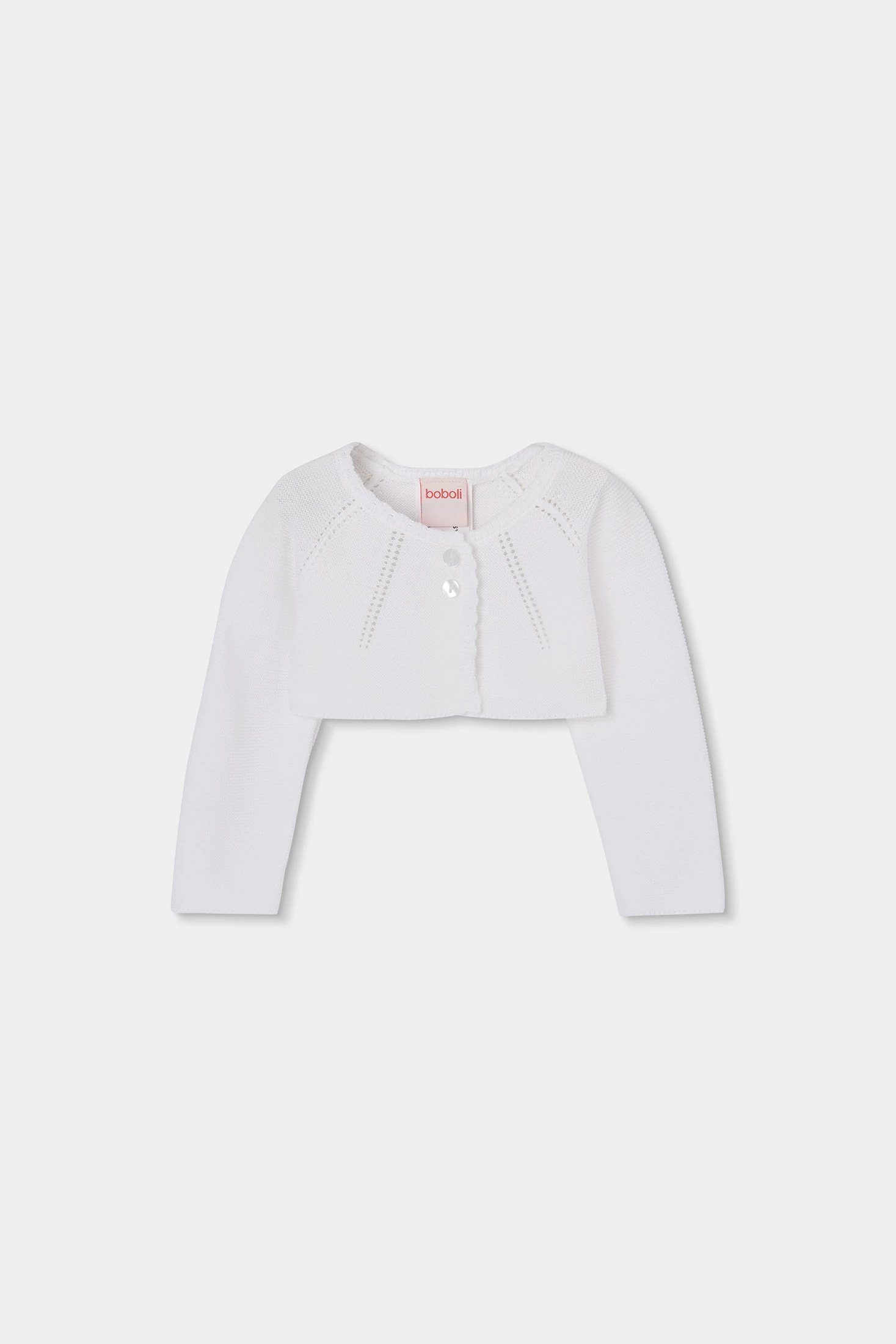 Bolero para bebé menina, confecionado em algodão branco, perfeito para ocasiões especiais. O design elegante inclui delicados detalhes de tricô e um fecho de botão, garantindo conforto e estilo. As mangas compridas adicionam calor, ideal para eventos em climas frescos. Disponível em tamanhos de 1 mês a 2 anos, adapta-se ao crescimento do seu bebé. A sua cor neutra torna-o versátil para combinar com vestidos e conjuntos de diferentes estilos, aportando um toque chique a qualquer look.