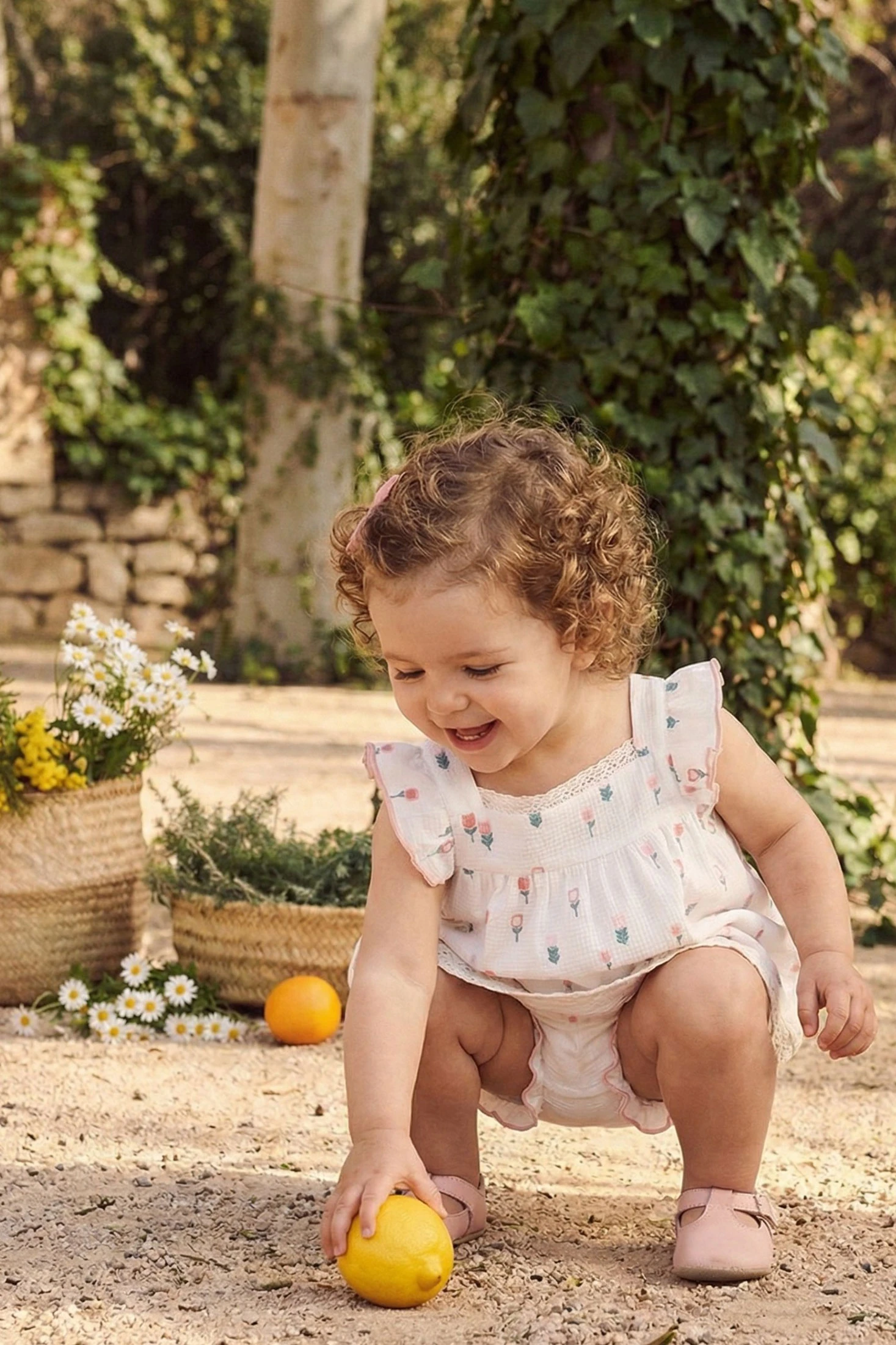 Vestido branco tecido fantasia ideal para bebés, com um design delicado e encantador. Apresenta um padrão de pequenos desenhos que inclui formas de flores em tons suaves. Fabricado com material suave, proporciona conforto e estilo. Perfeito para eventos especiais ou para o dia a dia. Disponível em tamanhos desde 1 mês até 2 anos, adapta-se ao crescimento do seu bebé. Folhos nos ombros adicionam um toque de elegância e distinção.