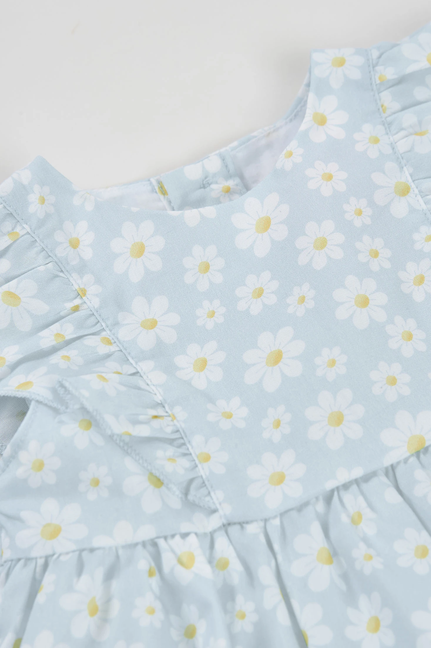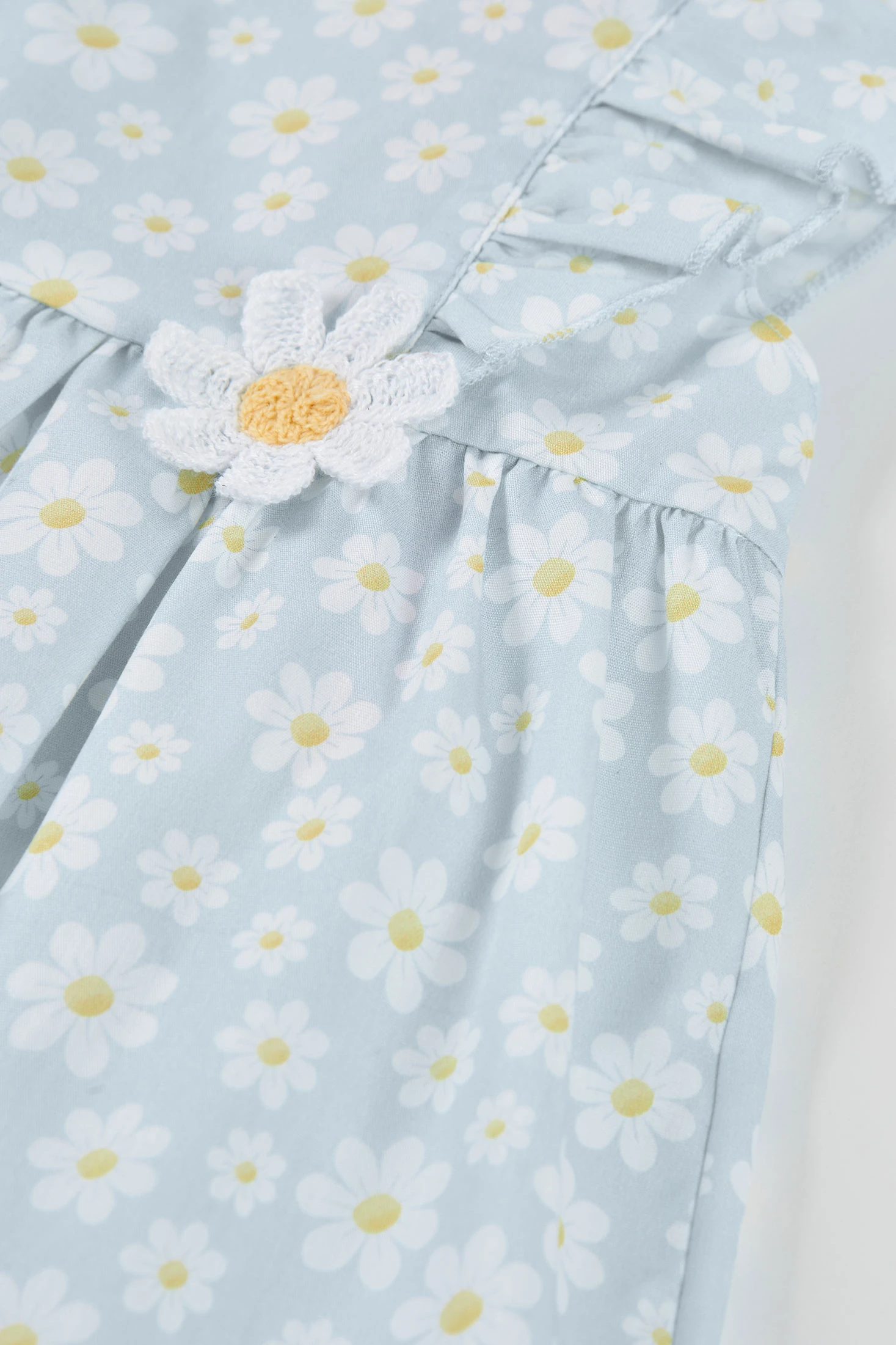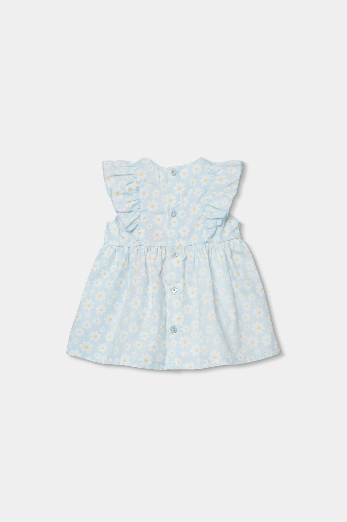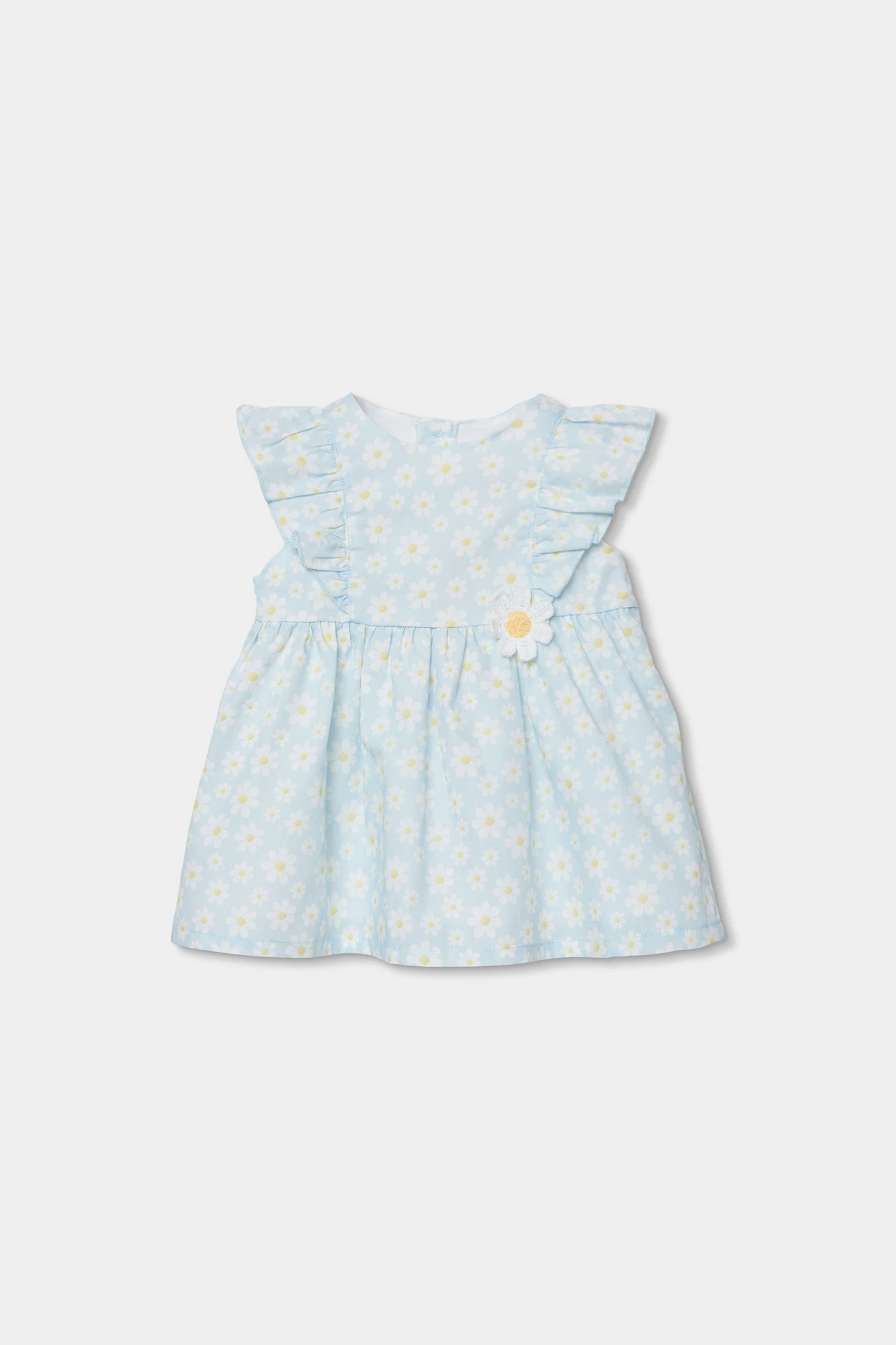 Vestido de popelina para bebé que combina estilo e conforto, ideal para ocasiões especiais. O seu design apresenta um estampado de flores, conferindo um toque primaveril. Feito de material suave, é perfeito para a pele delicada do bebê. Disponível em tamanhos desde 1 mês até 2 anos, oferece um ajuste adequado a cada etapa de crescimento. A cor azul claro combinada com detalhes florais faz com que seja uma peça encantadora. Folhos nas mangas.