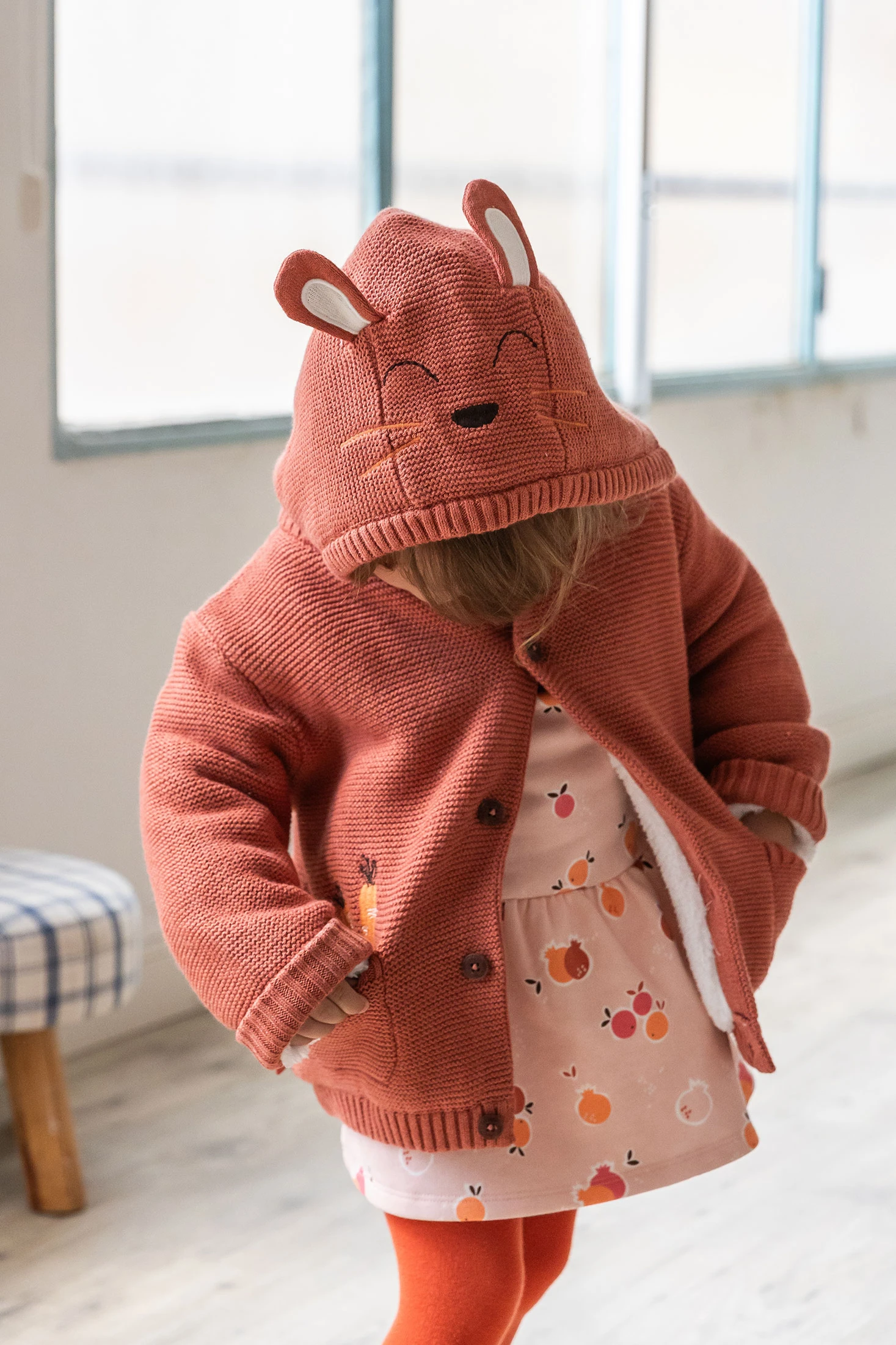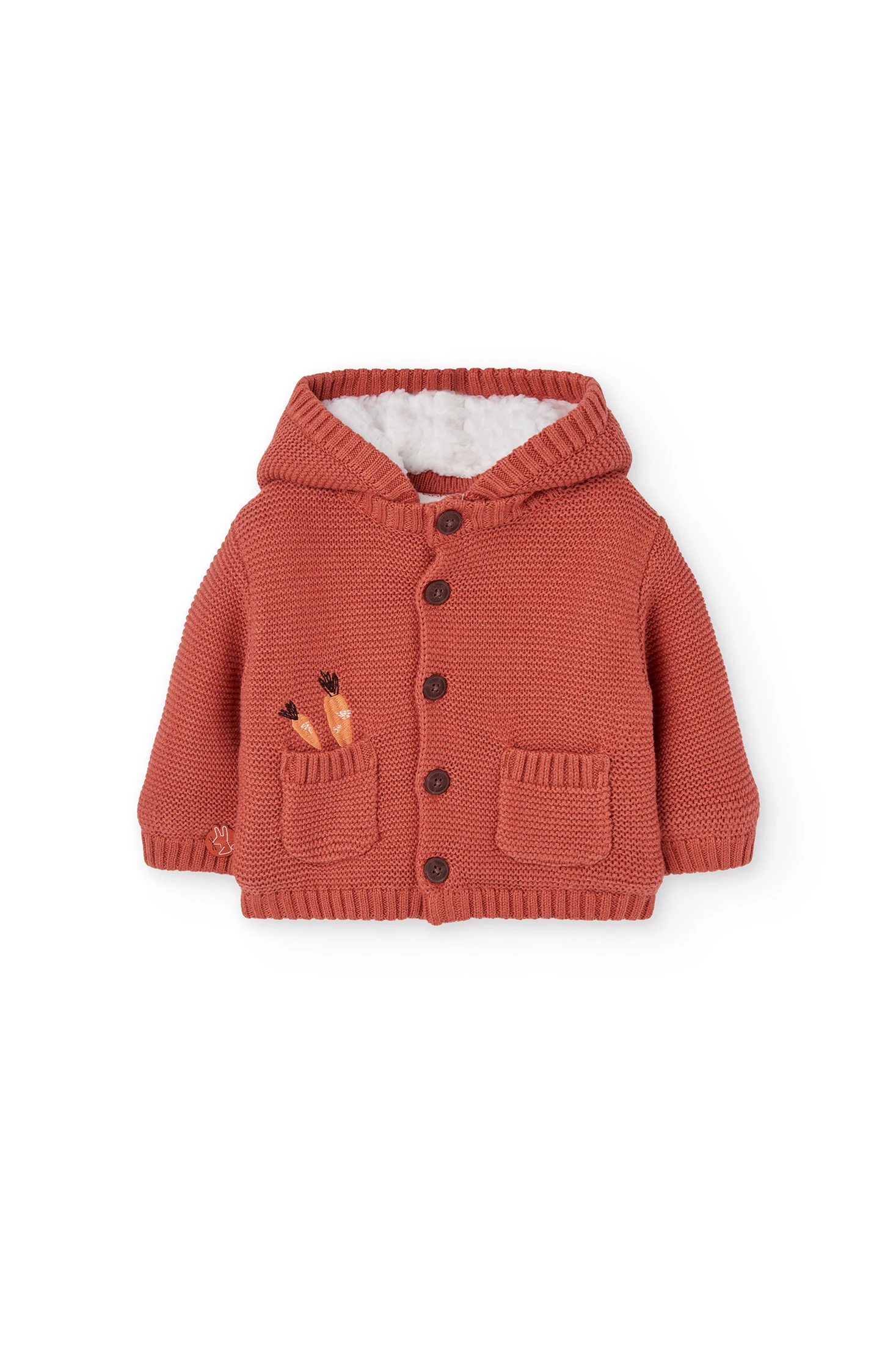 Casaco para bebé em um vibrante tom de laranja, adornado com adoráveis motivos de cenouras que acrescentam um toque alegre ao guarda-roupa do seu pequeno. Ideal para a temporada de inverno, é confeccionado com um tecido suave e quente que proporciona máximo conforto e aquecimento. O fecho de botões permite vestir o bebé com facilidade, simplificando a rotina diária dos pais. Disponível em tamanhos desde 1 mês até 24 meses, é uma peça versátil perfeita tanto para o uso diário como para ocasiões especiais. Combine-o com calças neutras ou estampadas para conseguir um look harmonioso e encantador.