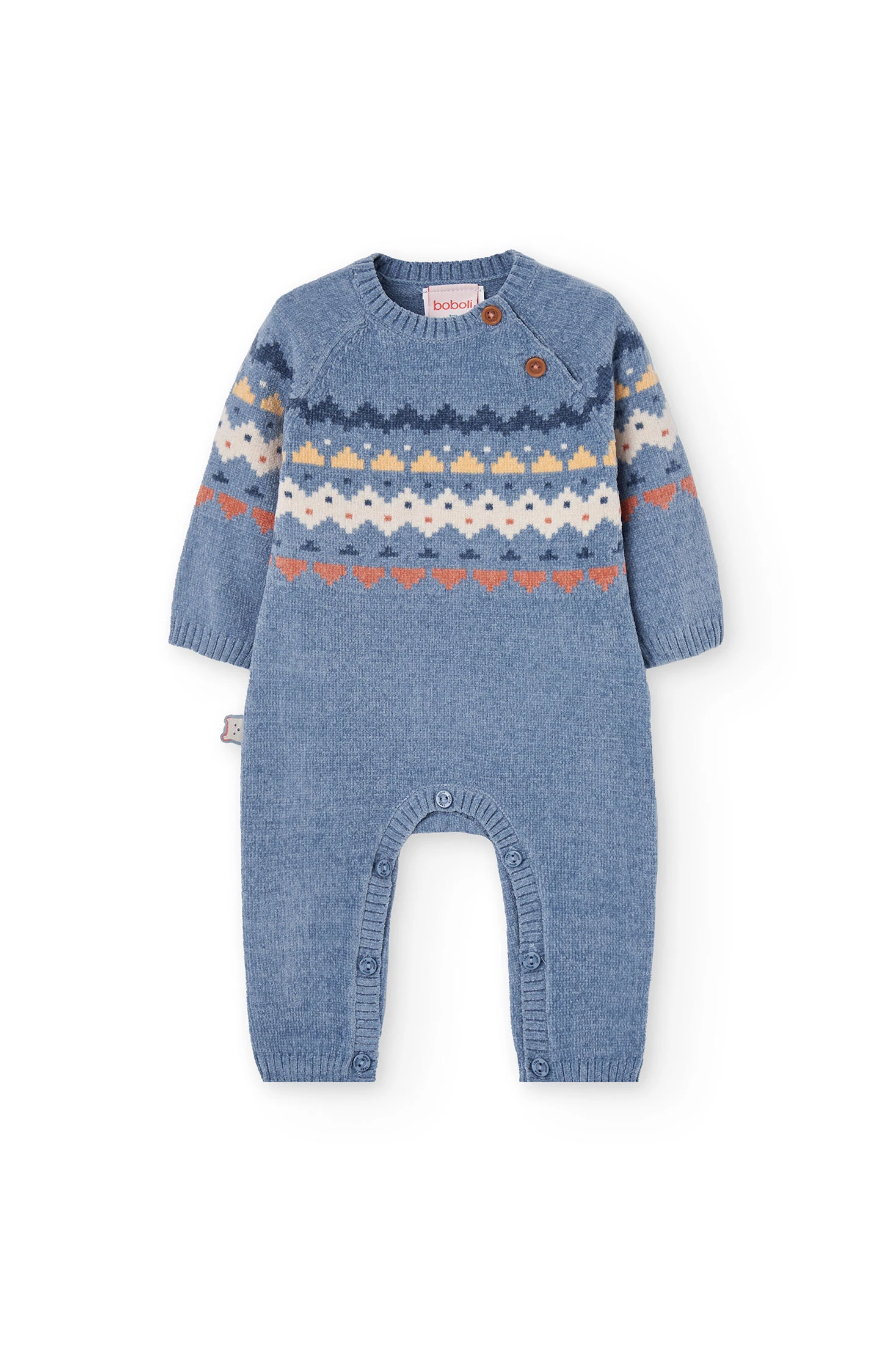 Macacão de malha para bebé em azul com jacquard em várias cores, perfeito para manter o seu pequeno aquecido durante os meses frios. Disponível em tamanhos de 1 mês a 2 anos, oferece um ajuste confortável que se adapta ao crescimento do bebé. O seu design em tons neutros e padrões suaves adiciona um toque elegante e moderno, adequado para qualquer ocasião. Confecionado num tecido de malha quente e acolhedor, é ideal para o inverno. Inclui fechos práticos com botões no ombro e entre as pernas, facilitando a troca de fraldas. As mangas compridas garantem que o seu bebé permaneça confortável e estiloso em todo momento.
