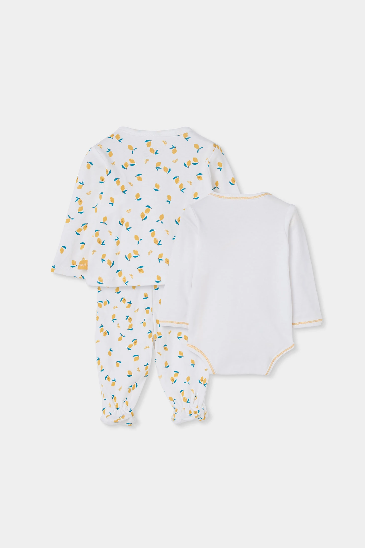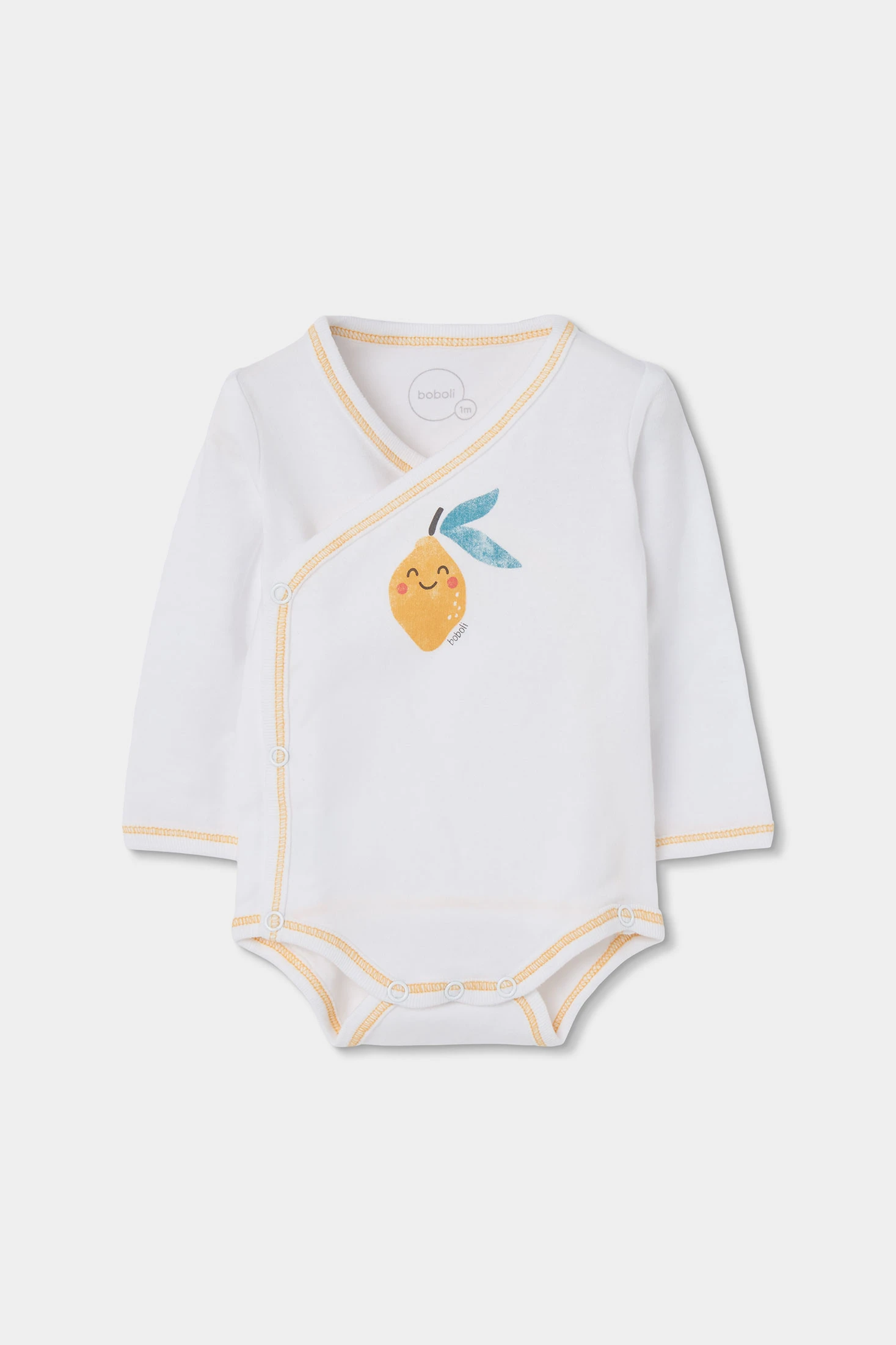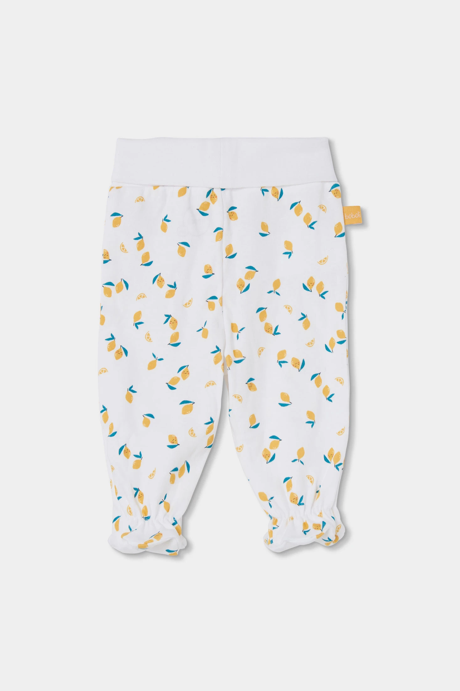 Conjunto para bebé com um adorável estampado de limões, perfeito para os dias quentes de primavera e verão. Inclui camiseta cruzada, calças com pé e gorro a condizer, confeccionados em tecido de algodão suave que cuida da pele do bebé. O design confortável e funcional facilita a troca e permite liberdade de movimento. A estampa alegre adiciona um toque fresco e divertido, ideal para acompanhar as primeiras aventuras do pequeno.