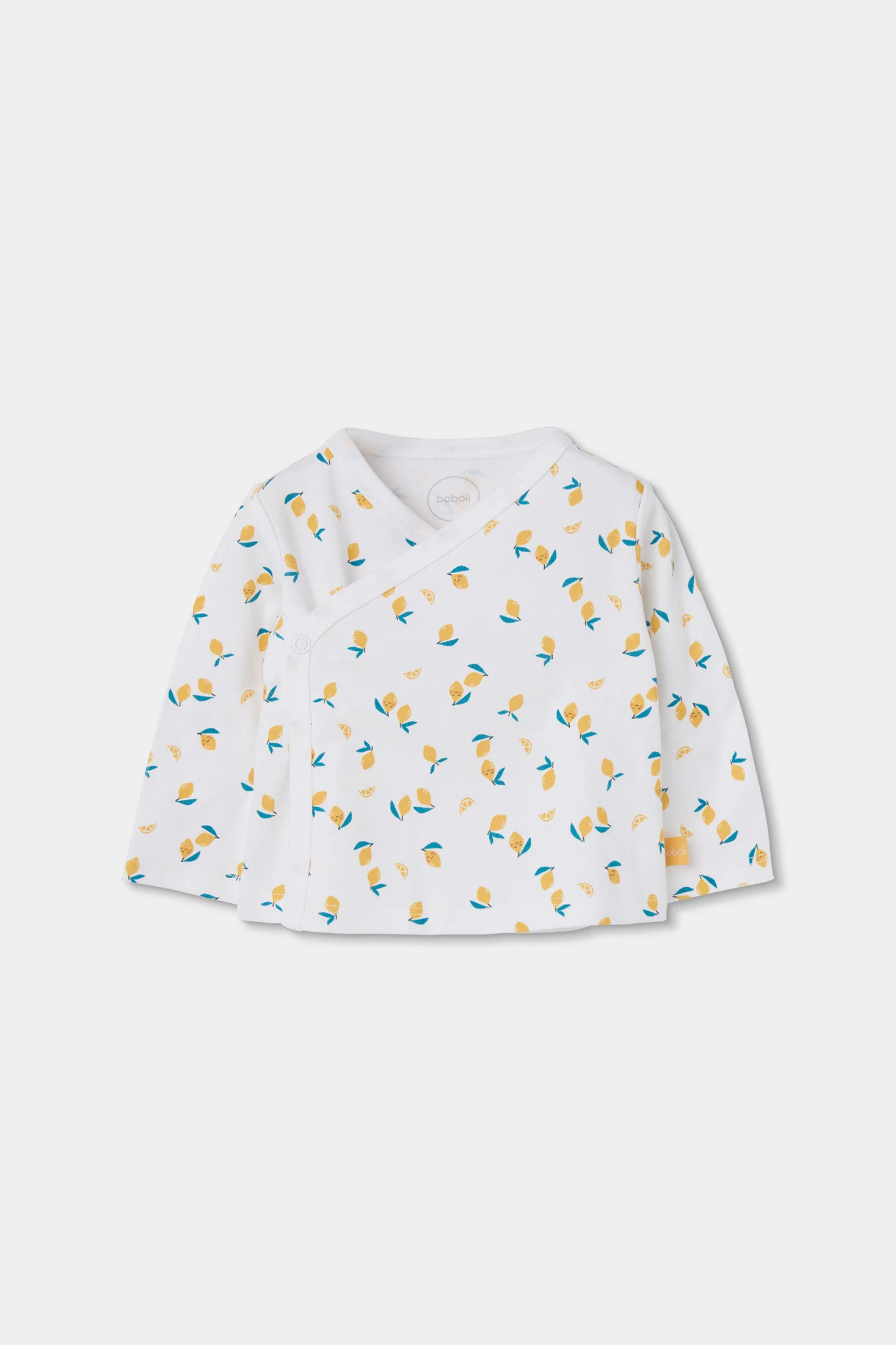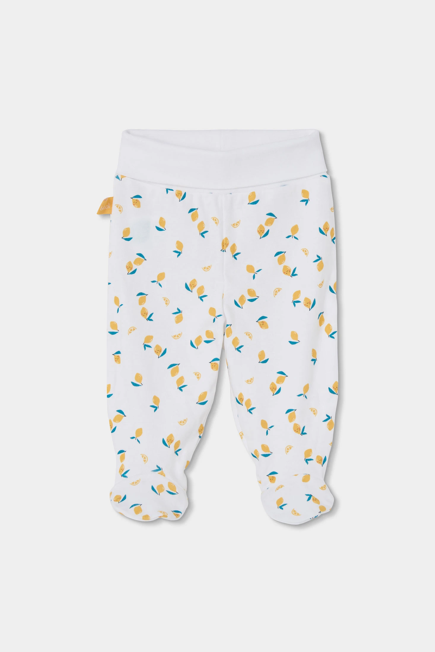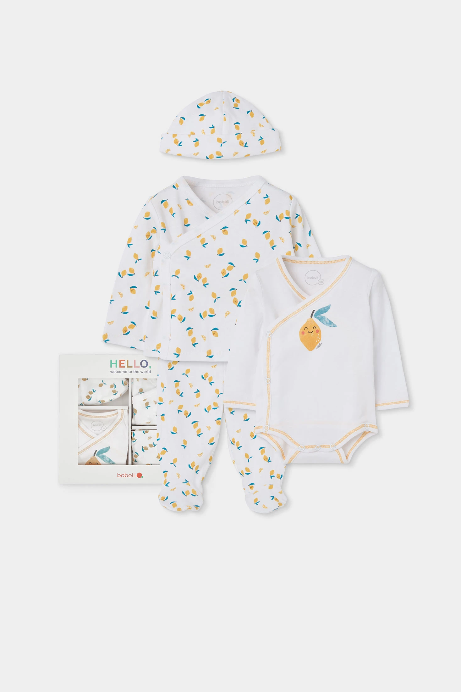 Conjunto para bebé com um adorável estampado de limões, perfeito para os dias quentes de primavera e verão. Inclui camiseta cruzada, calças com pé e gorro a condizer, confeccionados em tecido de algodão suave que cuida da pele do bebé. O design confortável e funcional facilita a troca e permite liberdade de movimento. A estampa alegre adiciona um toque fresco e divertido, ideal para acompanhar as primeiras aventuras do pequeno.