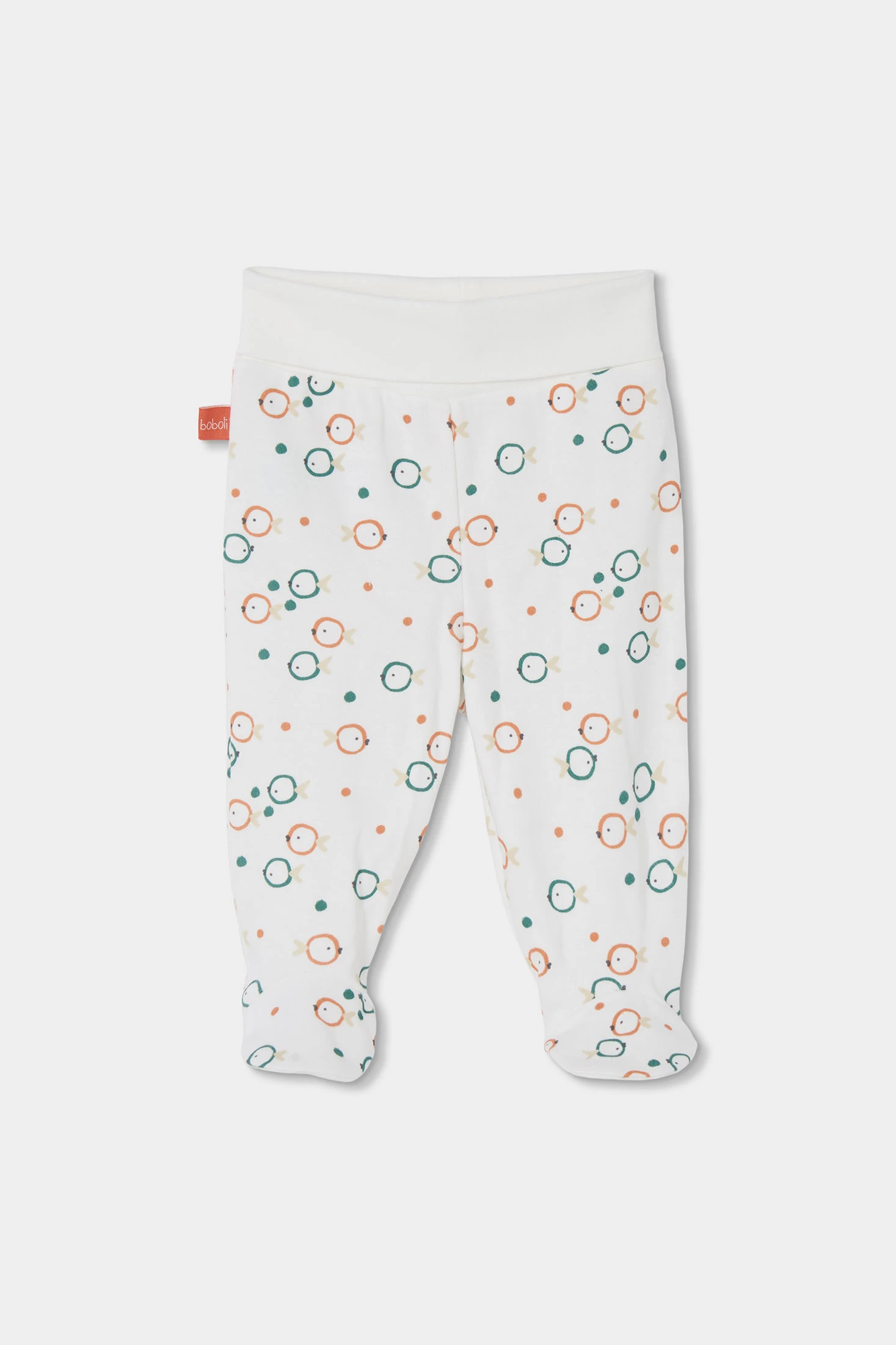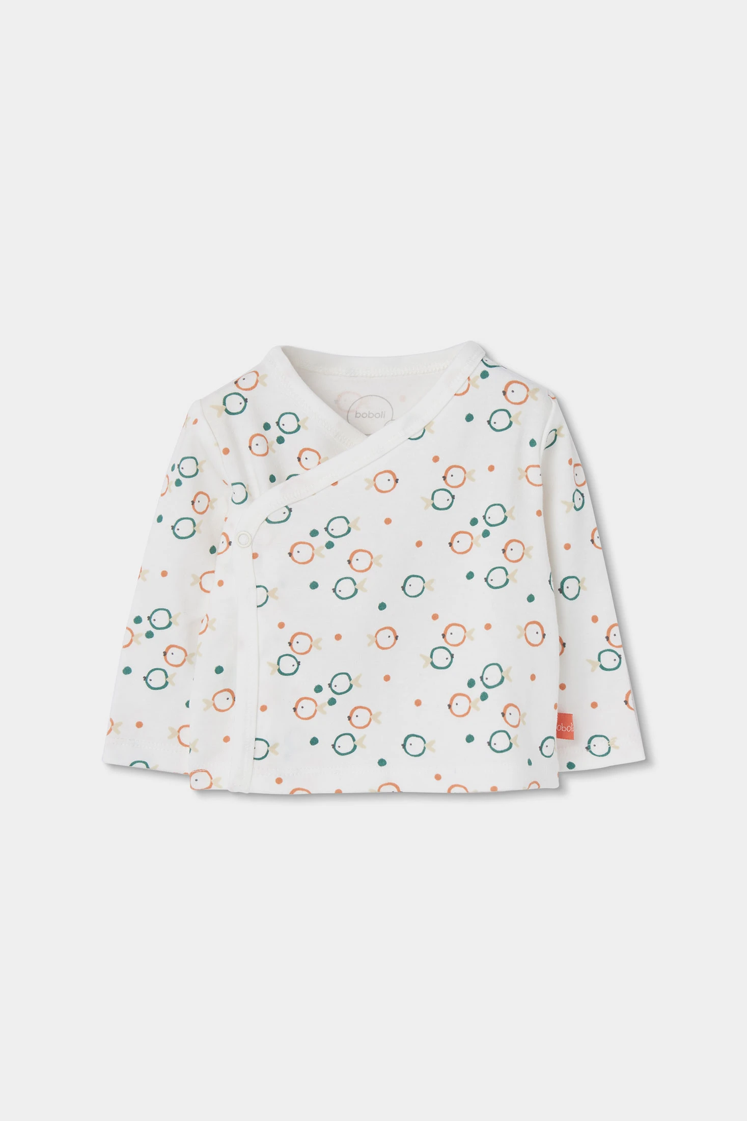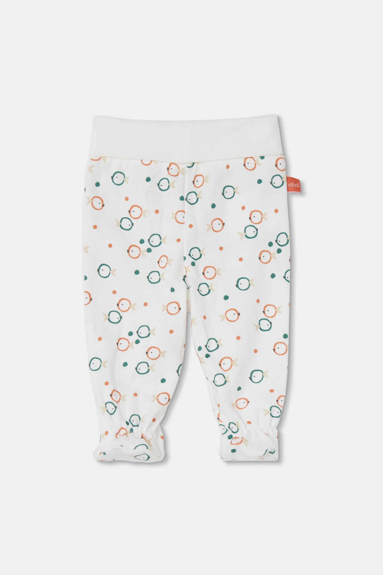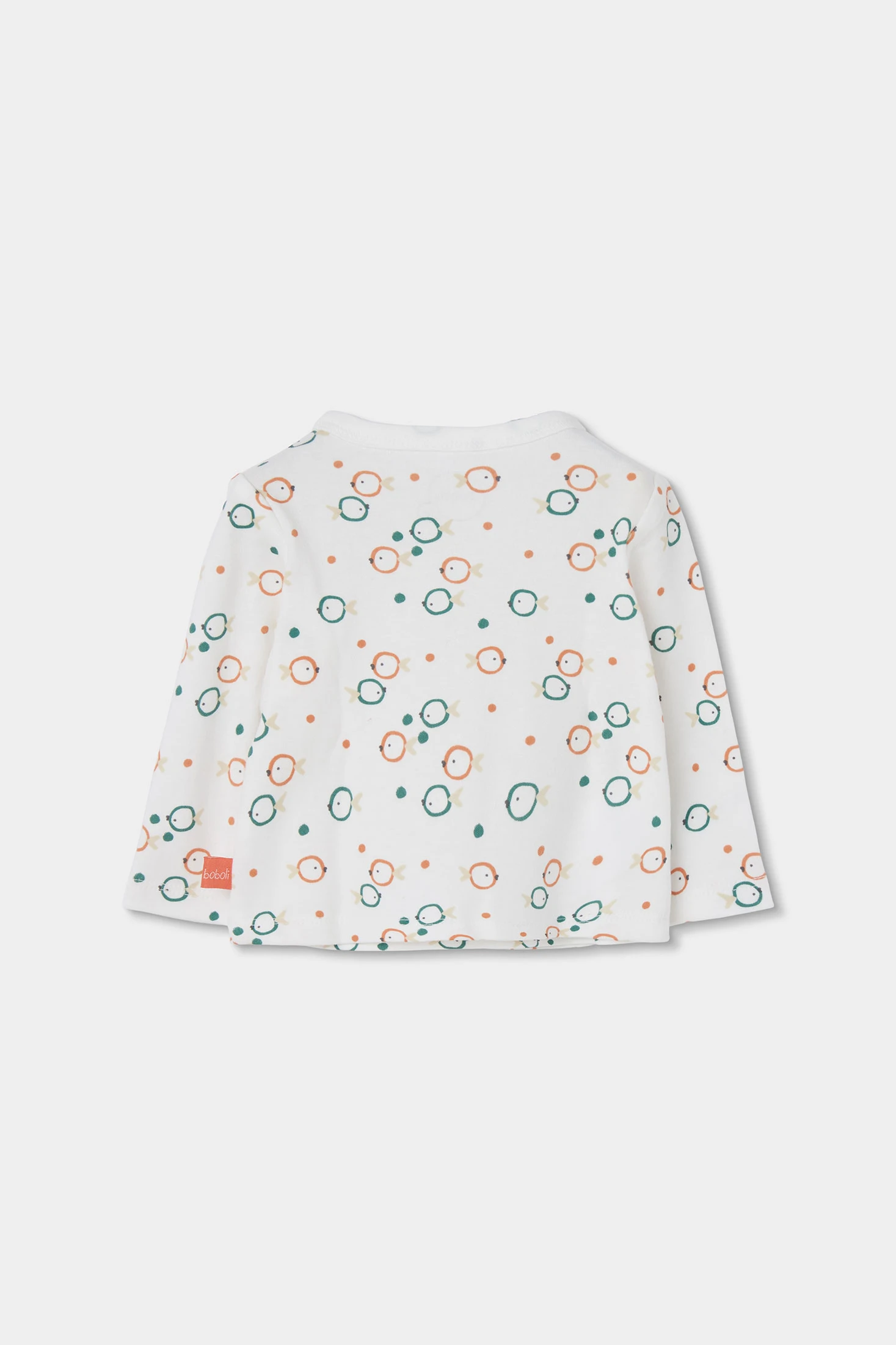 Conjunto para bebé com estampa de peixes e motivos marinhos, desenhado para oferecer conforto e estilo em qualquer momento do dia. É composto por camiseta cruzada, calças com pé e gorro, confeccionados em algodão de toque suave. Os fechos laterais facilitam a troca de roupa, enquanto o design inspirado no mar acrescenta um toque doce e de verão ao visual do bebé.