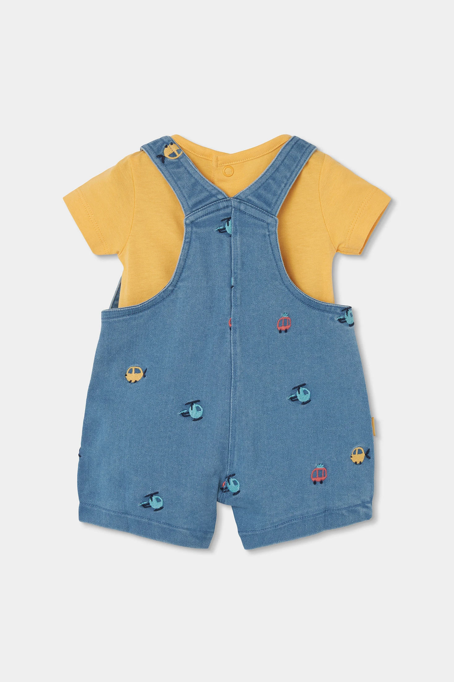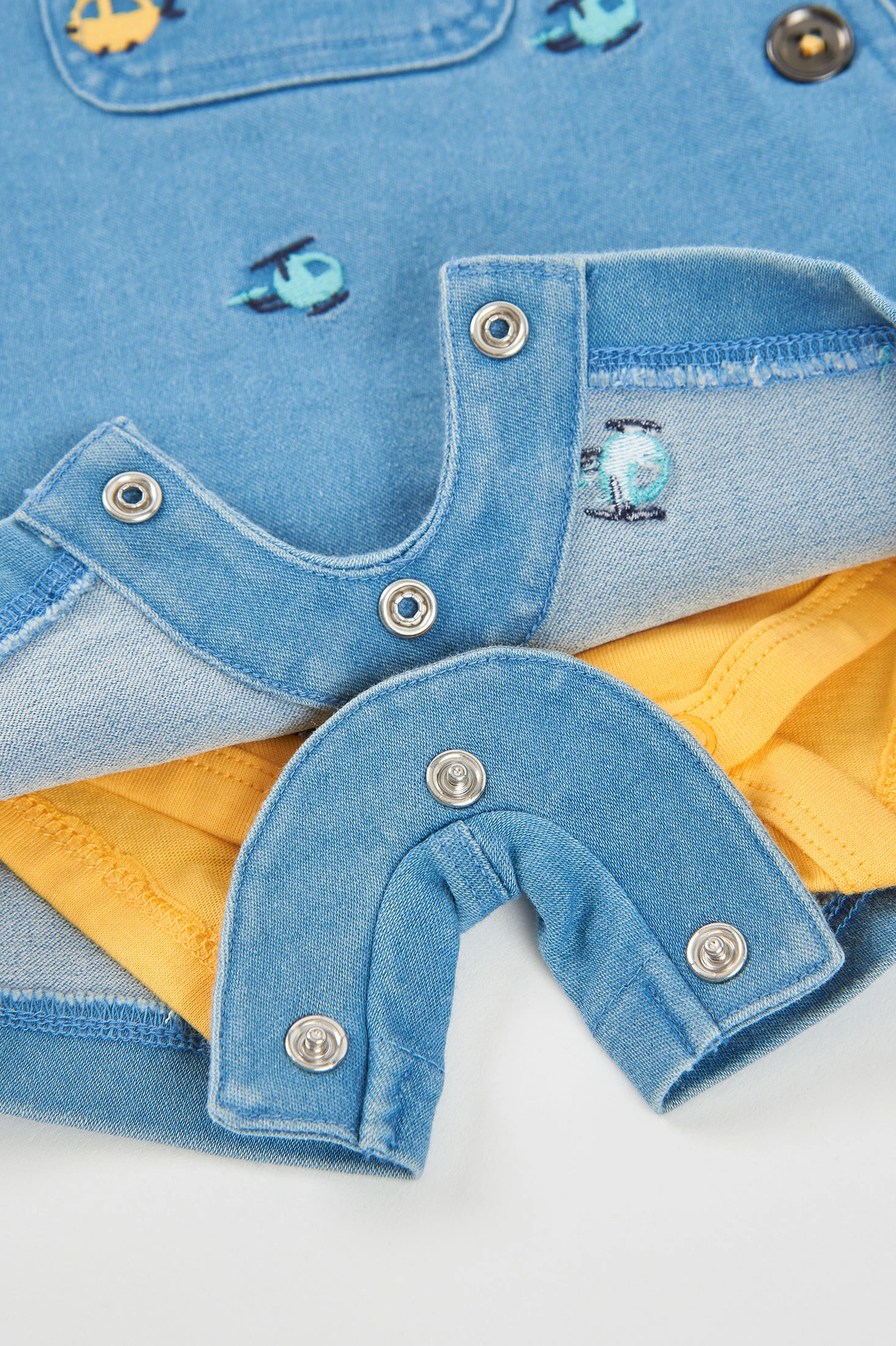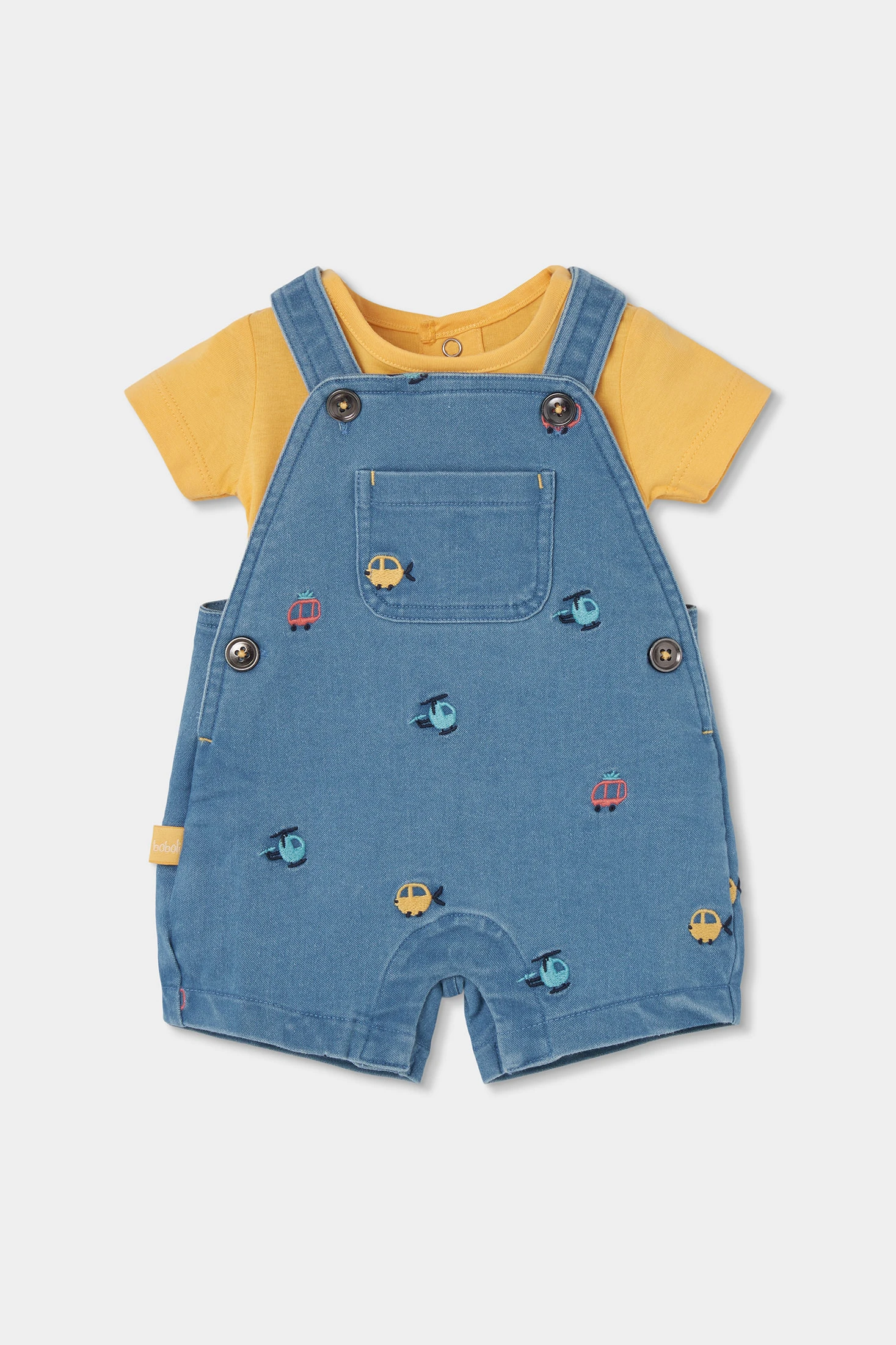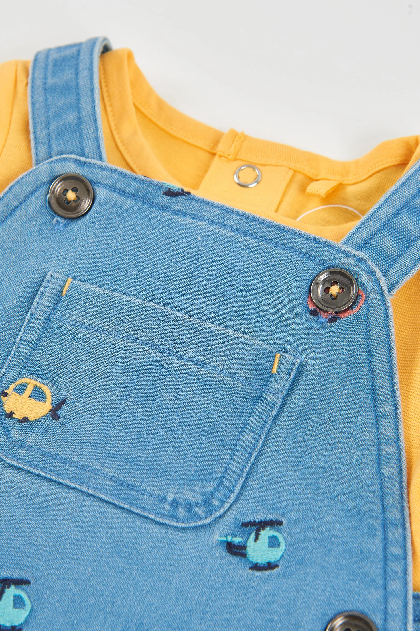 Conjunto para bebé composto por um body de manga curta em tom mostarda e uma jardineira em ganga com bordados de frutas. Uma combinação perfeita entre conforto e estilo para o dia a dia. O body, feito em algodão macio, proporciona frescura e suavidade à pele do bebé, enquanto a jardineira com alças ajustáveis e bolso frontal adiciona um toque divertido e prático. Ideal para looks descontraídos e encantadores.