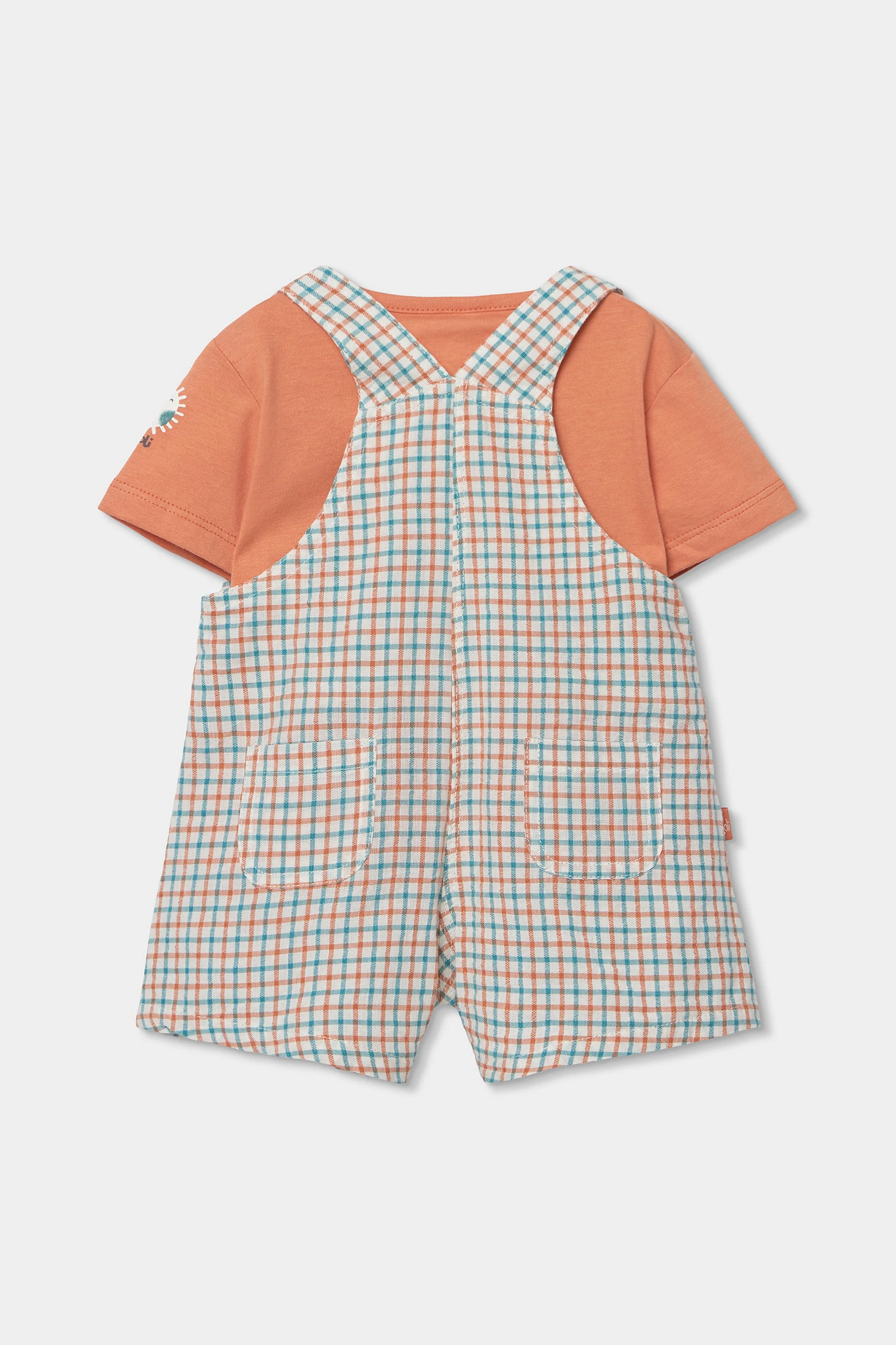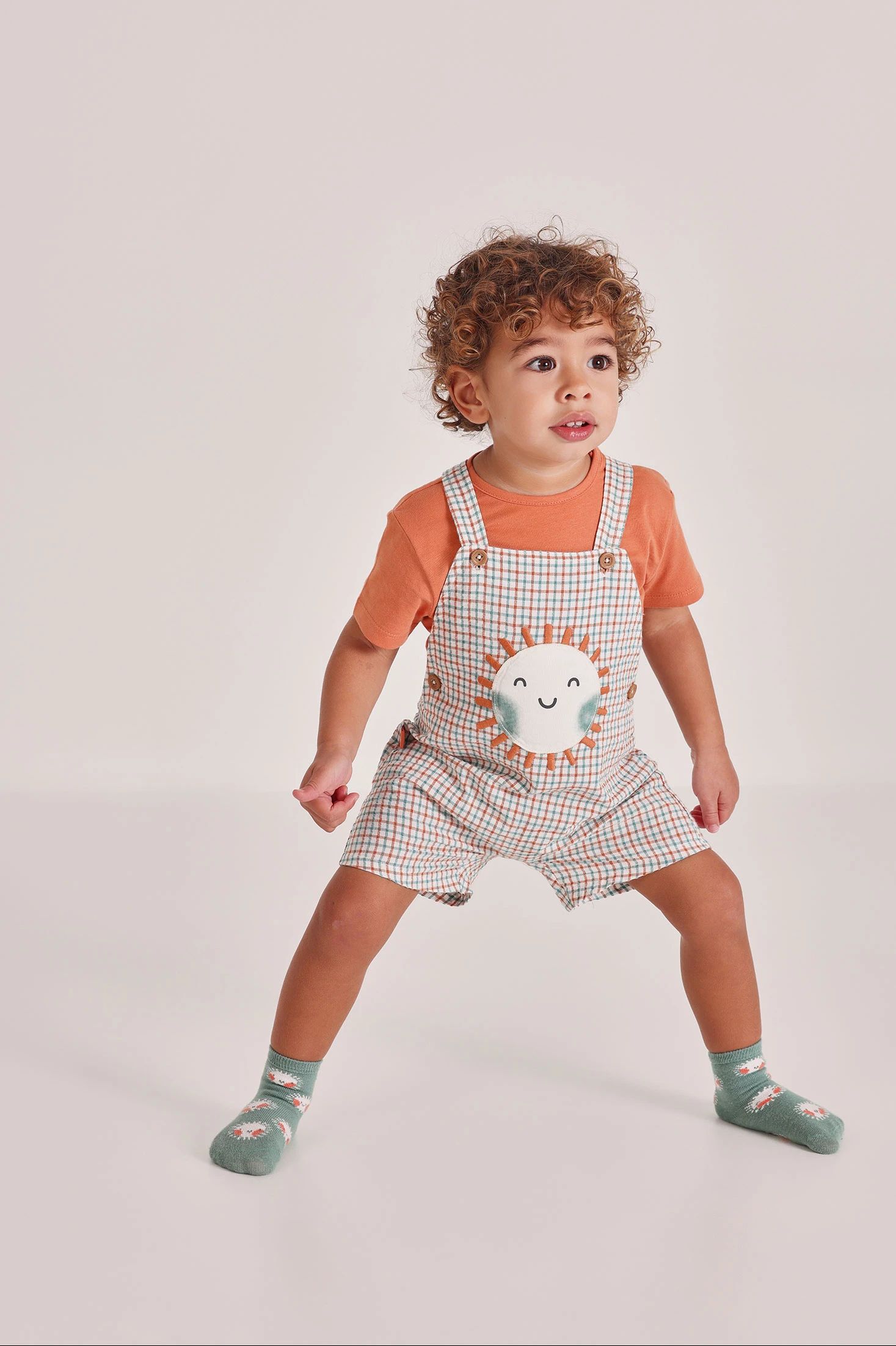 Confecionado em algodão suave, o conjunto para bebé apresenta um design de quadrados, perfeito para um look casual e alegre. Um divertido sol sorridente adorna a parte frontal, acrescentando um toque de charme. Inclui uma camisola de cor terracota com mangas curtas que complementa o conjunto. Os tamanhos variam de 1 mês a 24 meses, adaptando-se ao crescimento do bebé. Versátil e confortável, é ideal para uso diário.