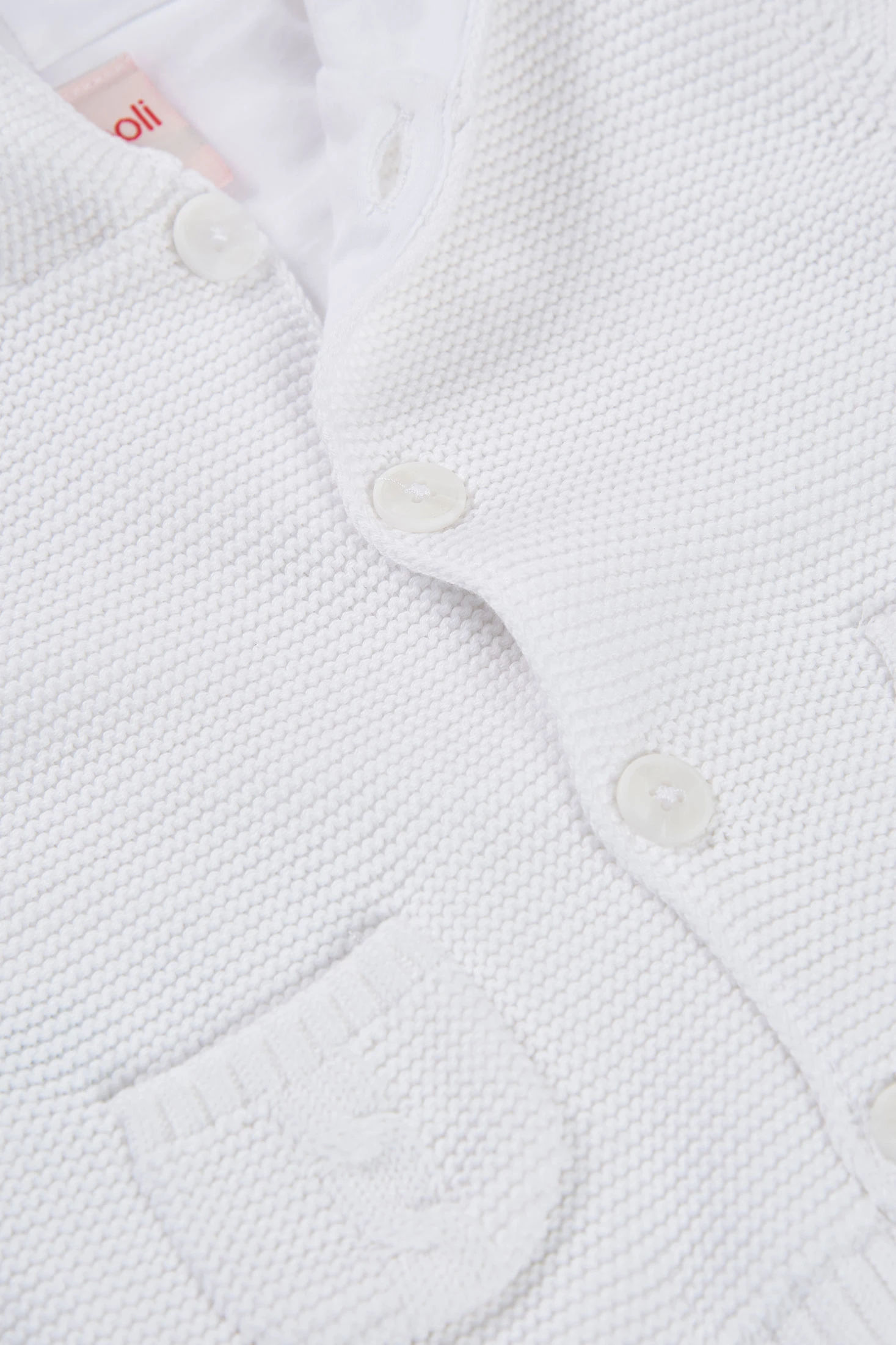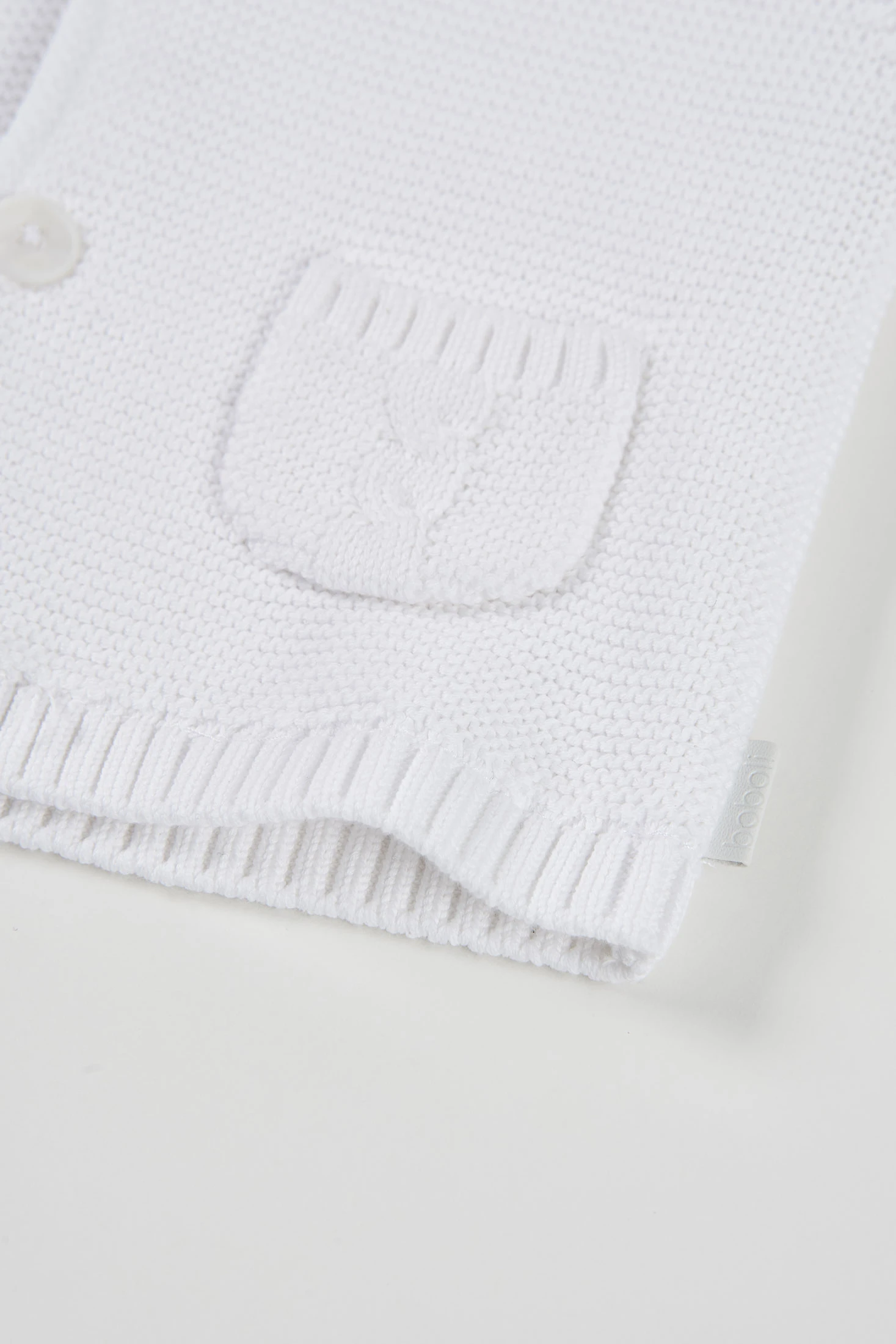 Cardigã de malha branco para bebé, ideal para manter o seu pequeno quente durante a primavera. O seu design clássico inclui um capuz para maior proteção. O tecido de malha é suave e confortável, perfeito para o uso diário. Disponível em tamanhos desde 1 mês até 2 anos, adapta-se ao crescimento do seu bebé. Com um fecho de botões e dois bolsos frontais, esta peça é prática e elegante. A cor branca torna-a facilmente combinável com outras peças do guarda-roupa infantil.