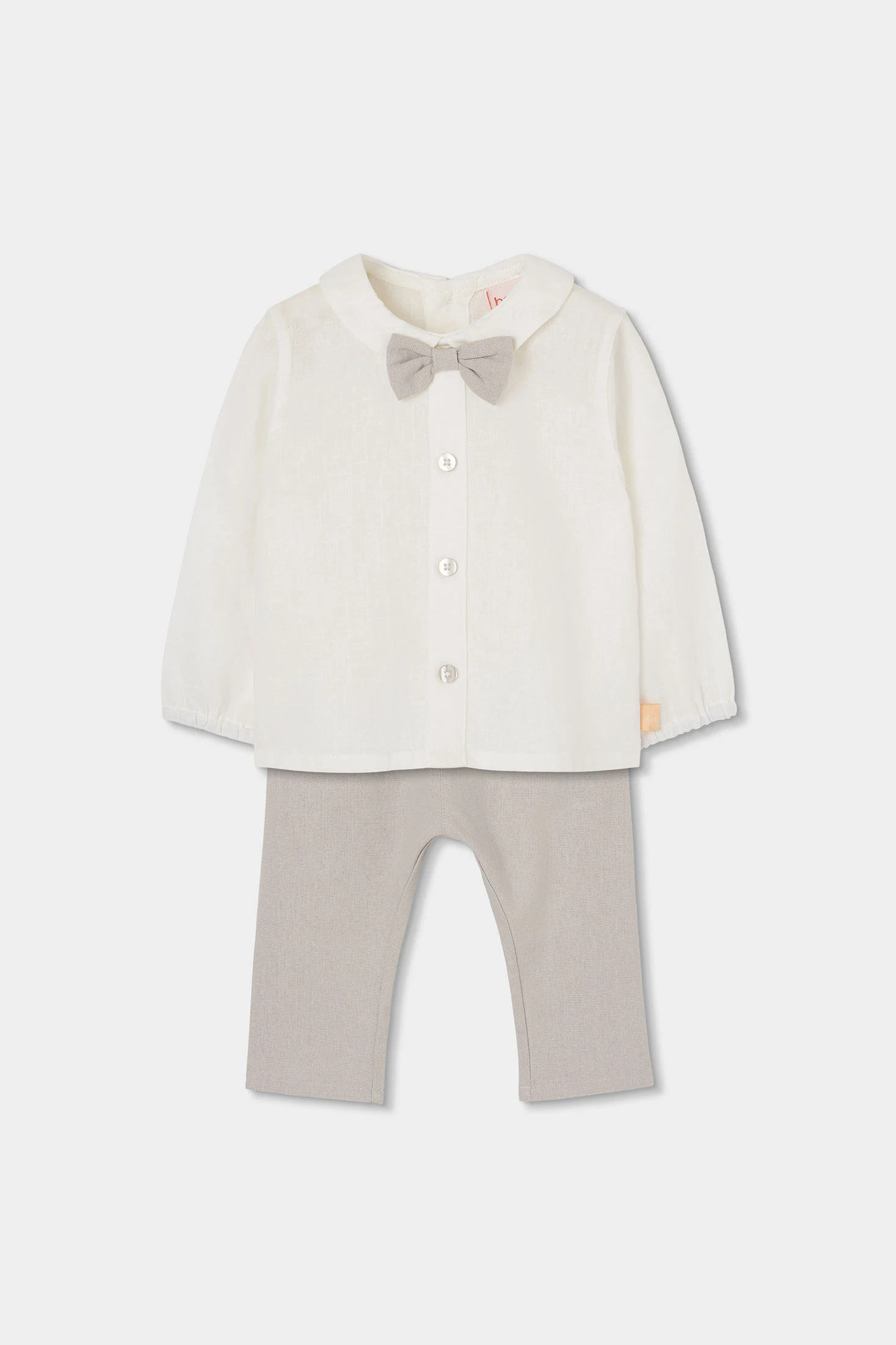 Conjunto de linho bege para bebé menino, elegante e ideal para ocasiões especiais. Composto por uma camisa e calças, o seu material em linho proporciona frescura e conforto. A camisa é de cor branca, com botões à frente e um laço decorativo que acrescenta um toque chique. As calças bege combinam perfeitamente, criando um look sofisticado. Disponível em tamanhos desde 1 mês até 2 anos, é perfeito para qualquer estação. Este conjunto versátil permite combinar-se facilmente com outras peças para alcançar um estilo encantador e confortável para o bebé.