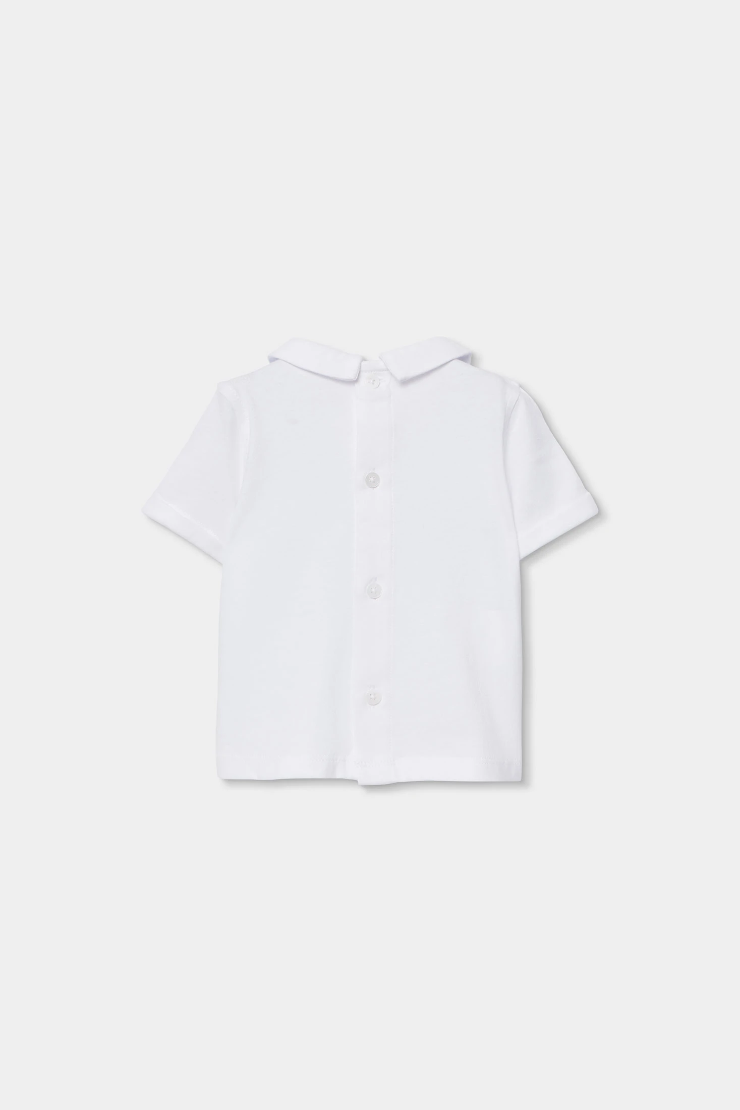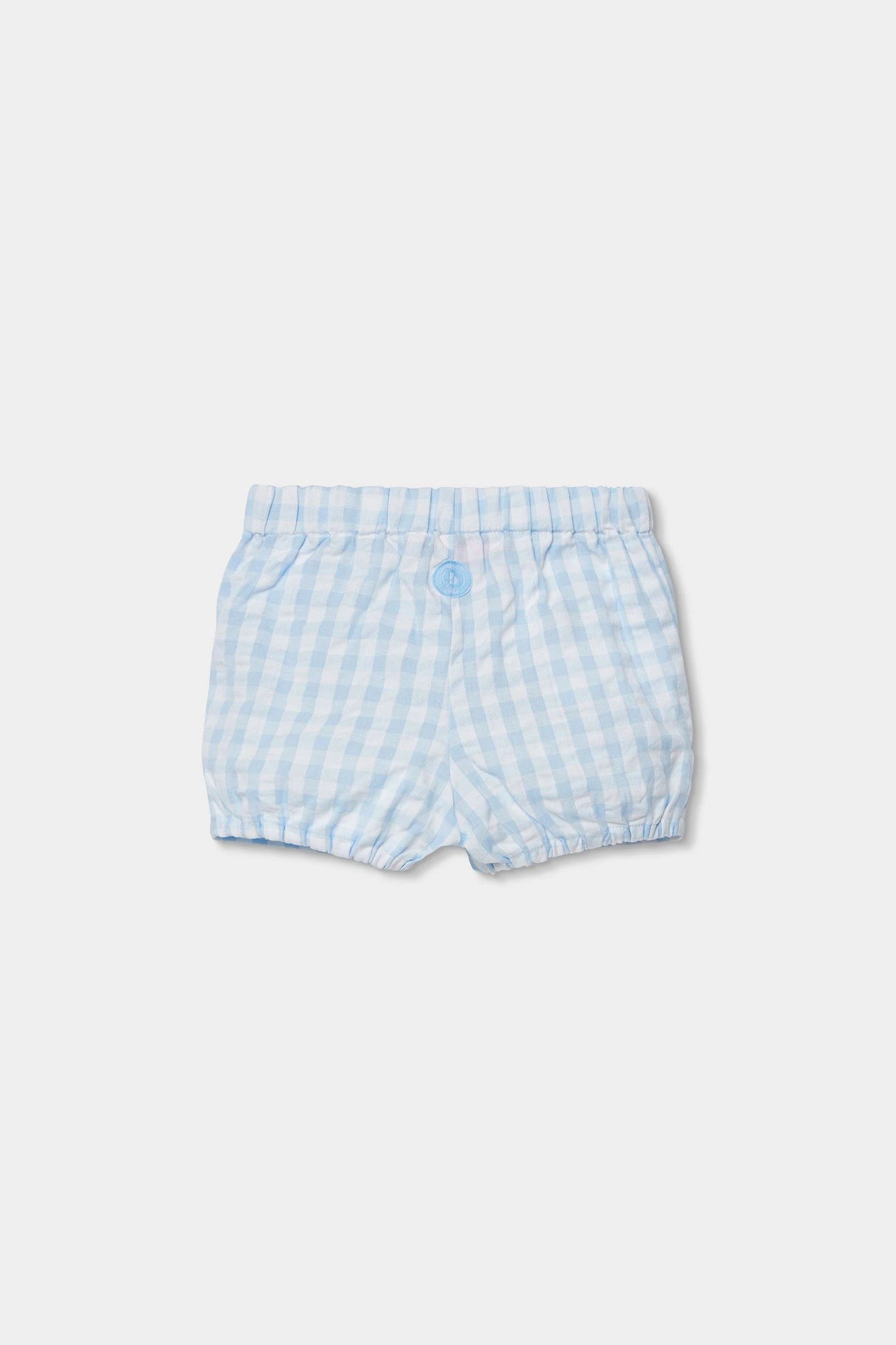 Conjunto de malha de algodão para bebé, ideal para os mais pequenos. Com um design de quadros azuis e brancos, inclui uma camisola branca com gola redonda e um colete incorporado com botões decorativos. Os calções a condizer completam o conjunto. Está disponível em tamanhos desde 1 mês até 2 anos, adaptando-se ao crescimento do seu bebé. Perfeito para ocasiões especiais, o seu material garante suavidade e conforto. A cor azul dos quadros acrescenta um toque clássico e elegante.