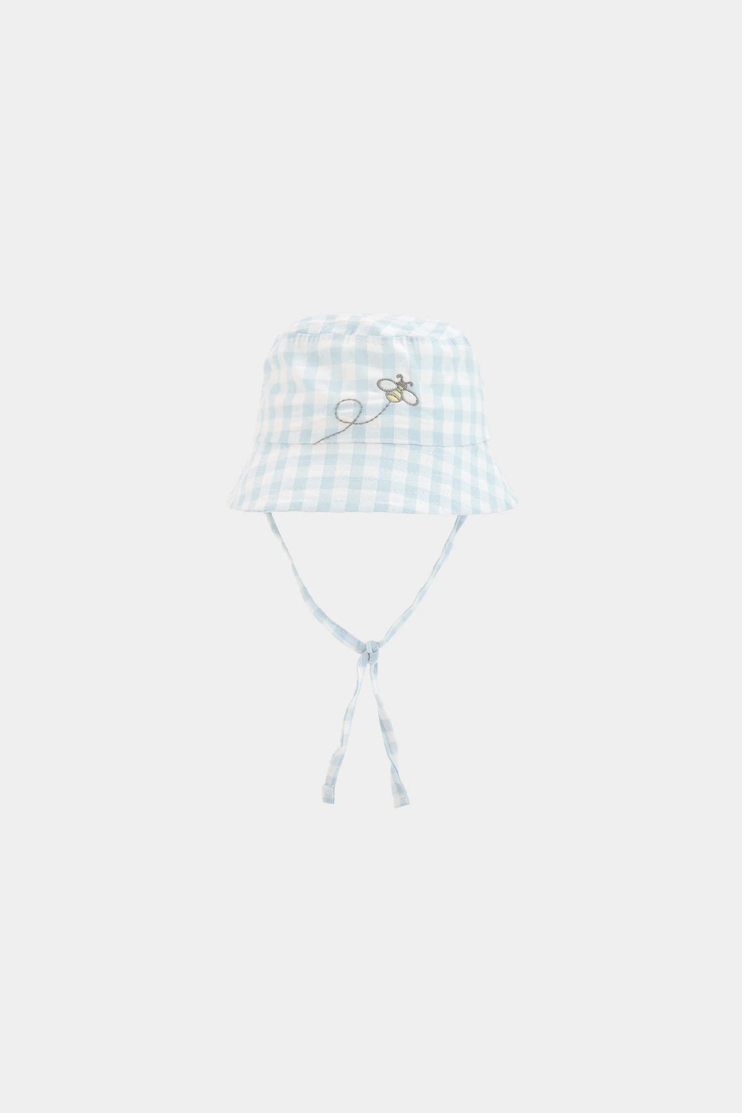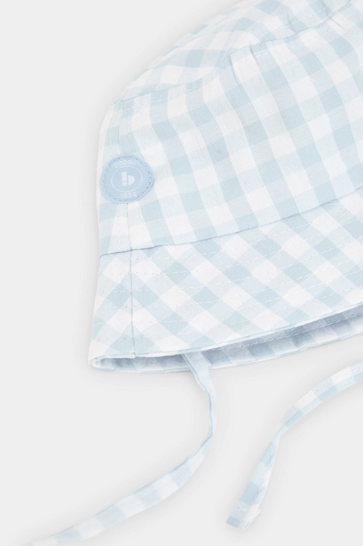 Chapéu de popeline com xadrez ideal para proteger os mais pequenos do sol. Decorado com um subtil bordado de abelha, acrescenta um detalhe encantador. O material de popeline é leve e respirável, perfeito para manter o conforto. Adequado para idades de 0 meses a 2 anos, disponível em tamanhos XXS a M. De cor azul claro com xadrez que oferece um toque clássico e elegante. Ideal para combinar com conjuntos de verão, adicionando estilo e funcionalidade ao traje do seu pequeno.