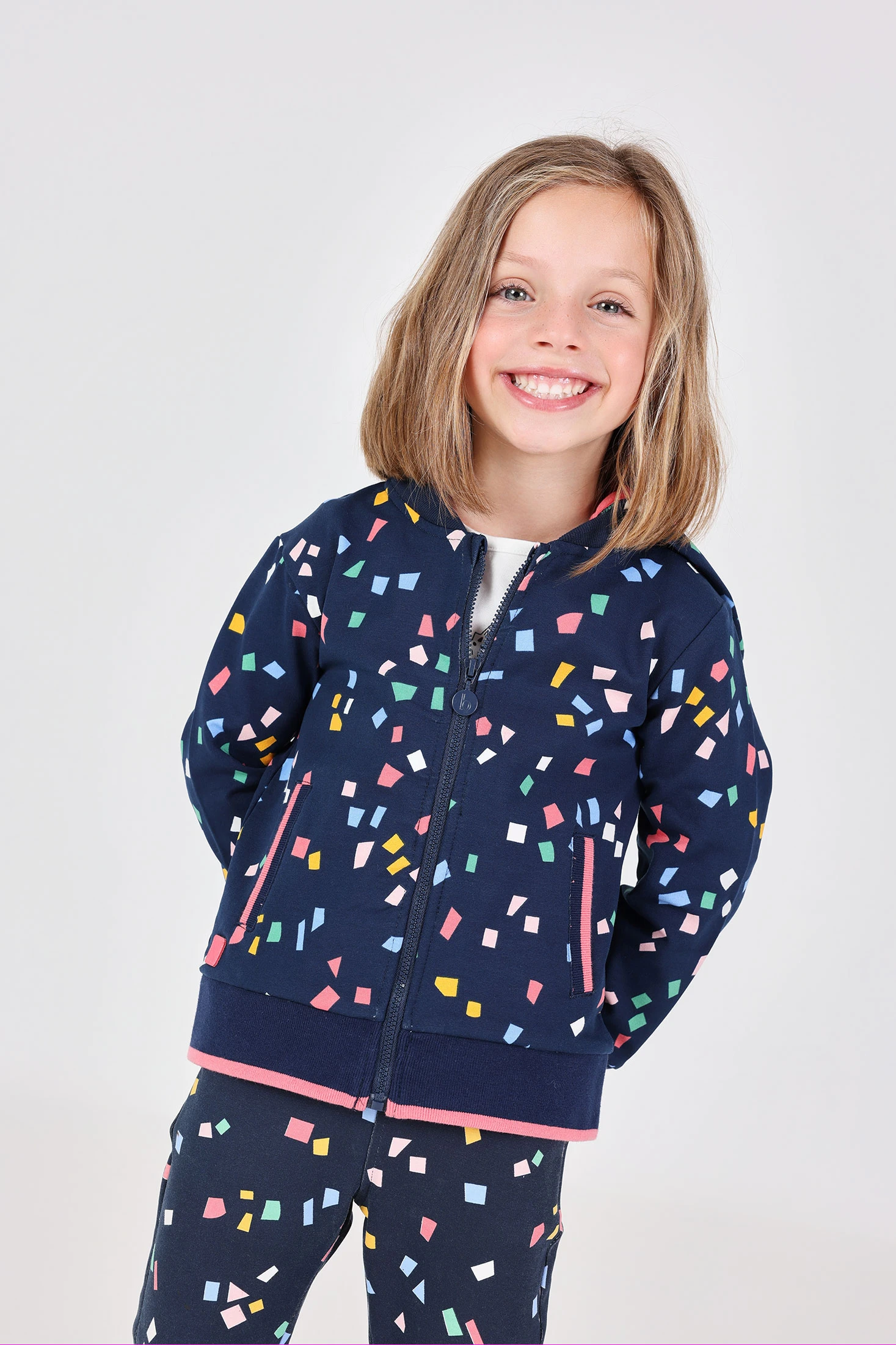 Casaco de pelfa para menina em cor marinho com design geométrico, perfeito para manter o seu pequeno confortável e aquecido durante as temporadas de outono e inverno. Confeccionado com um tecido suave e quente, garante o bem-estar do bebé durante o seu uso. Disponível em tamanhos desde 12 meses a 10 anos, oferece versatilidade e estilo, combinando perfeitamente com calças ou saias. Ideal para criar um look encantador e funcional para qualquer ocasião.
