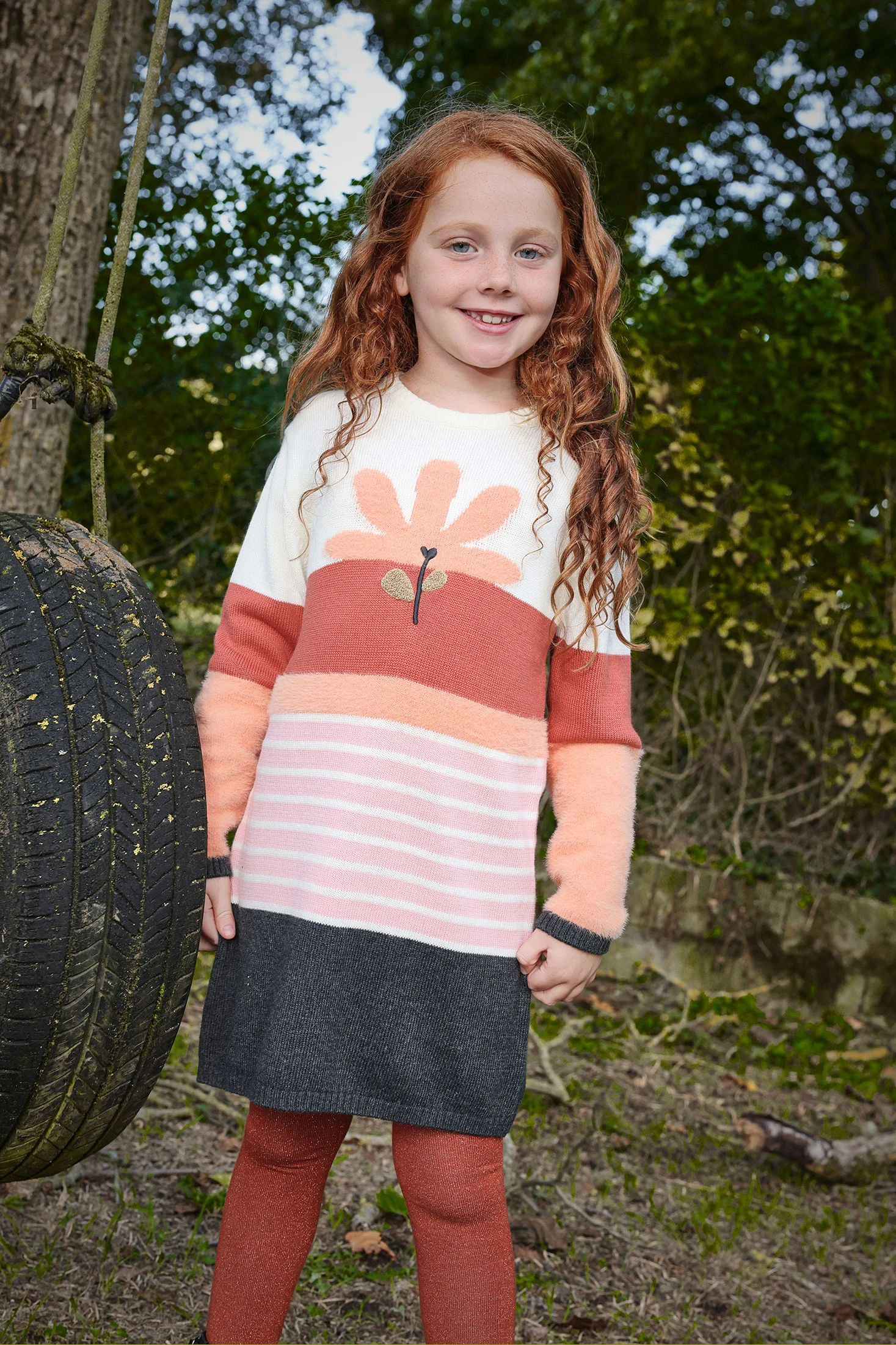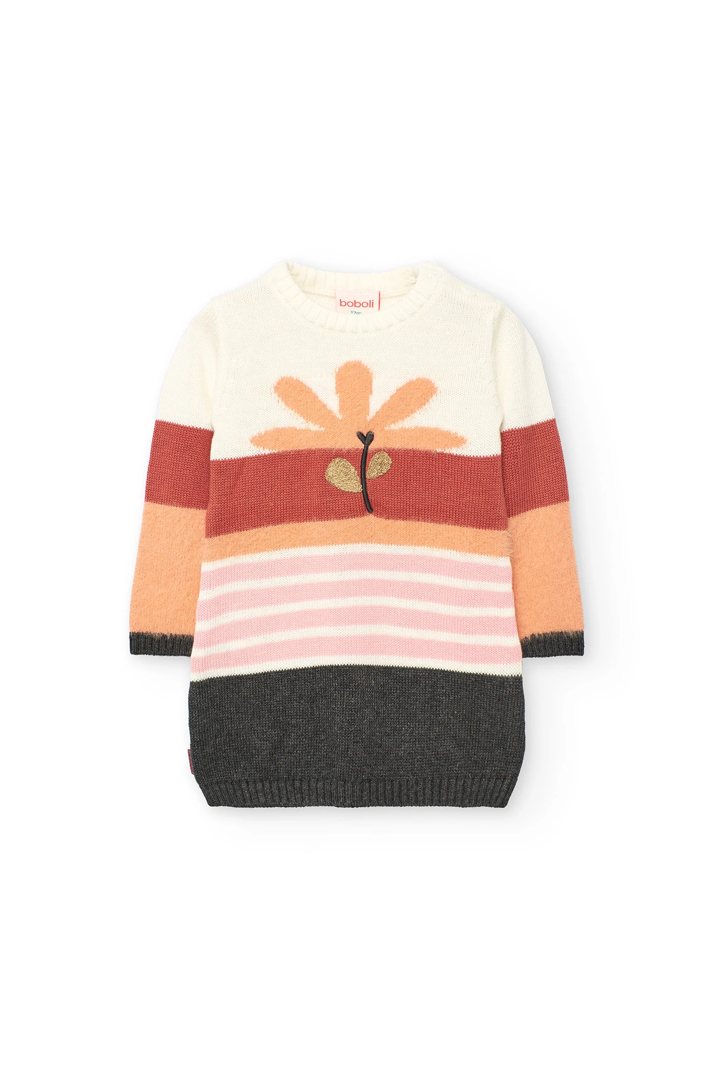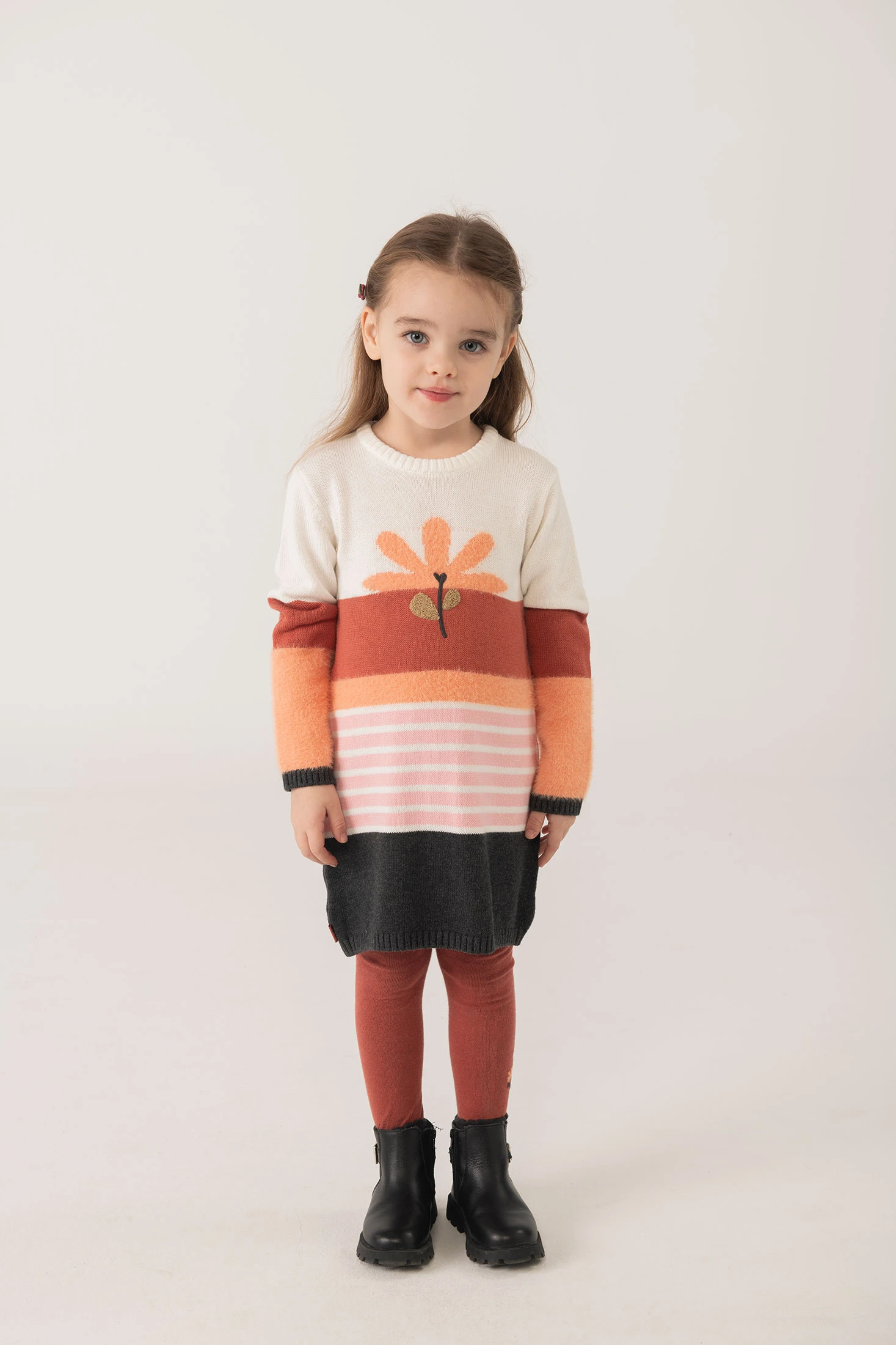 Vestido de menina apresenta uma alegre estampa floral em tons de creme, bordô, laranja e rosa. Ideal para as estações de outono e inverno, proporciona calor e conforto graças ao seu suave material de malha. Desenhado com gola redonda e manga comprida, este vestido oferece estilo e funcionalidade, mantendo a sua pequena aquecida e confortável. Disponível em tamanhos de 12 meses a 10 anos, torna-se uma escolha versátil para o guarda-roupa da sua bebé. Combina perfeitamente com collants ou casaquinhos de cores sólidas para destacar o seu encantador design floral.
