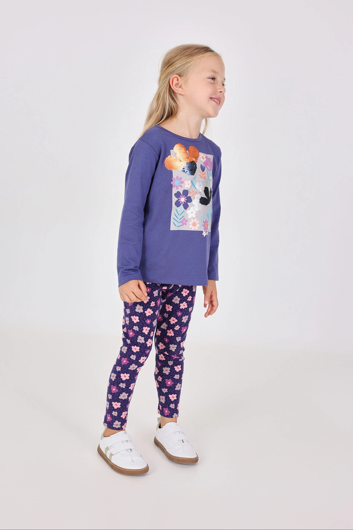 Leggings de menina confeccionados em malha de cor lilás com um encantador estampado de flores, ideais para as estações de outono e inverno. Fabricados num tecido elástico, asseguram conforto e liberdade de movimento para os mais pequenos. Disponíveis em tamanhos desde 12 meses até 10 anos, são perfeitos para combinar com camisetas e suéteres lisos, oferecendo um conjunto alegre e moderno para qualquer ocasião.