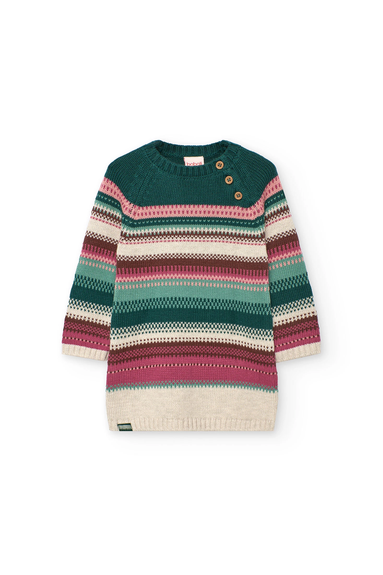 Vestido de malha ideal para meninas nos meses de outono e inverno, proporciona calor e estilo com as suas encantadoras riscas em tons verdes. Com um design de gola redonda e mangas compridas, assegura conforto em climas frios, enquanto os botões decorativos no ombro adicionam um toque elegante. Disponível em tamanhos desde 12 meses até 10 anos, é perfeito para qualquer ocasião, desde o dia a dia até eventos especiais. Fabricado em um material de malha macio e durável, é adequado para uso frequente durante toda a temporada. Combine-o com meias opacas e botas para um visual completo e acolhedor.