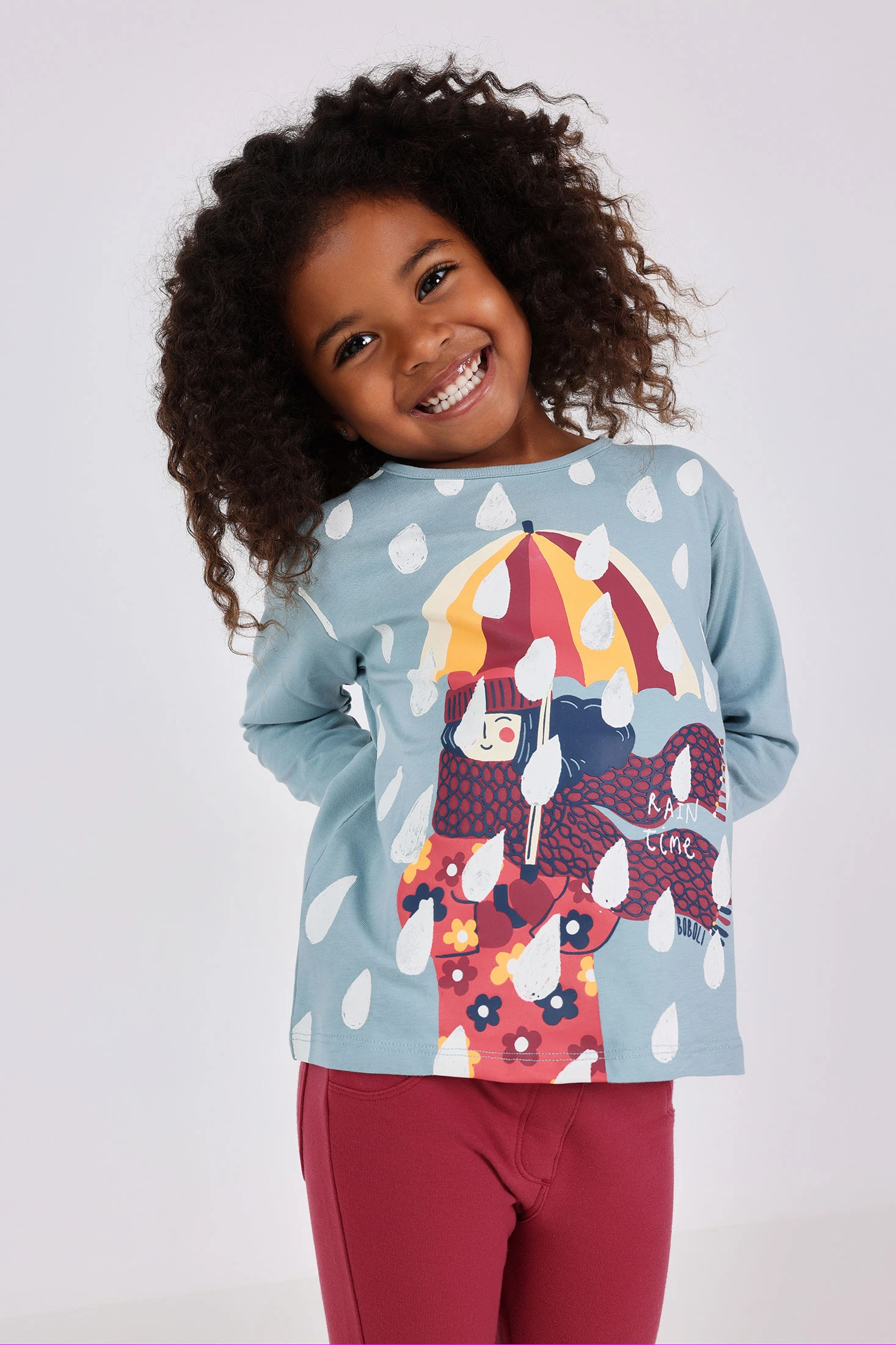 T-shirt de malha verde para menina, perfeita para o outono e inverno, exibe uma estampa de gotas de chuva que traz alegria e originalidade. Fabricada com um tecido suave e acolhedor, esta peça de manga comprida e gola redonda garante conforto e calor durante os dias frescos. Disponível em tamanhos de 2 a 10 anos, pode ser facilmente combinada com jeans ou calças casuais para um look encantador e prático. Ideal para adicionar um toque de cor nos dias mais cinzentos, é uma excelente escolha para o guarda-roupa infantil.