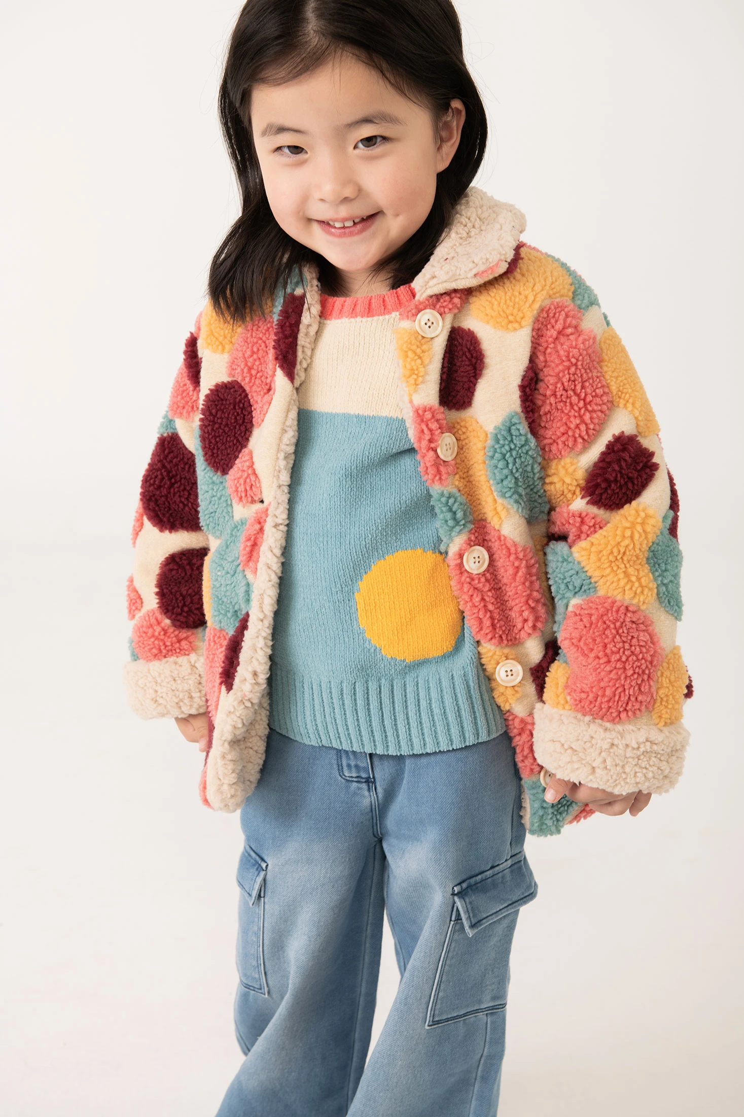 Casaco de lã para menina ideal para os dias mais frios do ano. Este casaco é feito de lã de alta qualidade com círculos em várias cores, proporcionando calor e estilo. Projetado com fecho de botões na parte frontal, facilita a sua colocação. Disponível em tamanhos de 12 meses a 10 anos, combina perfeitamente com calças ou vestidos, criando um conjunto elegante e acolhedor para as saídas de inverno.