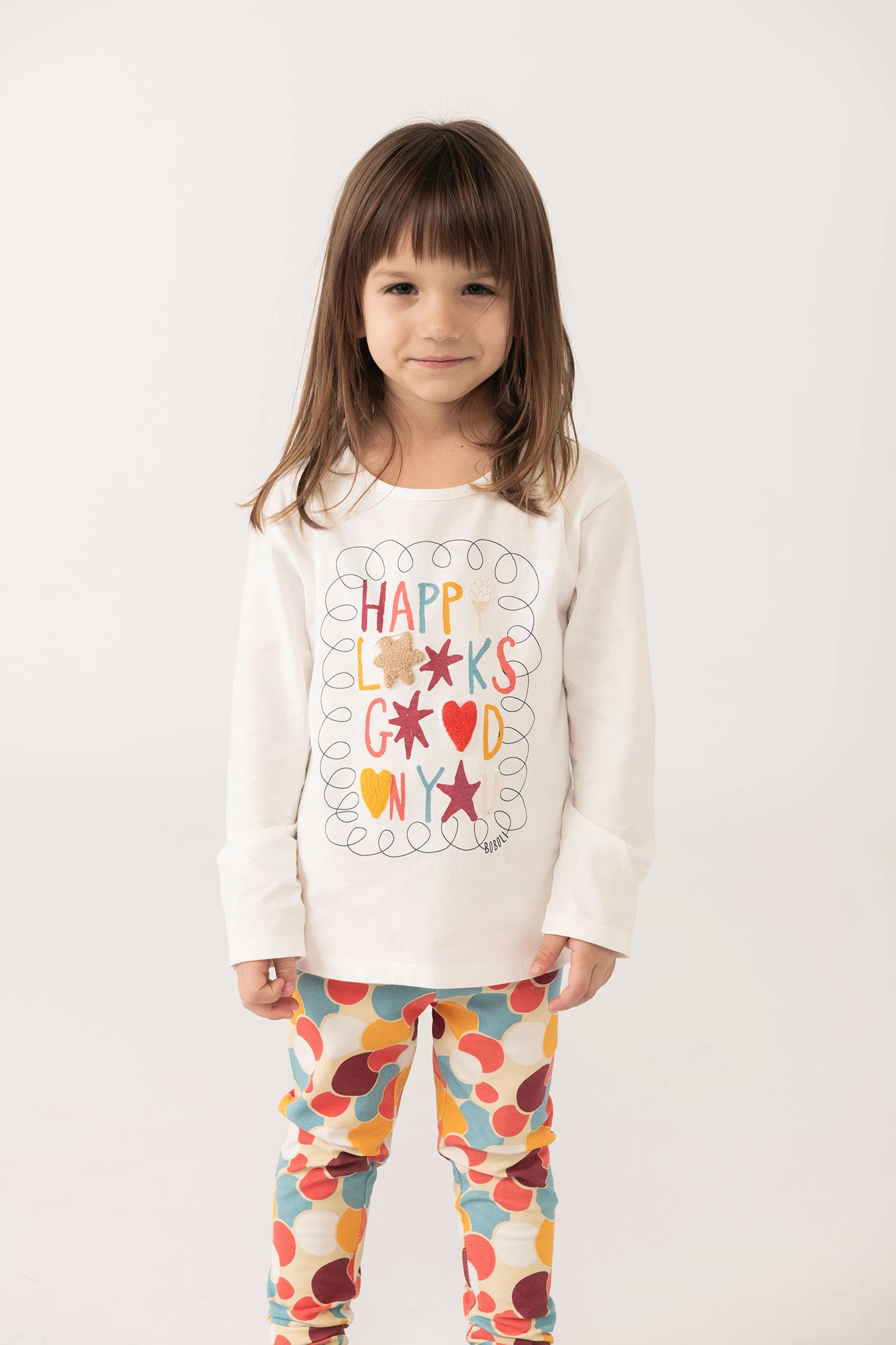 T-shirt de malha para menina em cor branca, perfeita para os dias quentes graças ao seu tecido suave e respirável. Adorável design de letras na parte frontal, acompanhado de detalhes coloridos que trazem alegria e estilo. A gola redonda proporciona um ajuste confortável, e está disponível em tamanhos desde 12 meses até 10 anos. Ideal para combinar com jeans, saias ou calções, garante conforto e versatilidade no guarda-roupa diário da sua pequena.