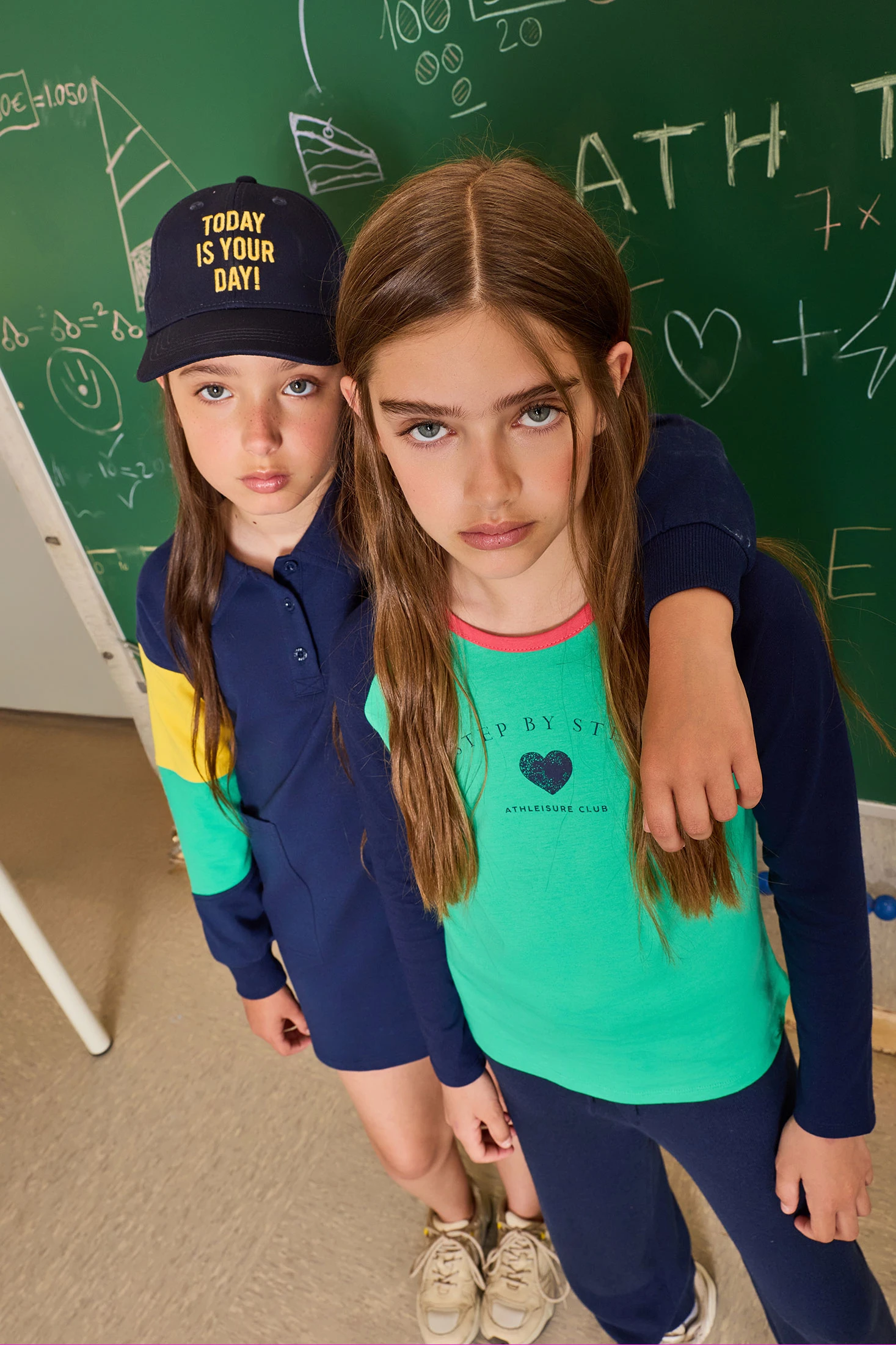 T-shirt de malha azul marinho para menina, ideal para as estações de outono e inverno. Confecionada em tecido de malha suave, garante conforto e calor. Estampado chamativo de letras na frente acrescenta um toque moderno ao design. Perfeita para combinar com calças ou saias em tons claros, conseguindo um conjunto versátil e moderno. Disponível em tamanhos dos 2 aos 14 anos.