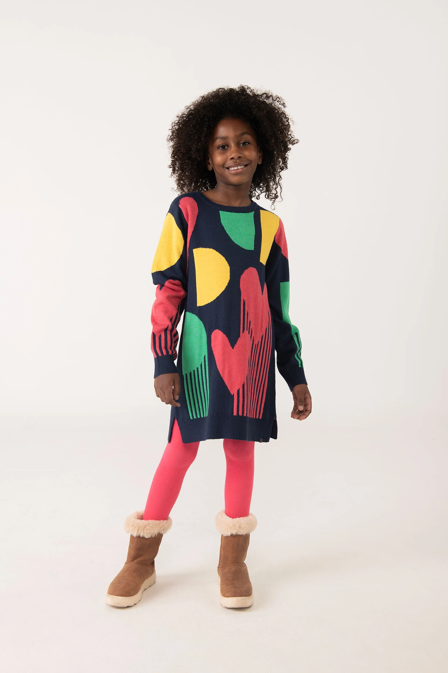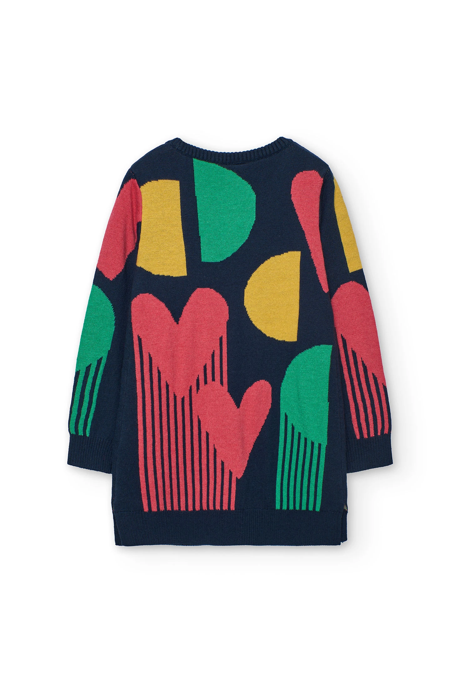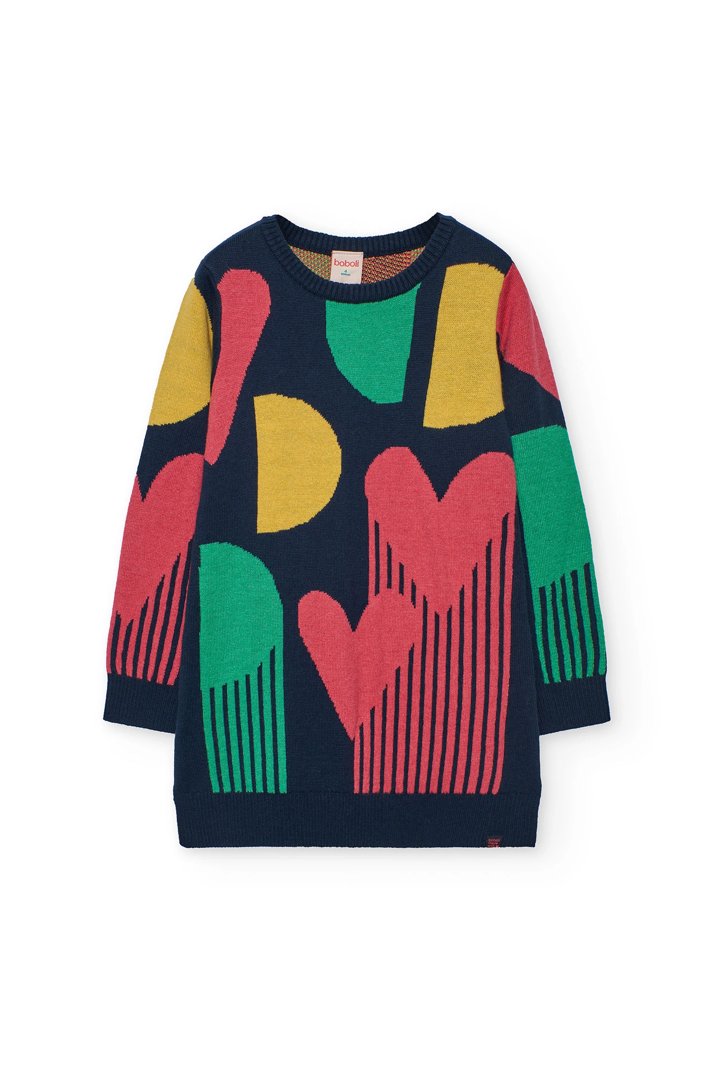 Vestido de malha em azul-marinho, perfeito para as estações de outono e inverno, oferecendo calor e estilo a meninas. Confecionado num tecido confortável, apresenta um elegante design geométrico em tons contrastantes que lhe conferem um toque moderno e sofisticado. O seu decote redondo e mangas compridas asseguram um ajuste confortável em dias frios. Disponível em tamanhos desde 2 até 14 anos, combina facilmente com collants ou leggings, adaptando-se a diversas ocasiões. Seja para saídas casuais ou eventos mais formais, este vestido é uma adição essencial ao guarda-roupa infantil.