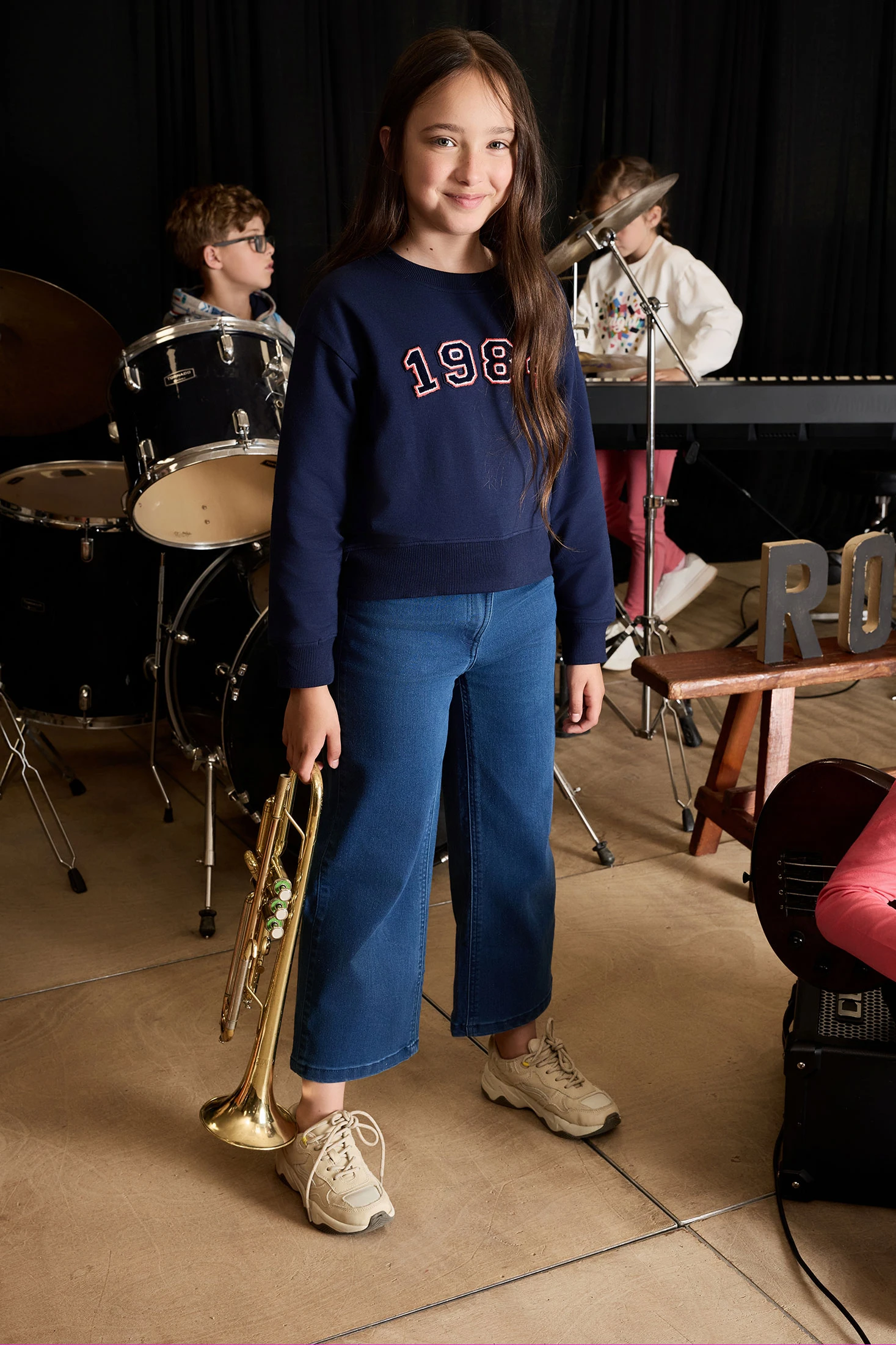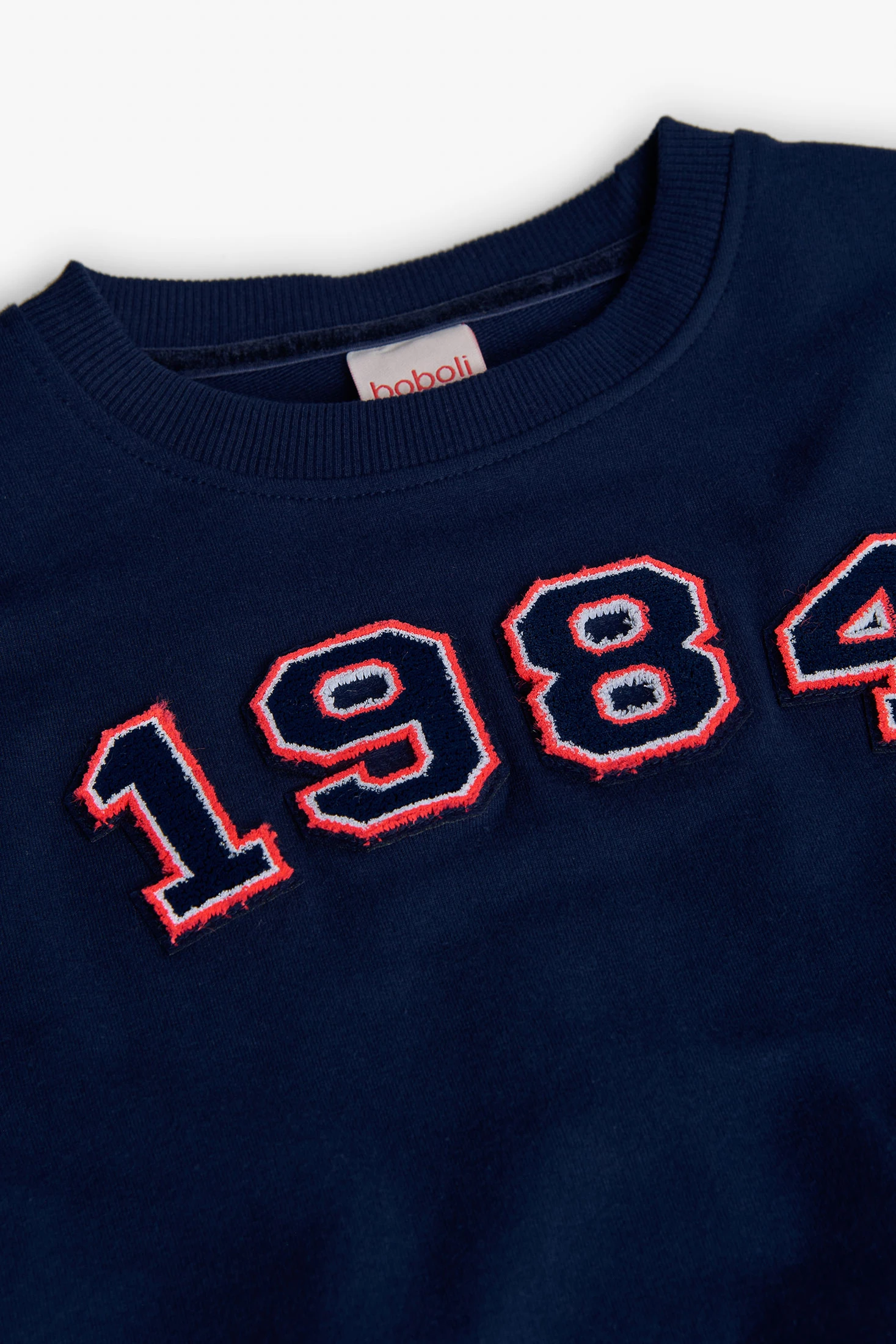 Sweatshirt de pelfa azul-marinho para menina, ideal para os meses de outono e inverno graças ao seu tecido quente e suave que assegura conforto durante todo o dia. Design com gola redonda e mangas compridas que protegem do frio sem comprometer o estilo, acompanhada por uma estampa frontal do número "1984" que aporta um toque retro único. Disponível em tamanhos para meninas de 2 a 14 anos, esta sweatshirt combina perfeitamente com jeans ou calças casuais, criando um conjunto versátil e moderno.
