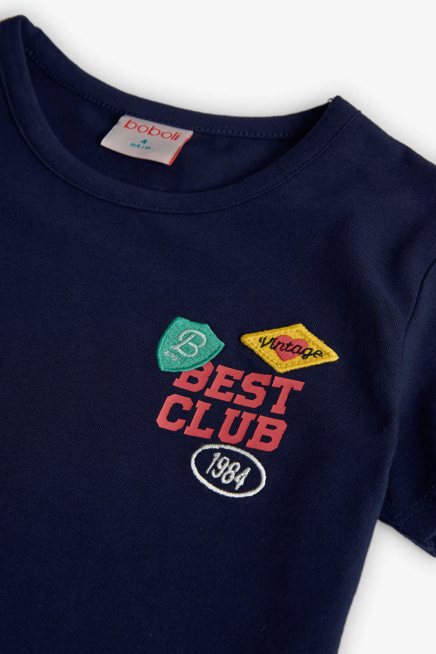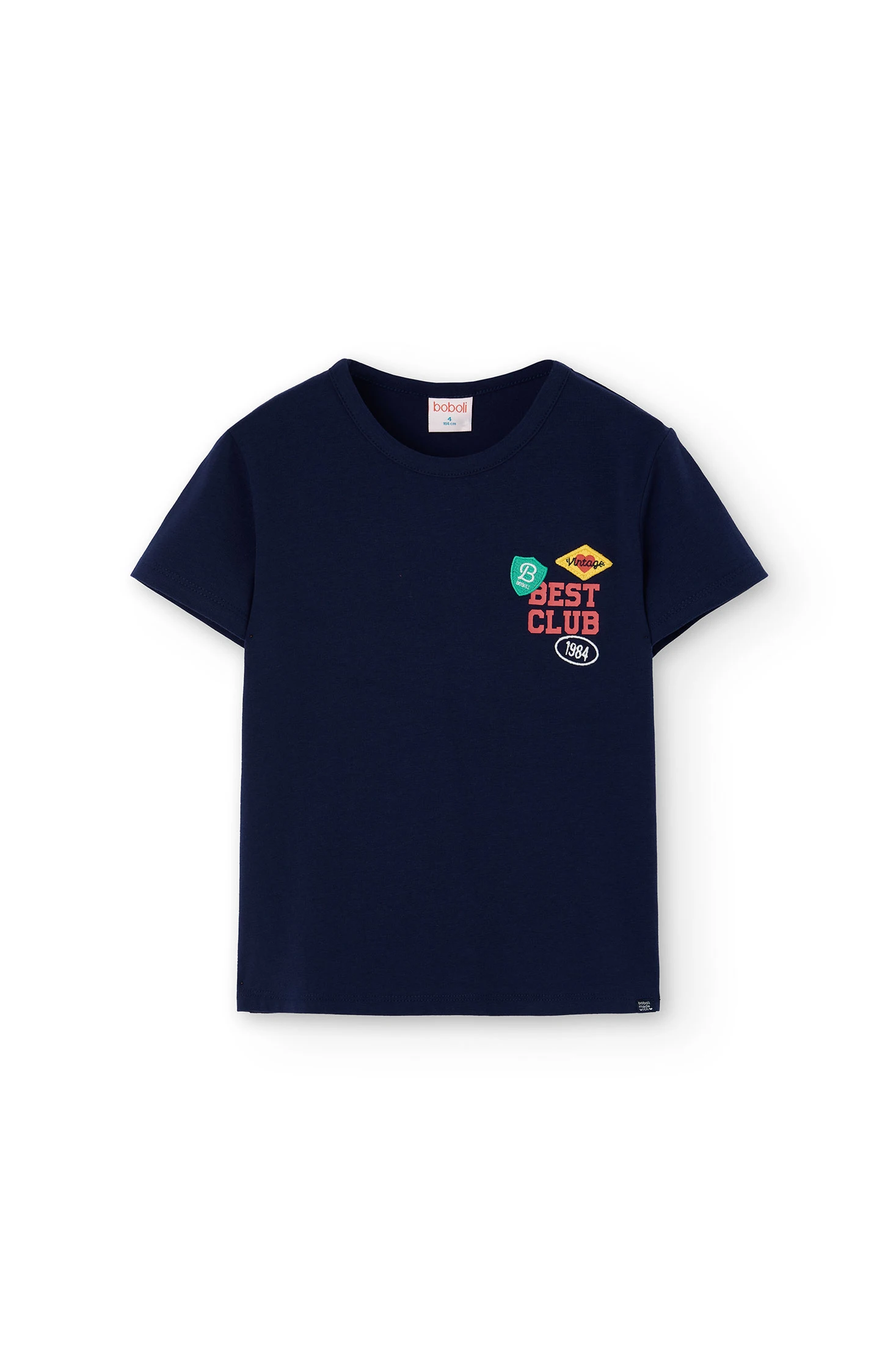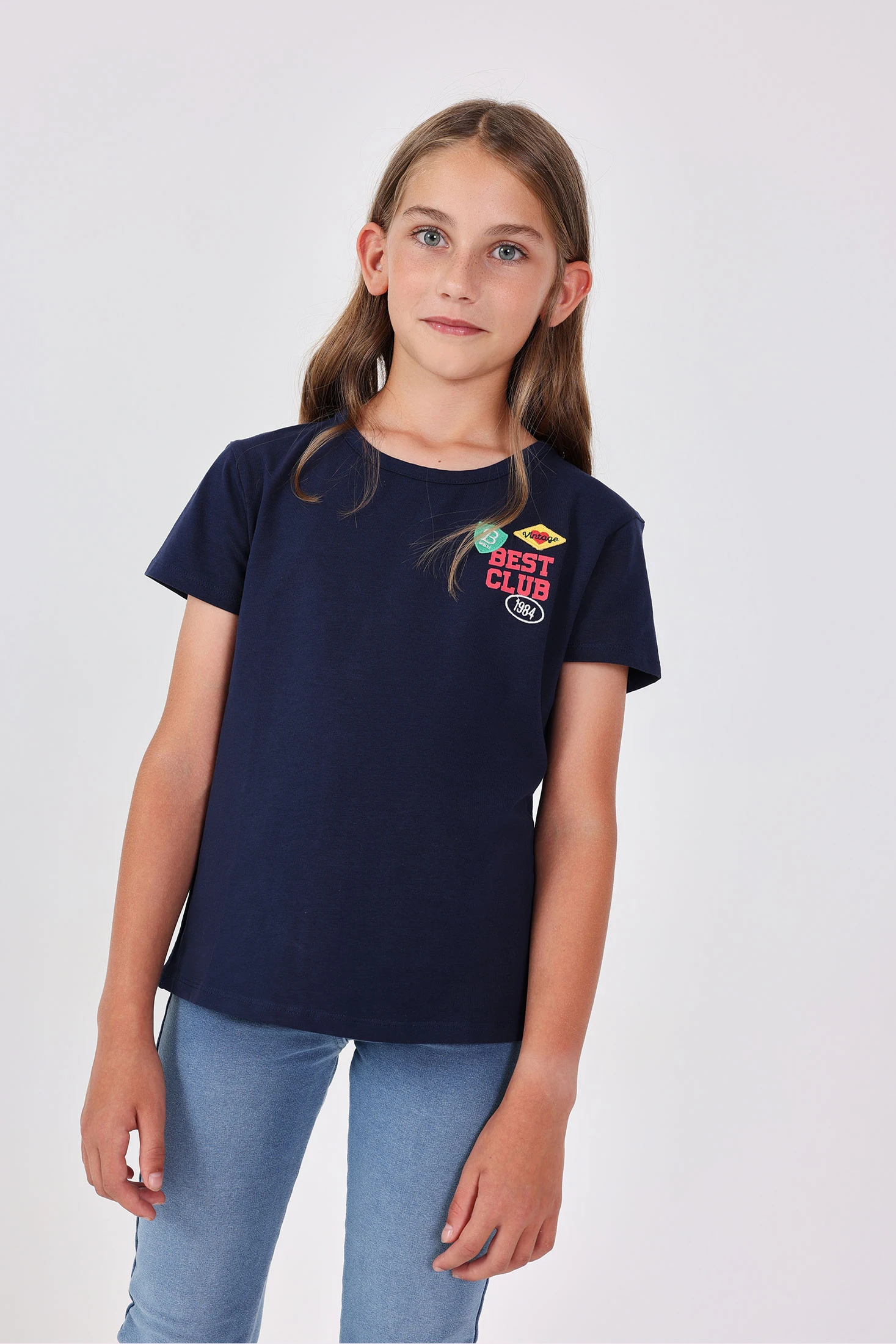 T-shirt de malha azul marinho para menina, versátil e confortável para o uso diário, confeccionada em um tecido de malha suave que garante liberdade de movimento, ideal para as pequenas aventureiras. O seu design inclui um encantador detalhe de escudos coloridos no peito, que adiciona um toque divertido e único. Disponível nos tamanhos de 2 a 14, combina facilmente com calças, saias ou calções, adaptando-se a qualquer estação. Com a sua gola redonda clássica, esta peça tornar-se-á um básico prático e estiloso no guarda-roupa infantil.