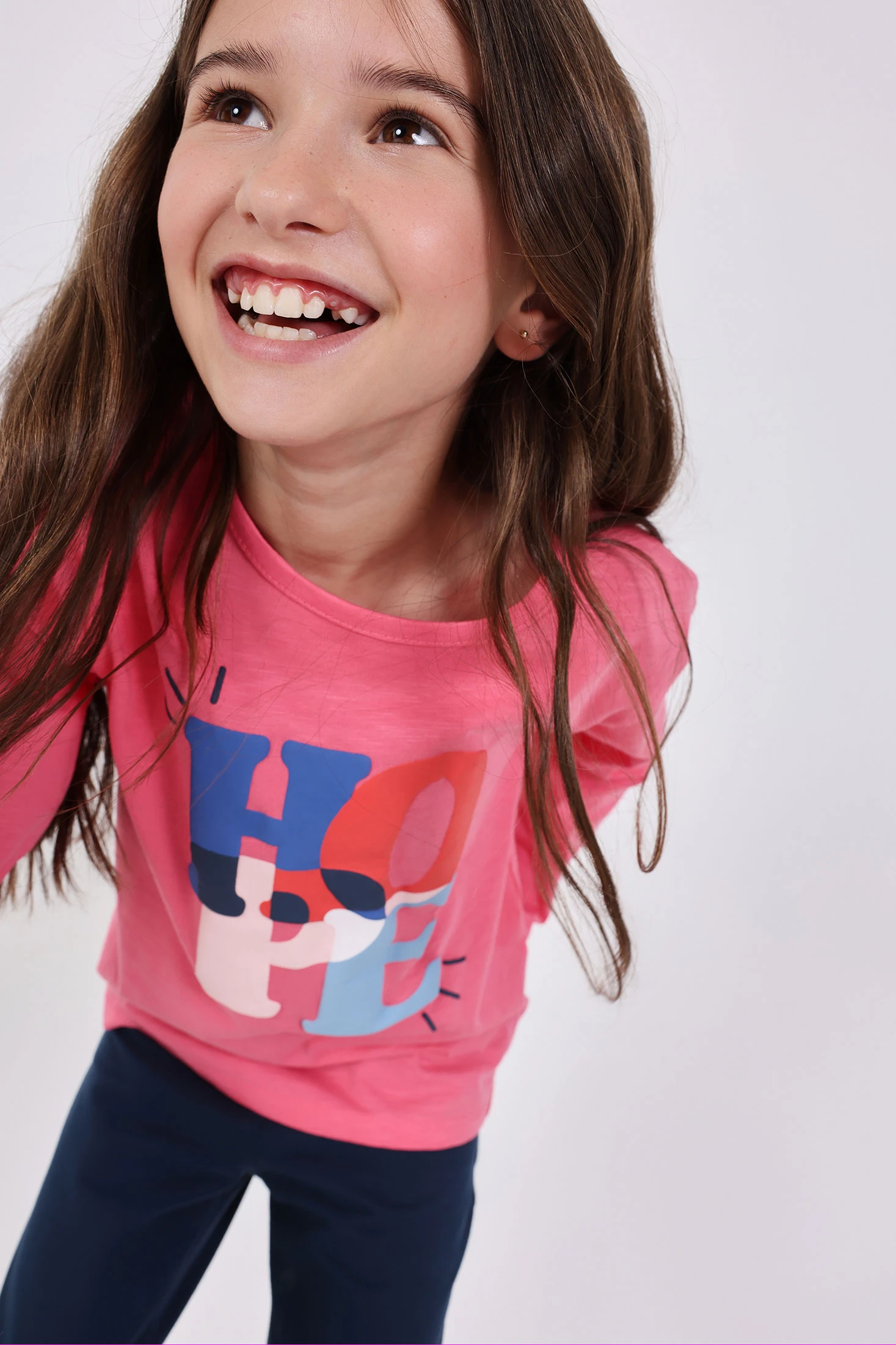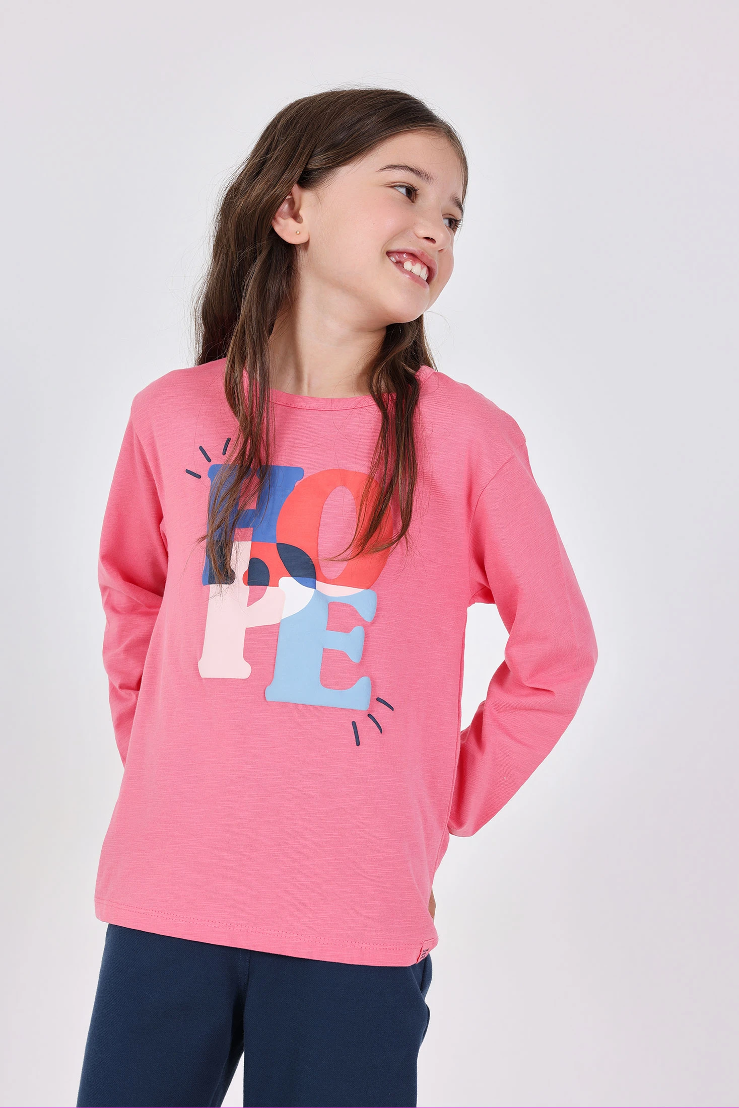 T-shirt de malha para meninas em cor rosa, ideal para qualquer estação, apresenta uma delicada estampa de letras que combina azul-marinho, coral e azul-claro, trazendo um toque alegre e moderno ao guarda-roupa infantil. Confeccionada num tecido suave, oferece conforto para o uso diário. Desenhada com mangas compridas e gola redonda, é perfeita para manter as pequenas aquecidas nos dias mais frescos. Disponível em tamanhos de 2 a 14 anos, pode ser facilmente combinada com calças ou saias para criar um conjunto encantador e versátil.