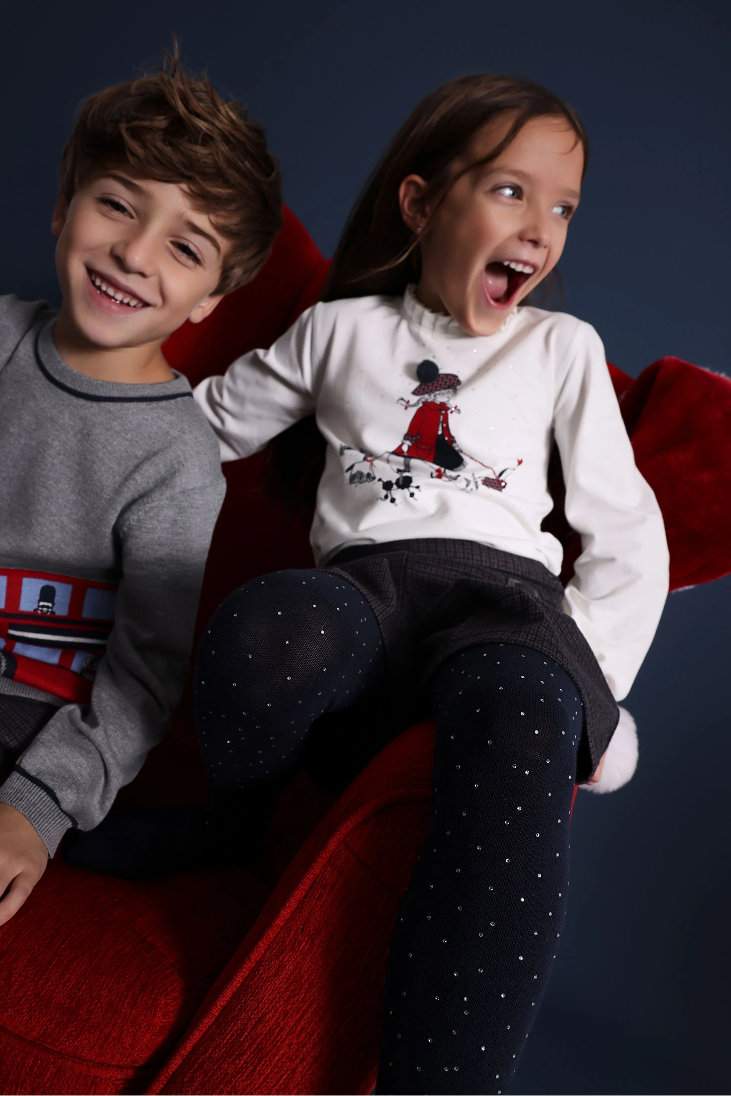 Collants de malha em azul-marinho com pequenas pedras dão um toque de elegância e brilho. Confeccionados com um tecido suave e elástico, garantem conforto e liberdade de movimento para as mais pequenas. Disponíveis em tamanhos desde os 12 meses até aos 10 anos, são perfeitos para combinar com vestidos ou saias, oferecendo uma opção versátil para todo o ano. Acessório essencial que mantém as meninas quentes e elegantes durante os meses mais frios.