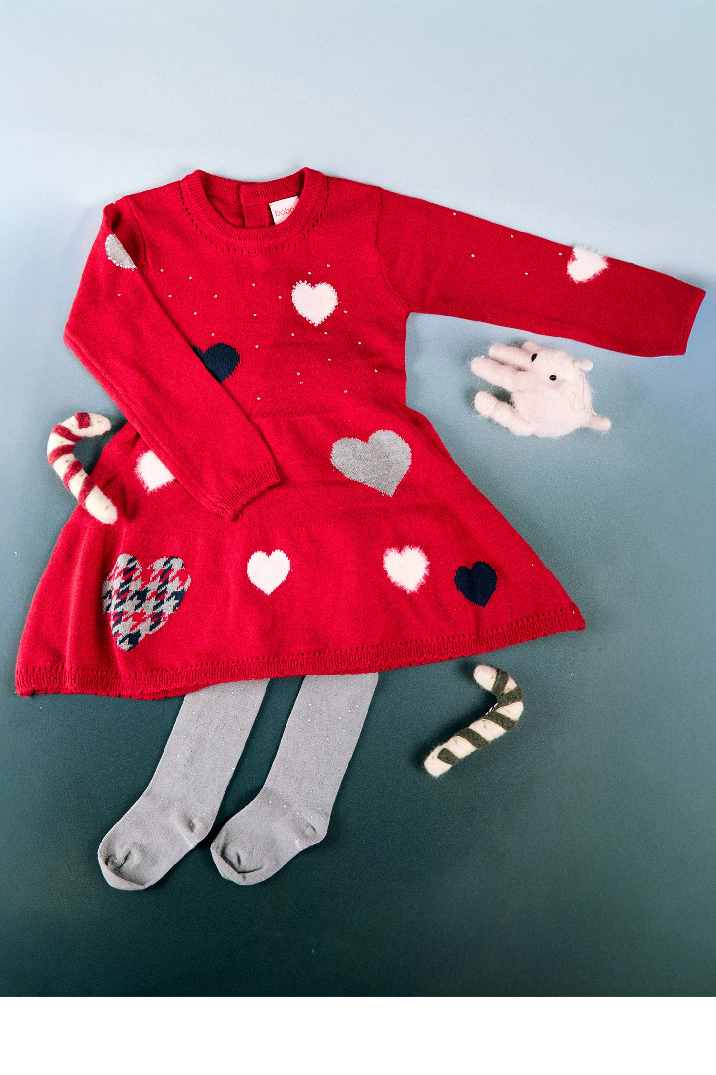 Vestido de malha em cor granada, desenhado com encantadores corações, é perfeito para a temporada outono-inverno. Feito com materiais suaves, oferece calor e estilo, com uma gola redonda e mangas compridas para maior conforto. Disponível em tamanhos desde 12 meses até 10 anos, pode ser facilmente combinado com collants para criar um look adorável em qualquer ocasião, seja especial ou para o uso diário. Ideal para pais que procuram um estilo encantador e confortável para os seus pequenos.