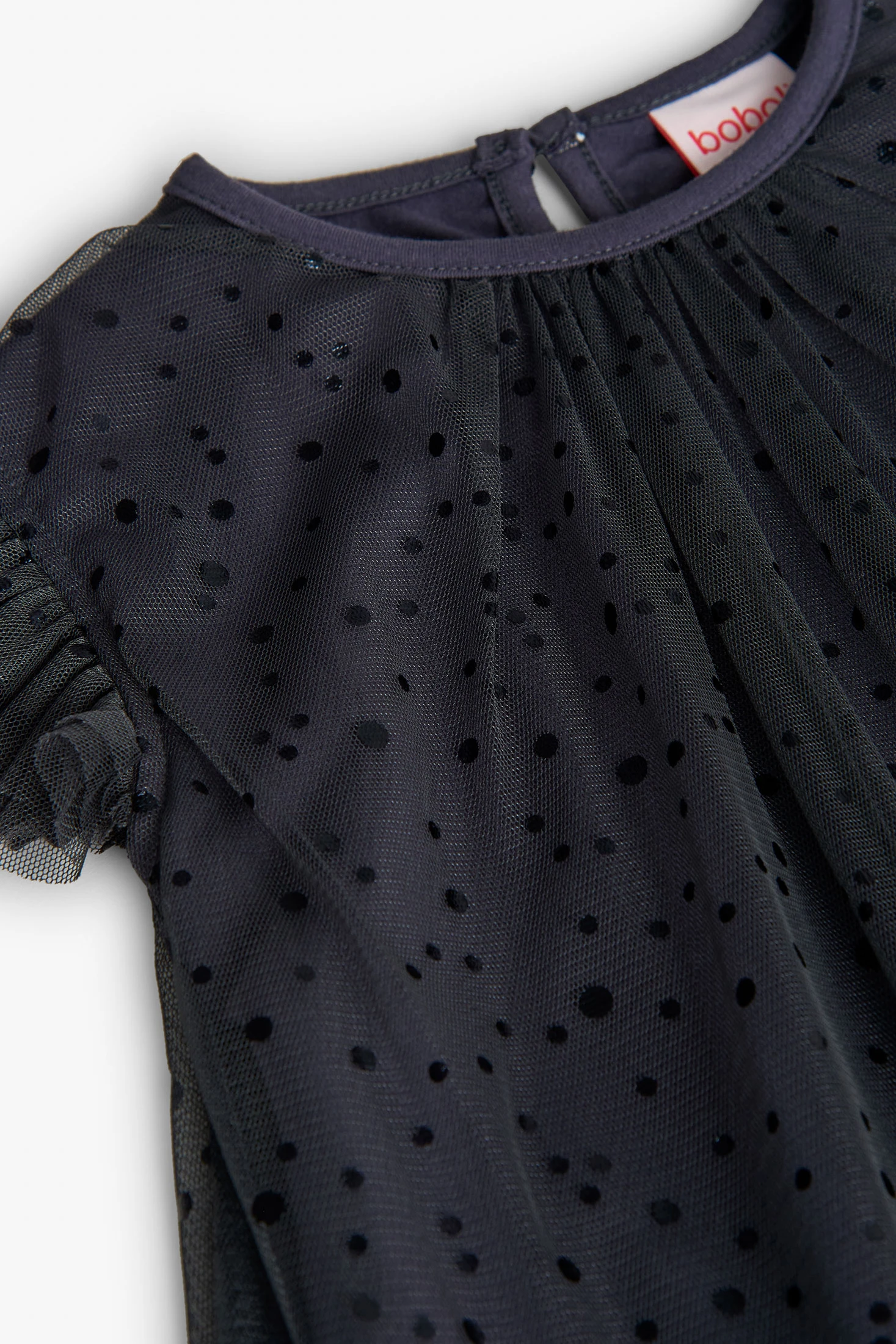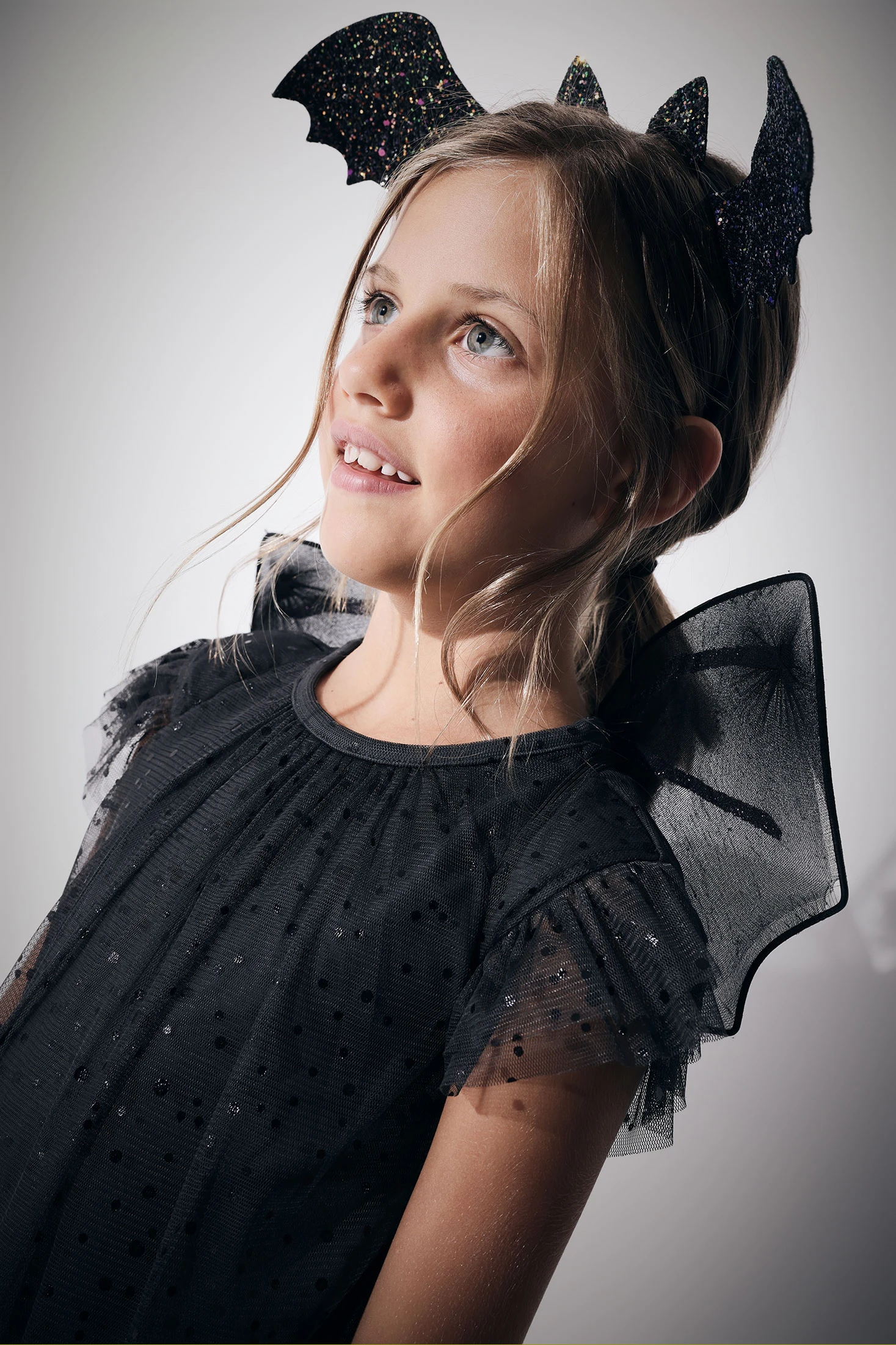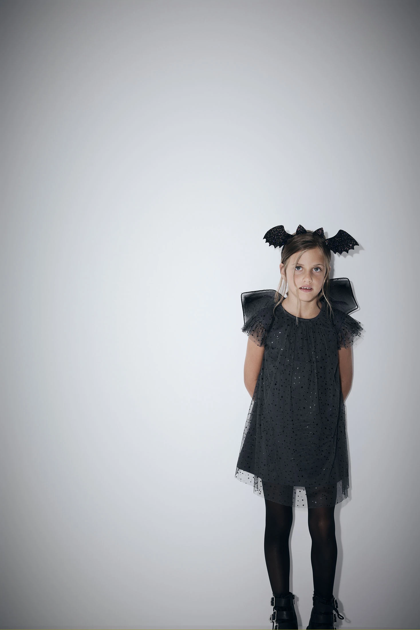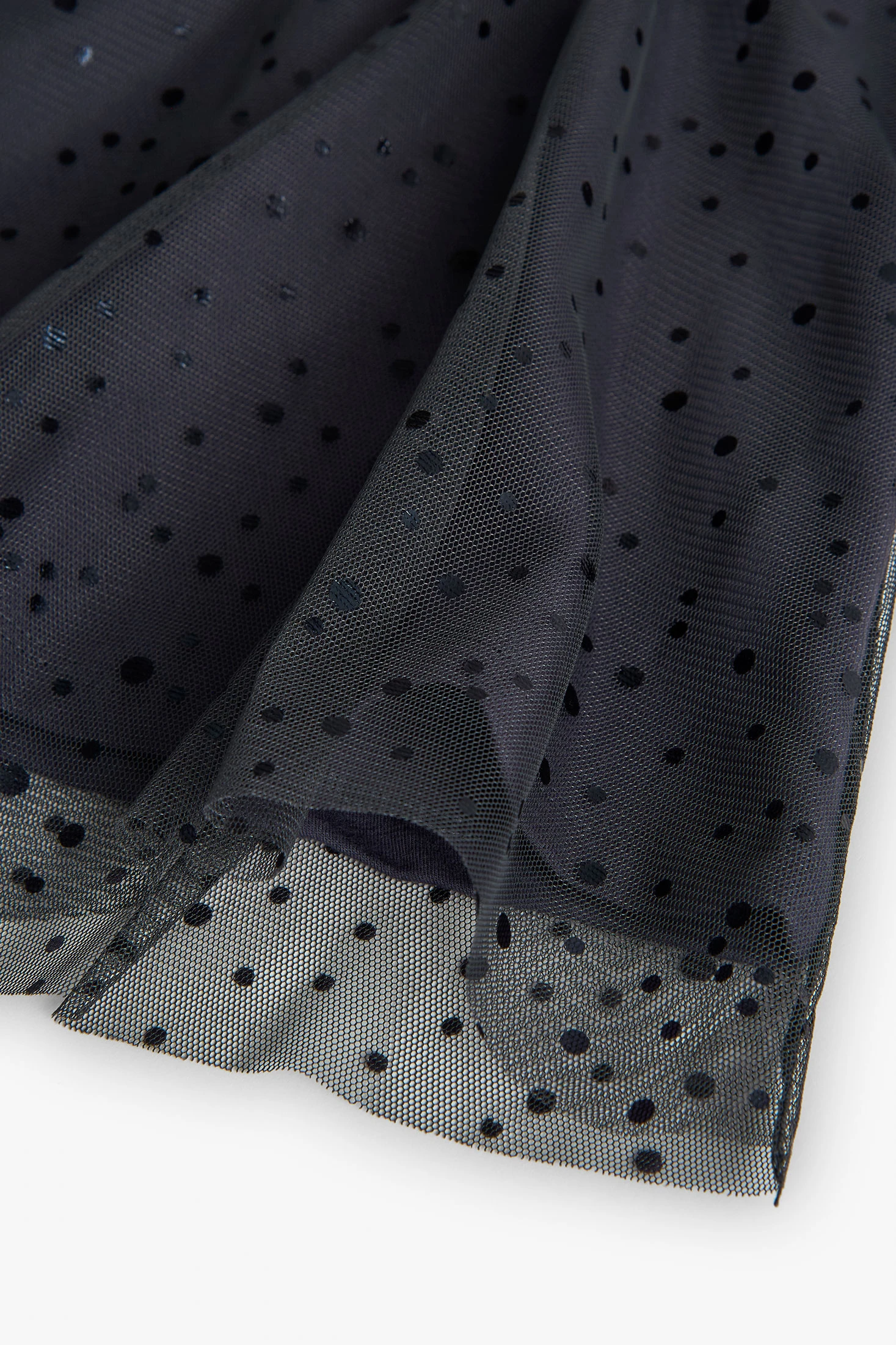 Vestido de tule para menina em cor preta com pontos brilhantes, perfeito para eventos especiais no outono e no inverno, oferece um toque de luxo e sofisticação. Fabricado com materiais confortáveis, apresenta mangas compridas de tule plissado que acrescentam elegância e uma gola redonda que garante um ajuste confortável. Disponível em tamanhos de 2 a 14 anos, combina perfeitamente com acessórios brilhantes para criar um estilo moderno e refinado em qualquer ocasião formal.