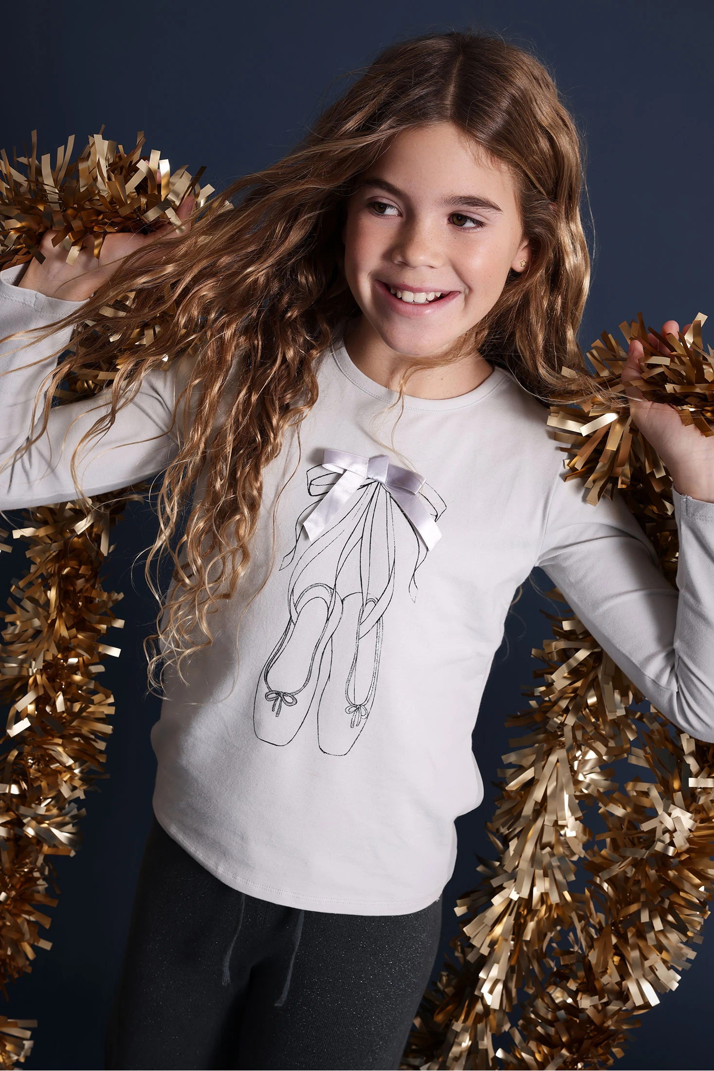 T-shirt para menina confeccionada em malha elástica de alta qualidade, desenhada para proporcionar conforto e flexibilidade em qualquer ocasião. Elegante tom cinza que se complementa perfeitamente com o detalhe de laços, adicionando um toque encantador para as temporadas de outono e inverno. Graças ao seu material em algodão suave, mantém as mais pequenas aquecidas sem comprometer o conforto. Disponível em tamanhos de 2 a 14 anos, é ideal para combinar com calças, leggings ou saias, permitindo criar looks tanto casuais como mais formais. Design de manga comprida e gola redonda que facilita a sua colocação, tornando-a numa opção prática para o dia a dia.
