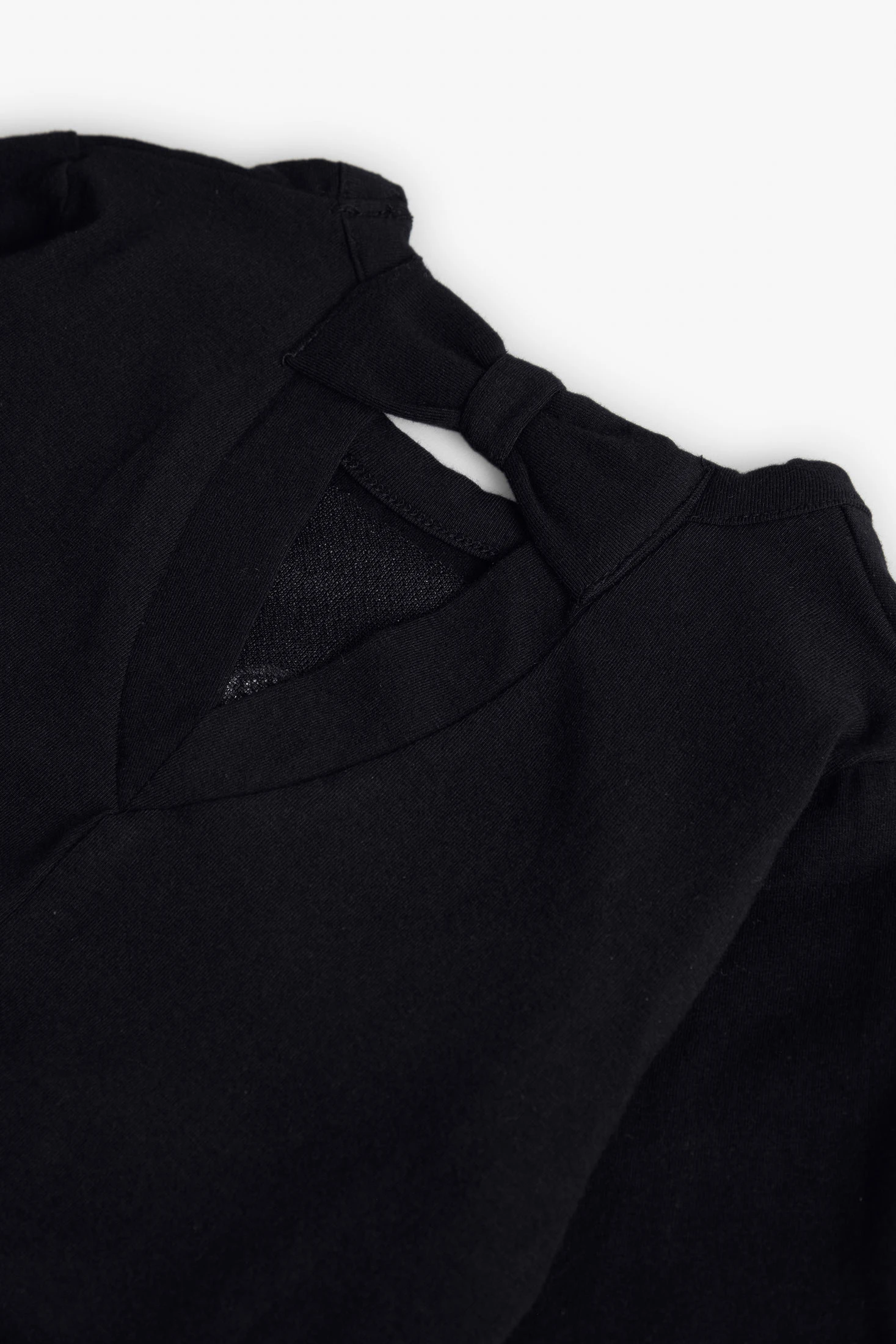 T-shirt de malha preta para menina, confeccionada em suave algodão, ideal para os meses de outono e inverno. Desenhada com mangas compridas e uma gola redonda, assegura conforto e aquecimento nos dias mais frios. Disponível em tamanhos de 2 a 14 anos, permite combinações versáteis com calças ou saias para um look casual e moderno. Os detalhes metálicos decorativos adicionam um toque de estilo, fazendo desta t-shirt uma opção moderna para o vestuário de qualquer menina.