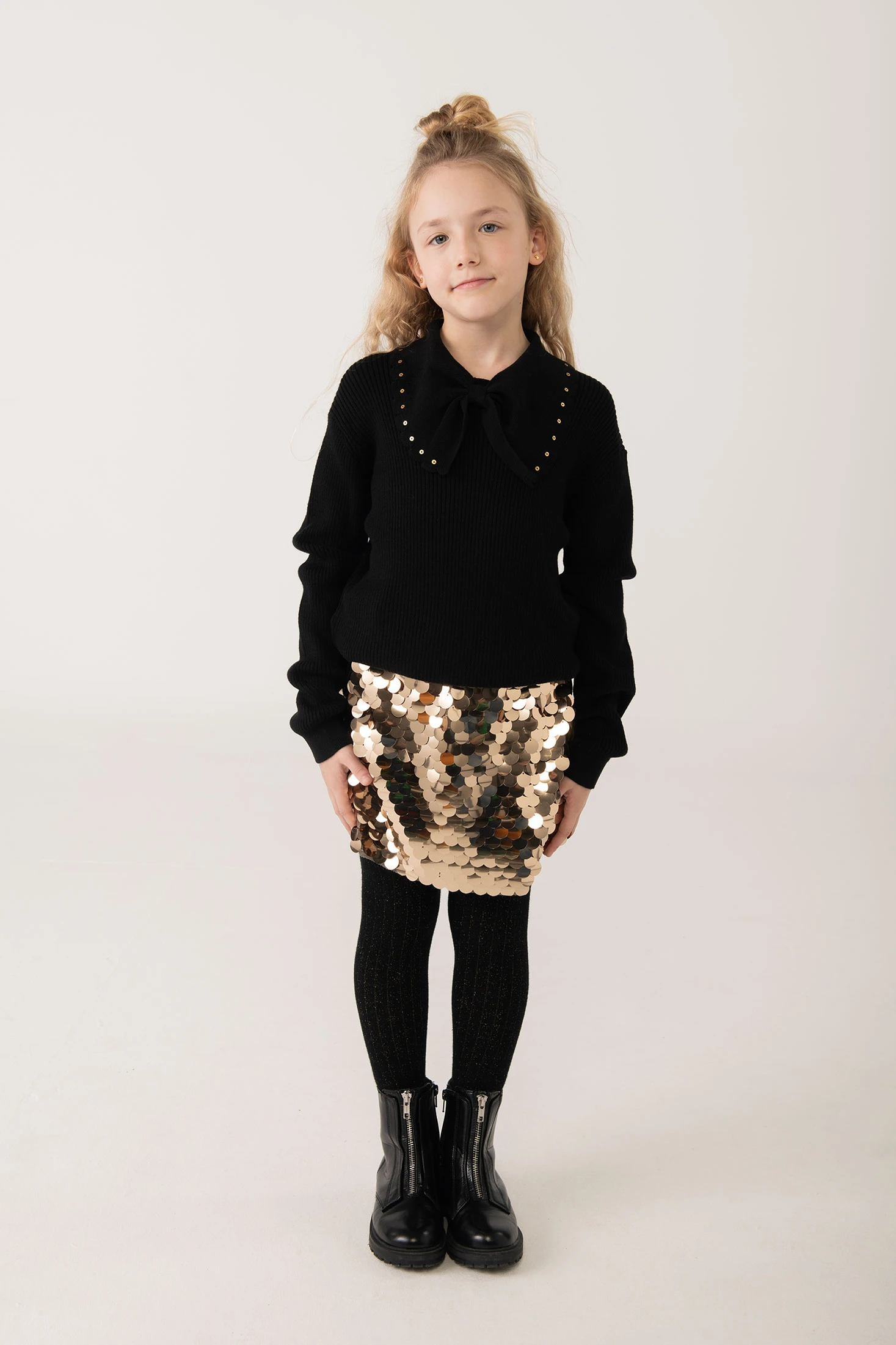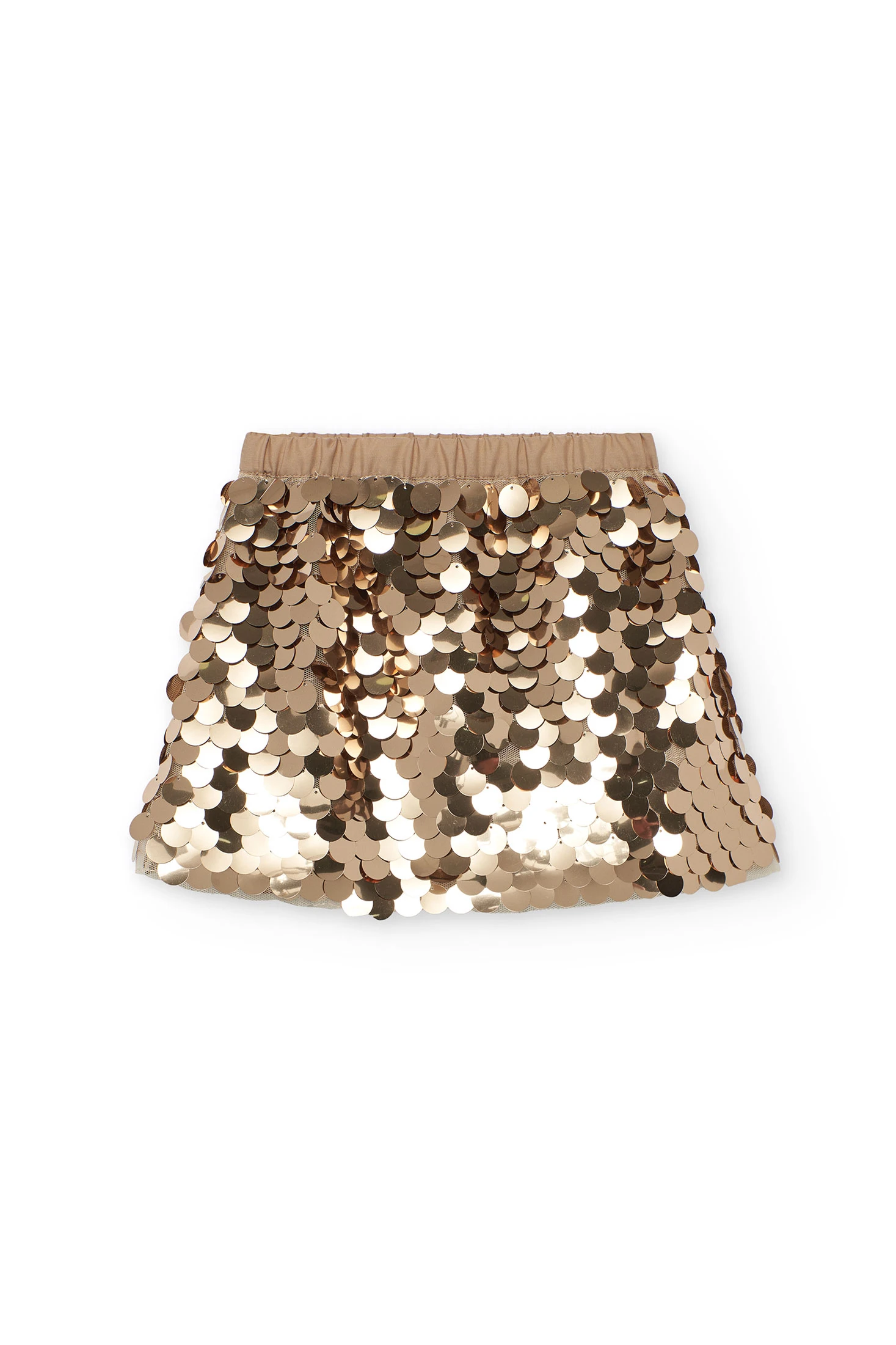 Saia de lantejoulas douradas, desenhada para meninas, perfeita para qualquer estação do ano. Destaca pelo seu conforto e estilo moderno, ideal para combinar com camisetas ou blusas para um look versátil. Disponível em tamanhos desde 2 até 14 anos, adapta-se a diferentes contextos, desde uma saída casual até ocasiões mais especiais. O design incorpora uma cintura elástica para um ajuste mais confortável e seguro.