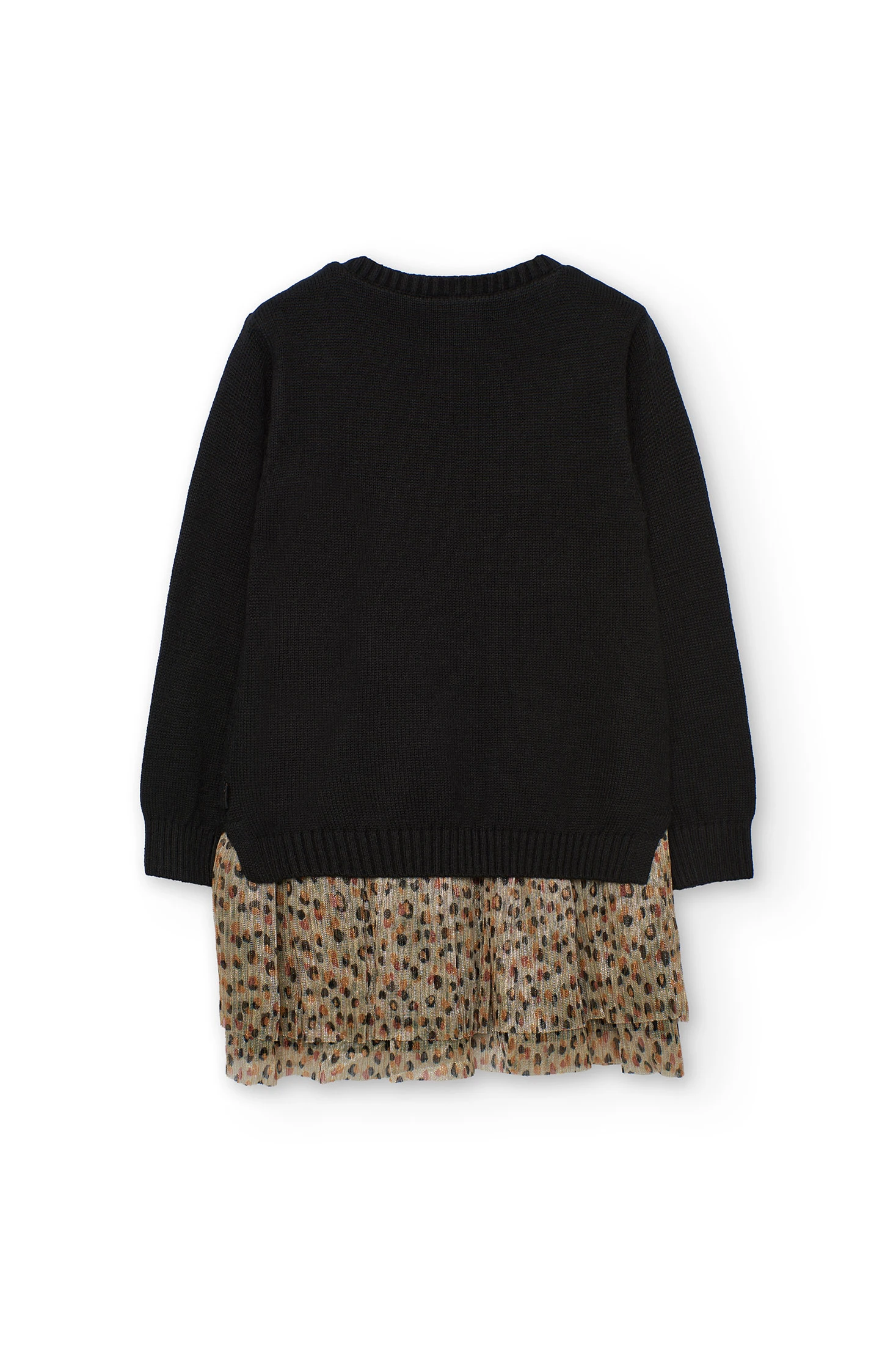 Vestido preto com estampa de leopardo, ideal para meninas durante as temporadas de outono e inverno, garante calor e estilo. Confeccionado num tecido suave, apresenta um elegante design floral em tons castanhos e bege na parte inferior, conferindo um toque distinto. Gola redonda e mangas compridas tornam-no perfeito para os dias frios, disponível em tamanhos dos 2 aos 14 anos. Combine-o com collants simples para conseguir um look versátil e confortável em qualquer ocasião.